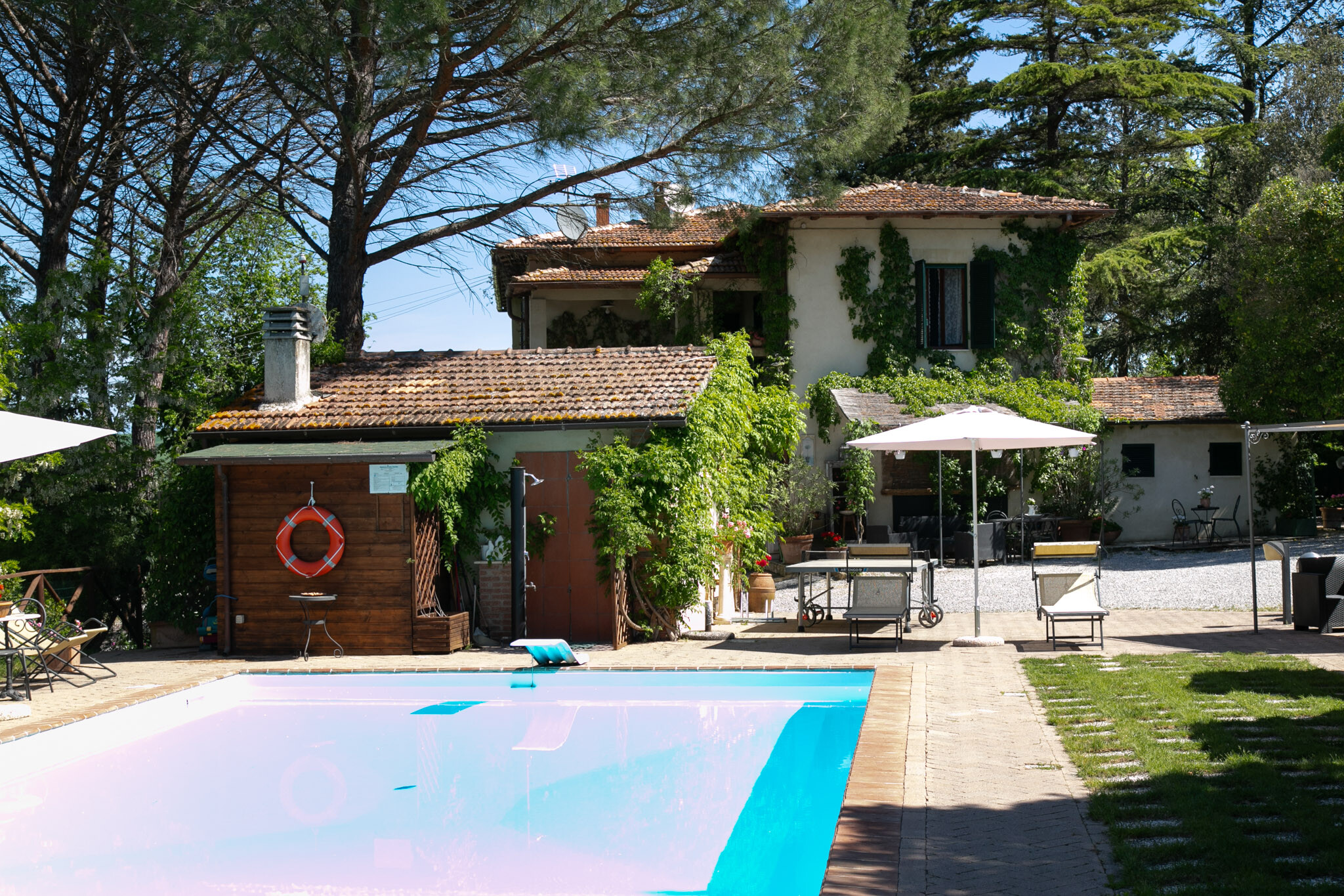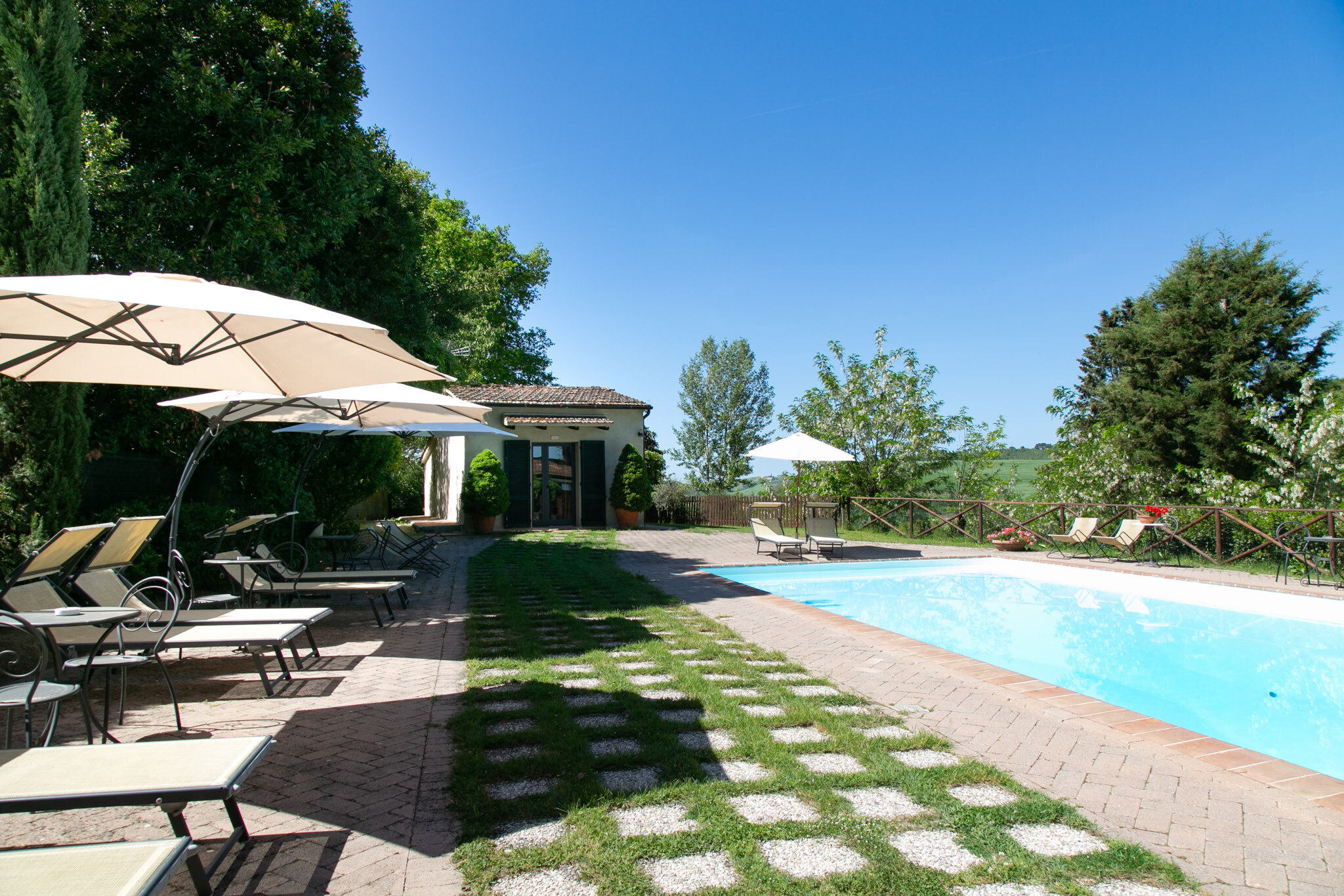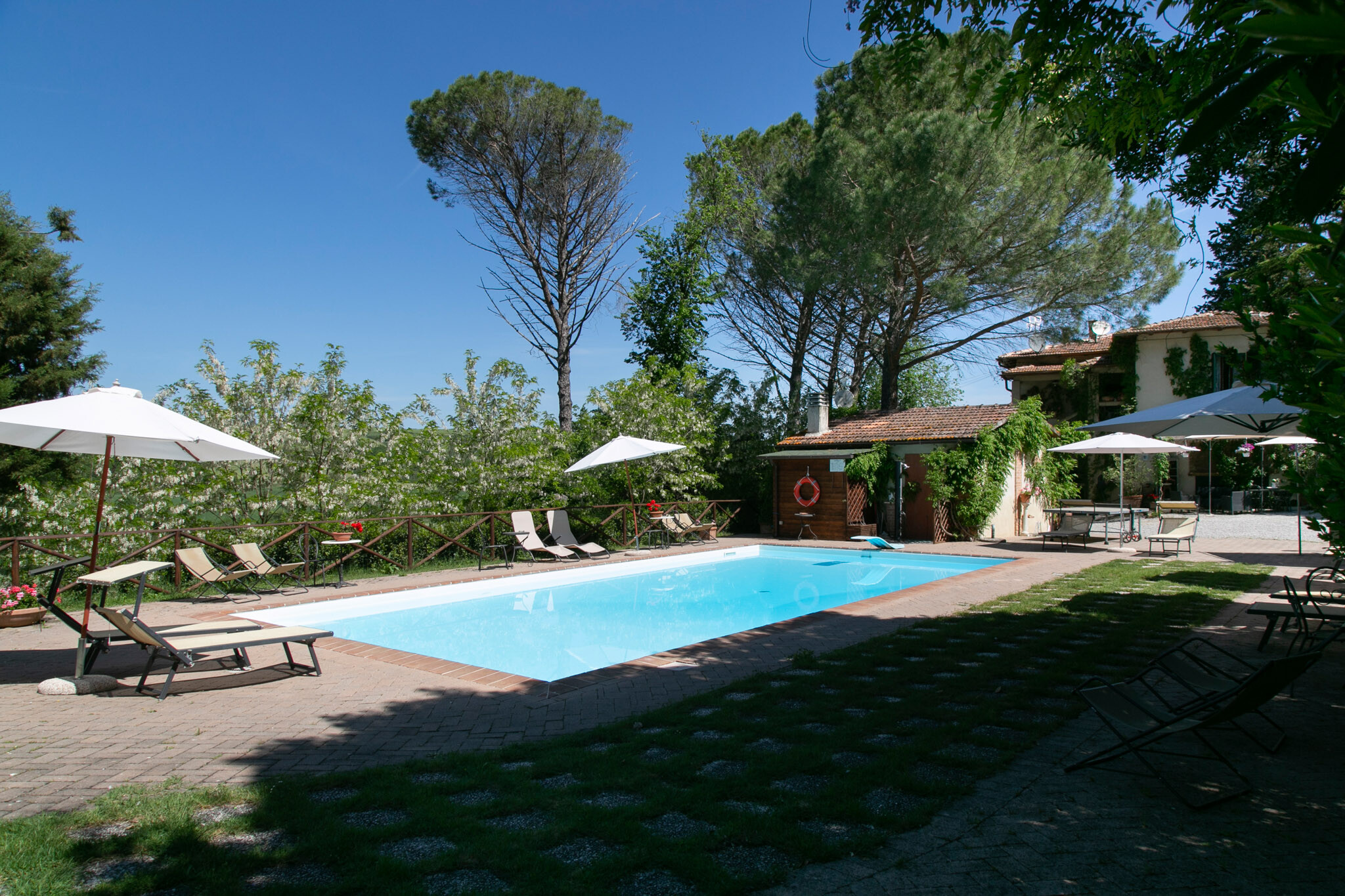 Outside, the park wraps around the property, offering an oasis of tranquility and a beautiful swimming pool, ideal for cooling off during hot summer days and enjoying the stunning views of the Crete Toscane.