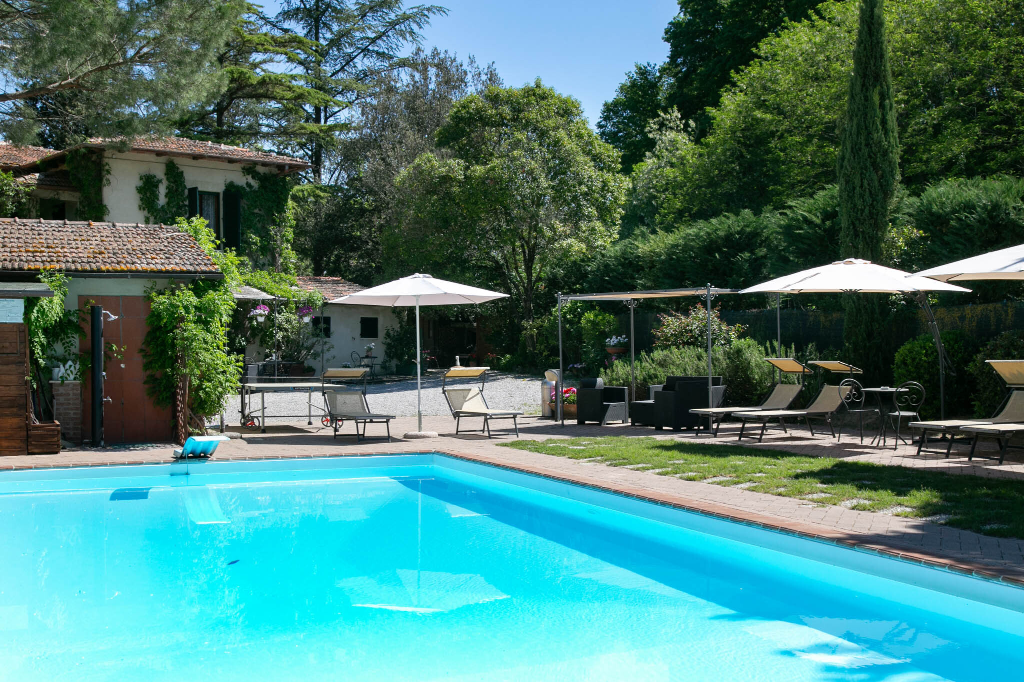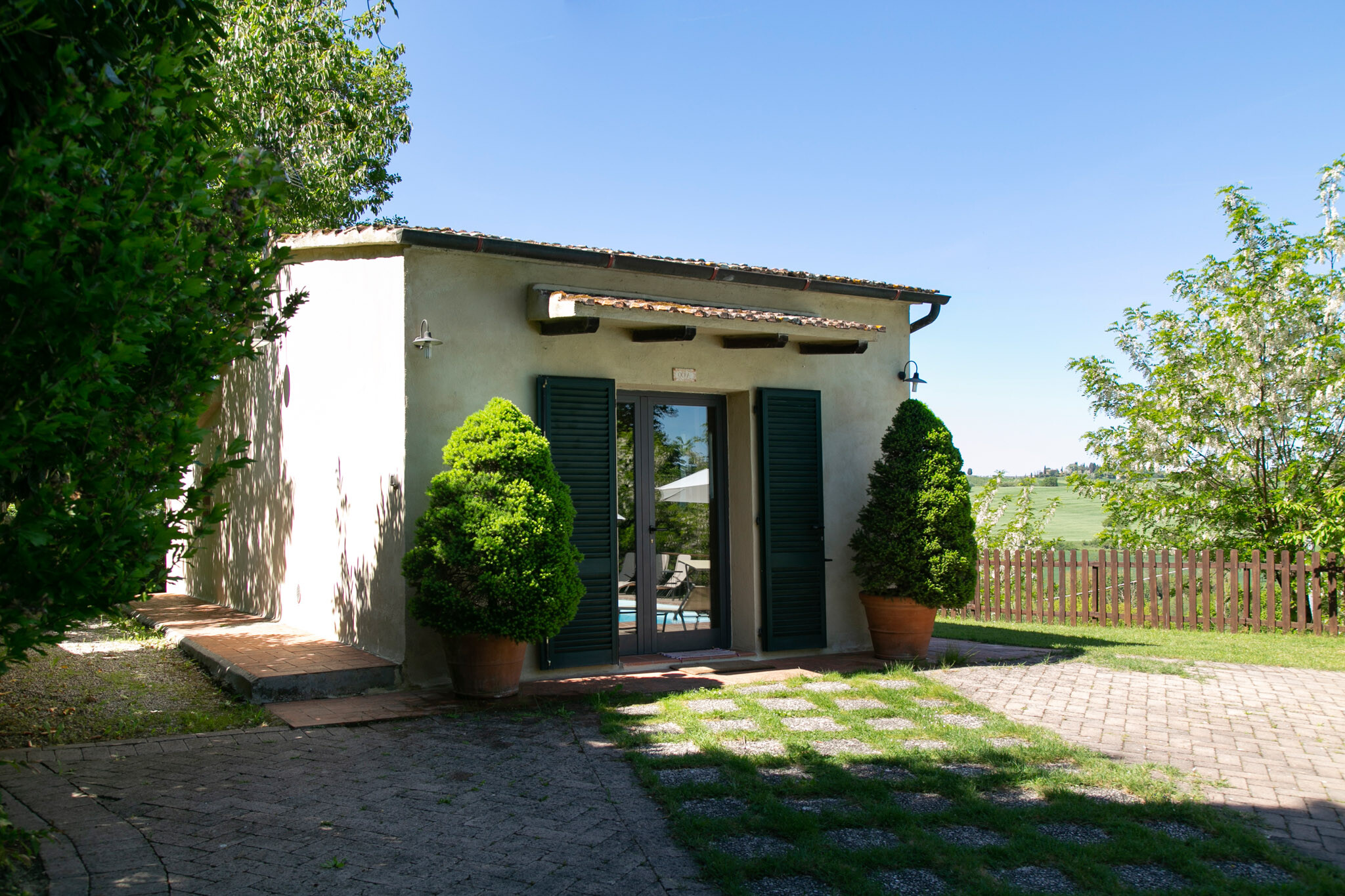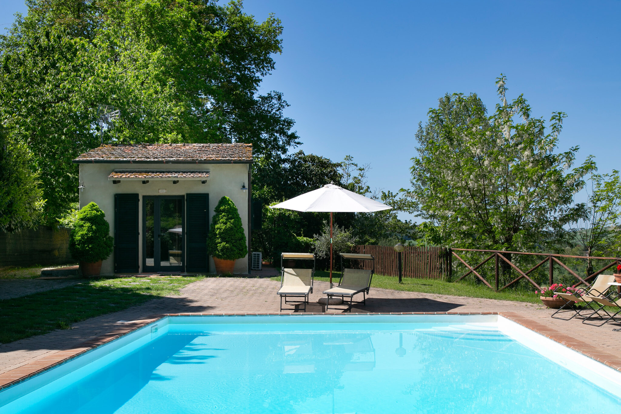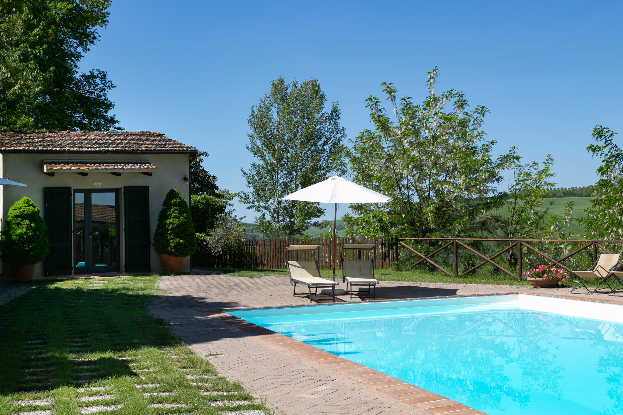 Outside, the park wraps around the property, offering an oasis of tranquility and a beautiful swimming pool, ideal for cooling off during hot summer days and enjoying the stunning views of the Crete Toscane.