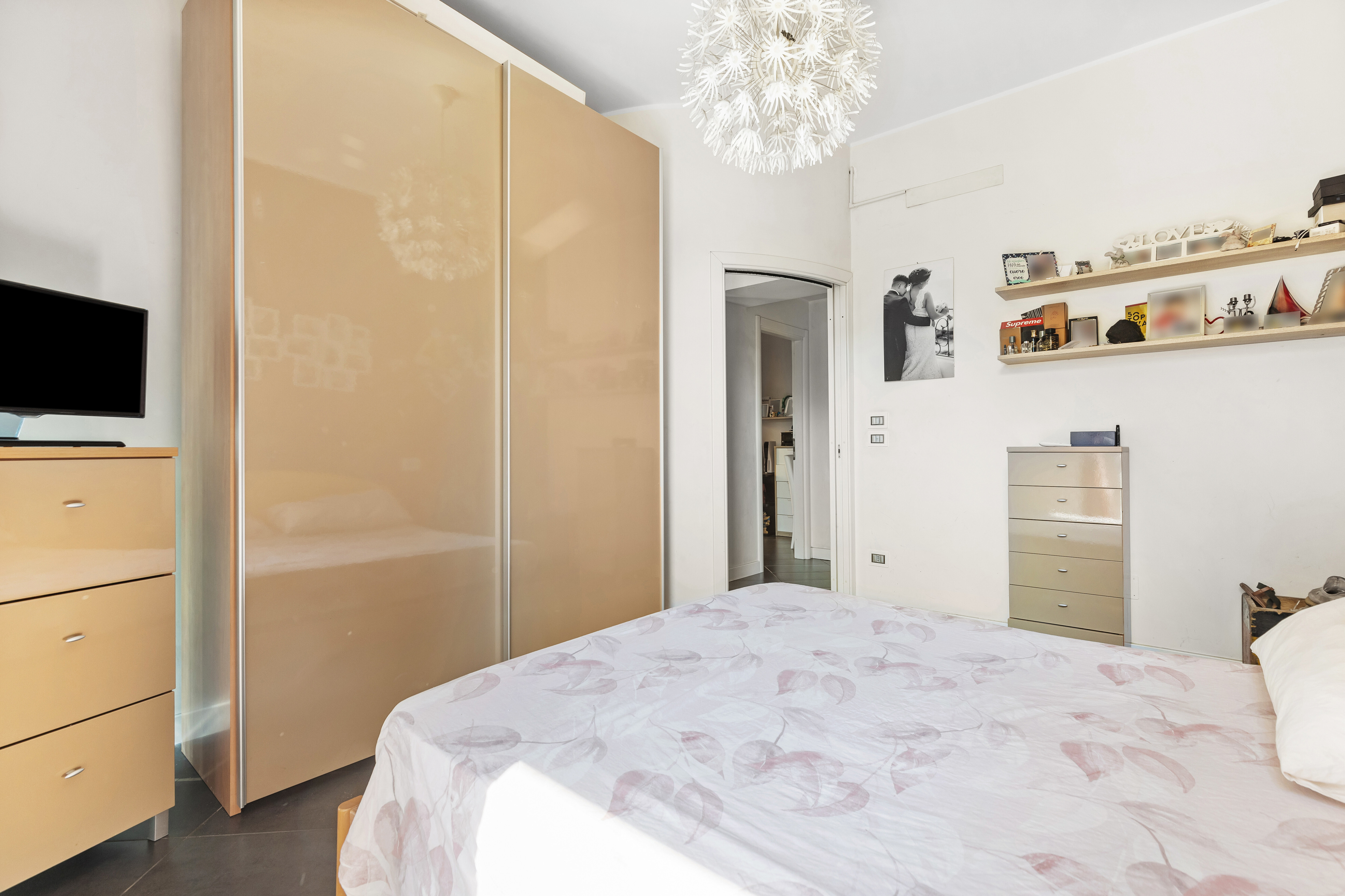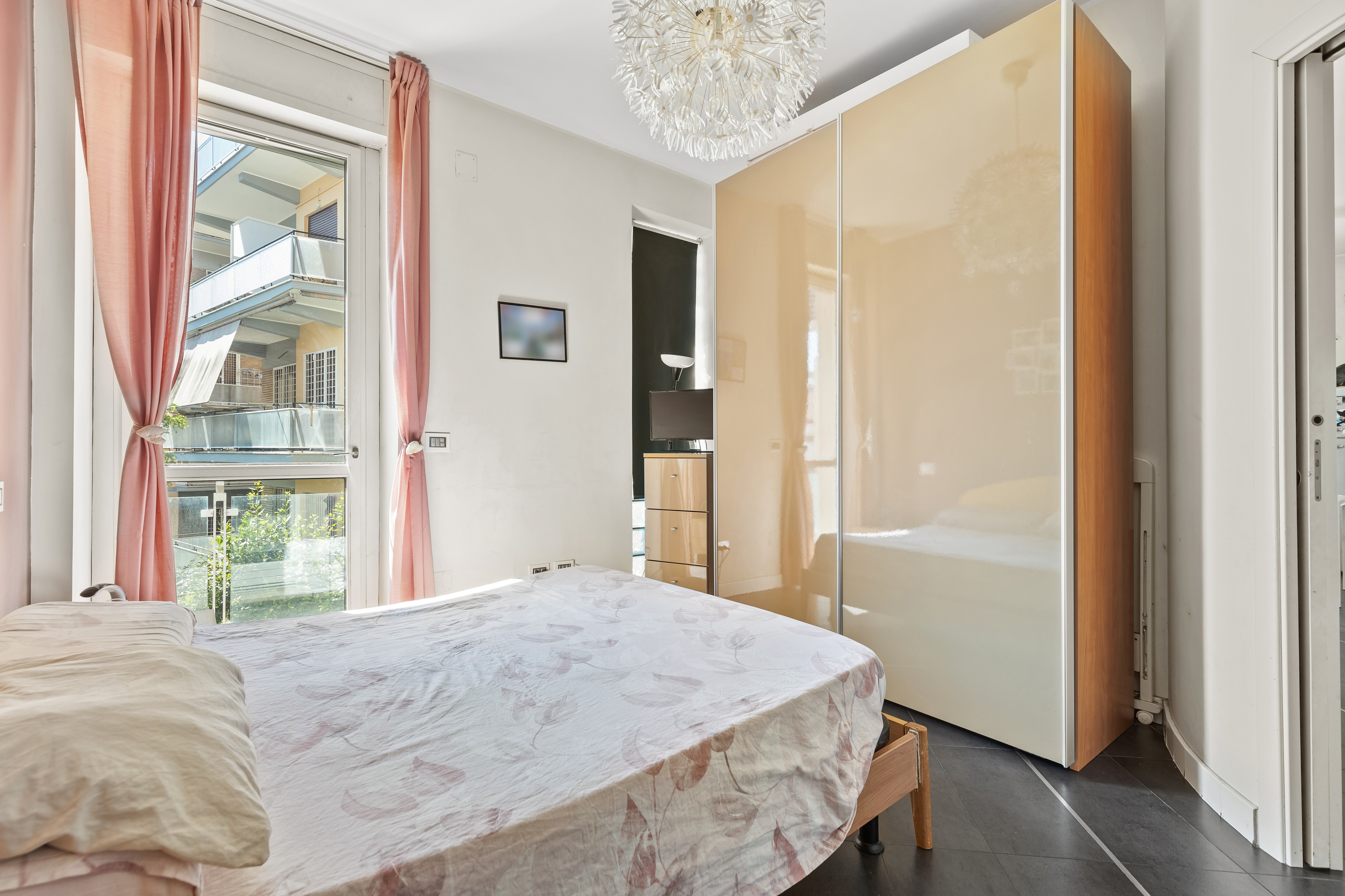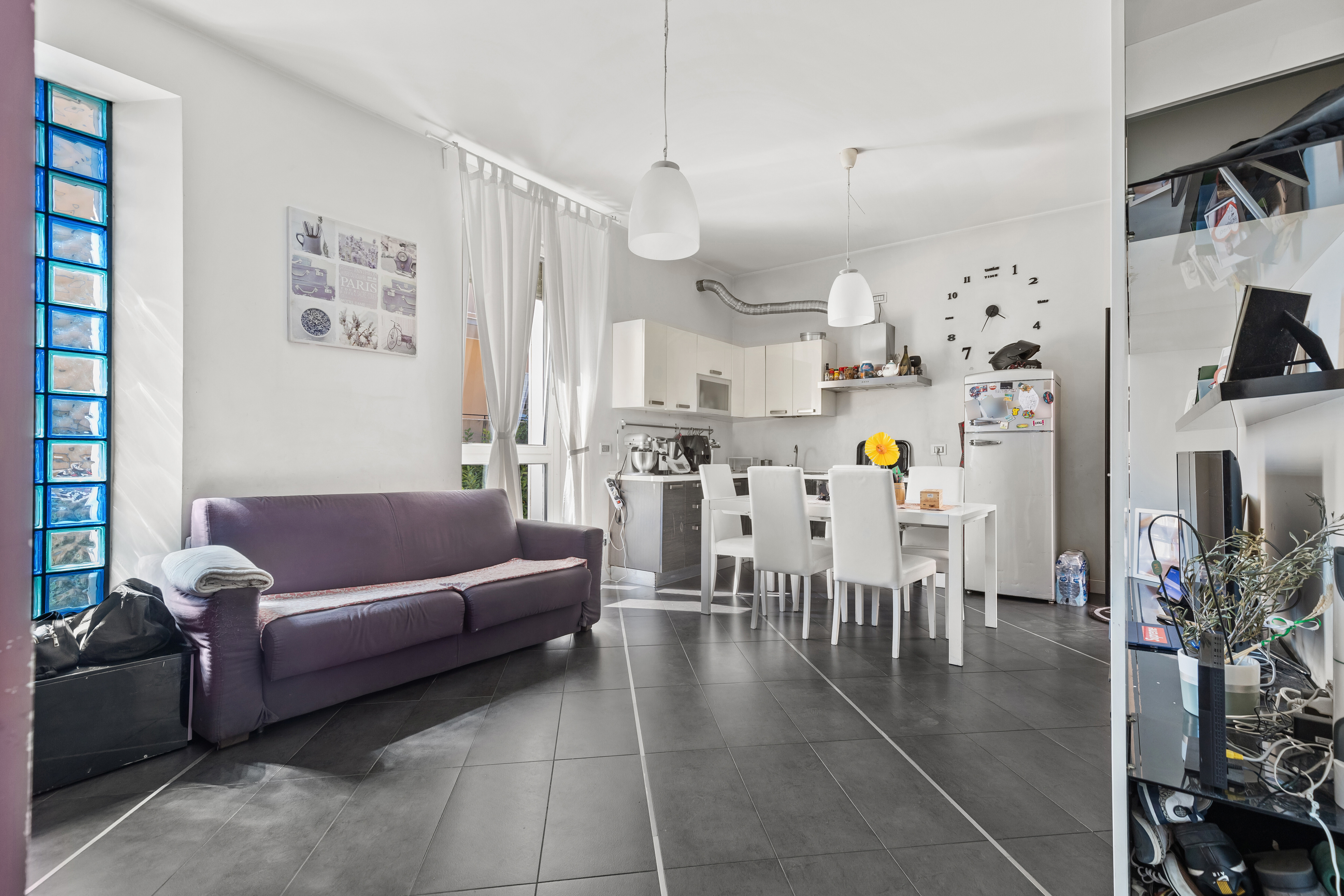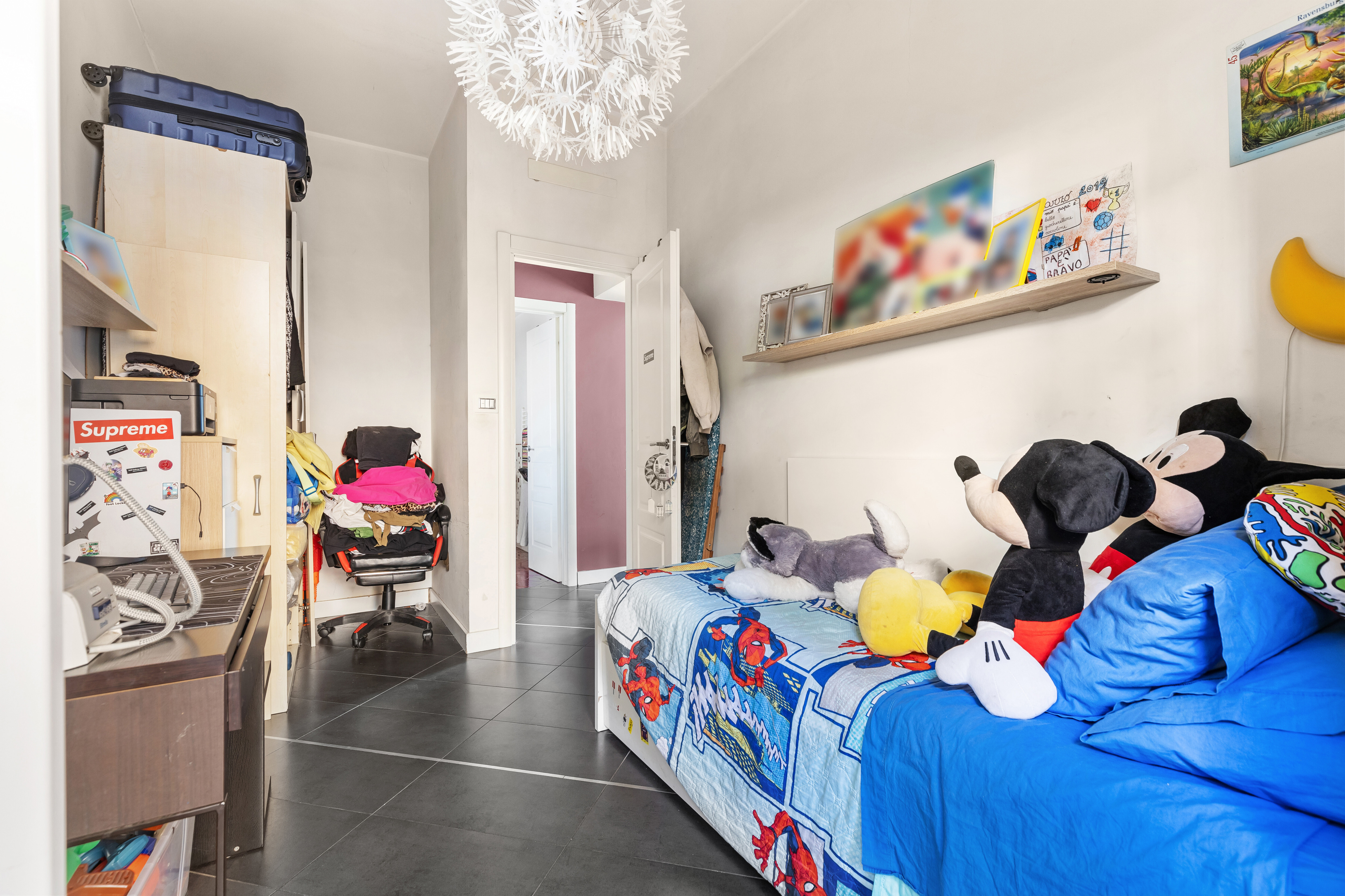 Dall'ingresso principale, che affaccia direttamente sullo spazio esterno, si accede a un luminoso soggiorno con cucina a vista. La zona notte è composta da una camera matrimoniale con balcone, una cameretta e un servizio.