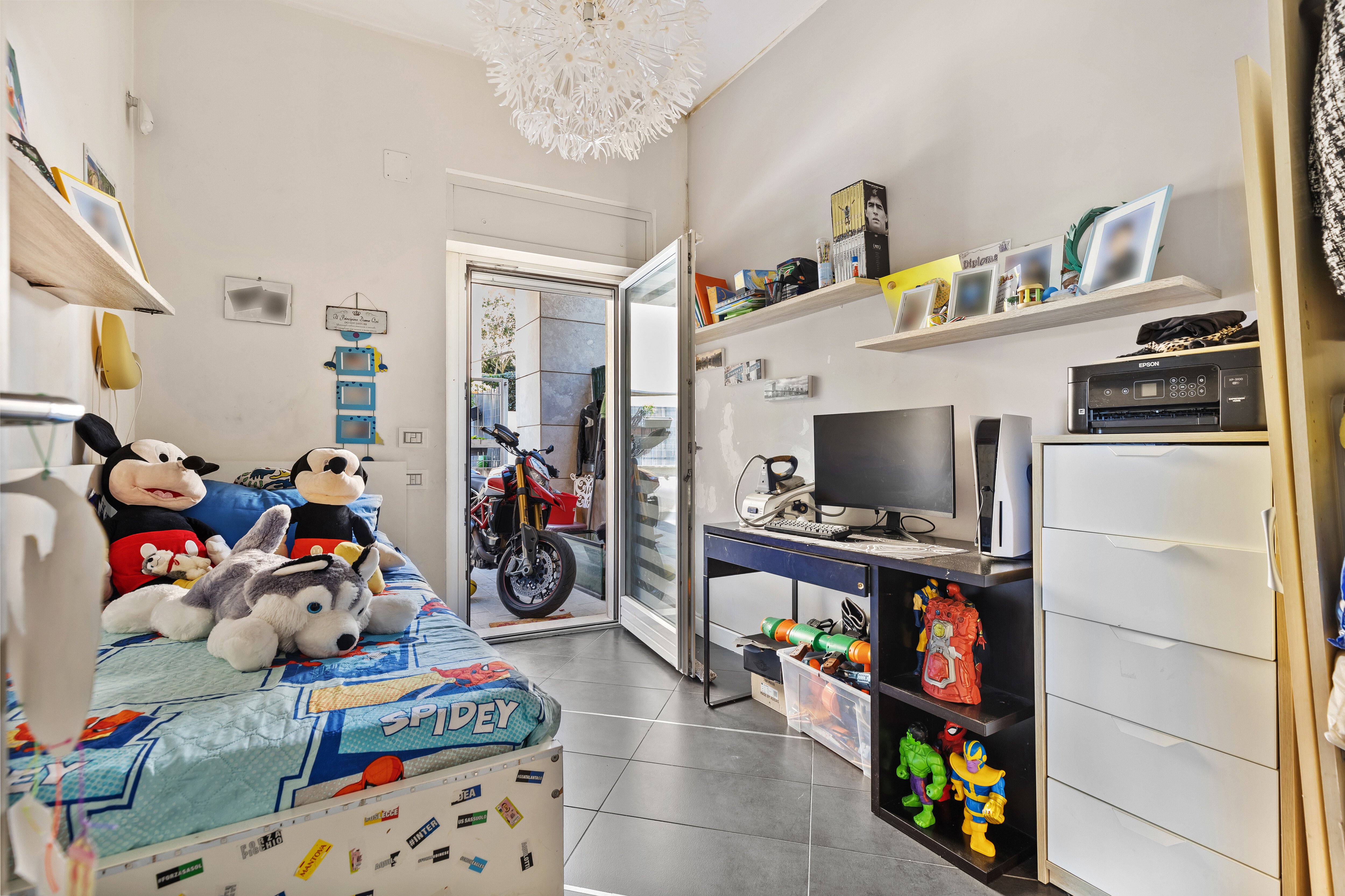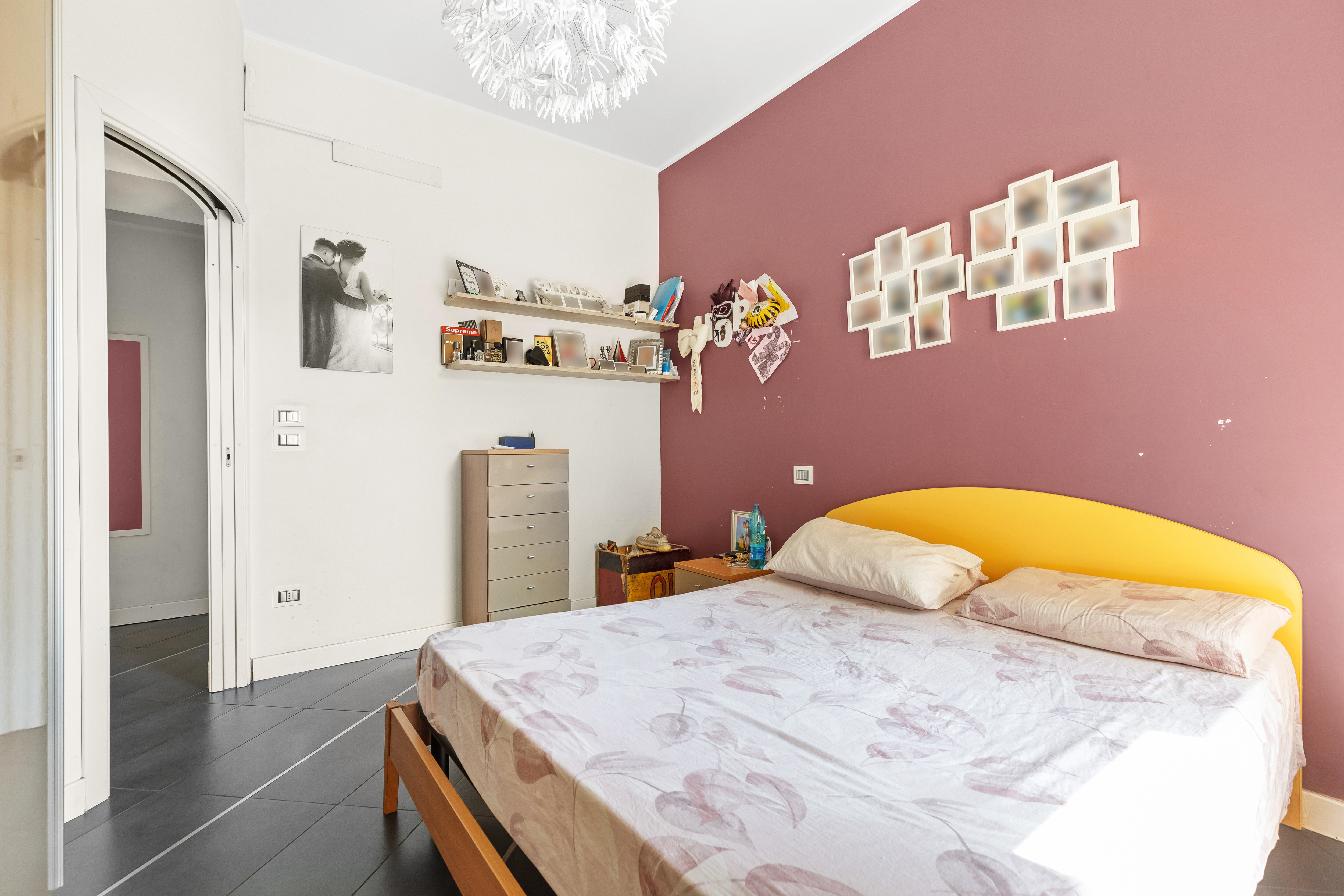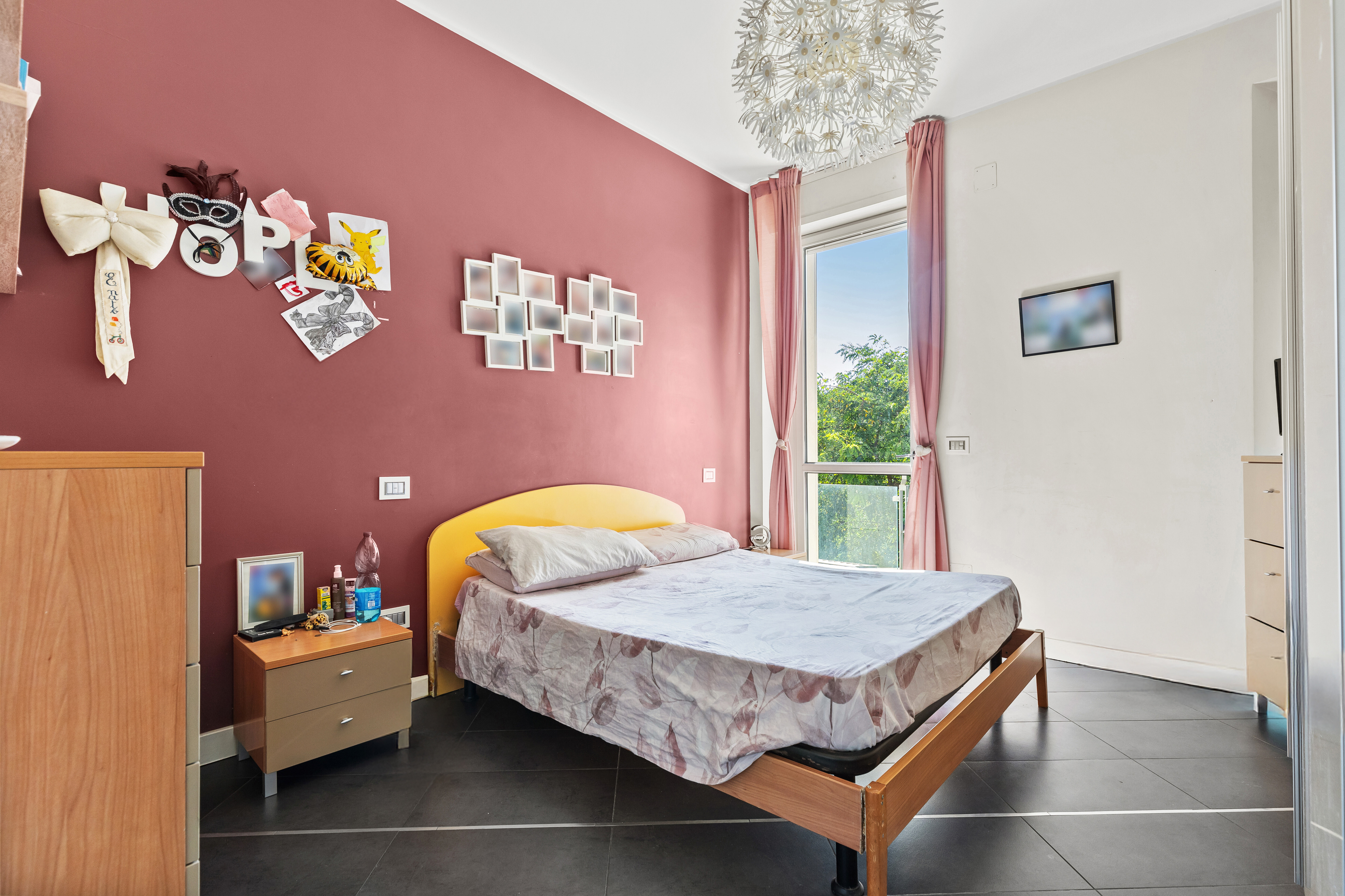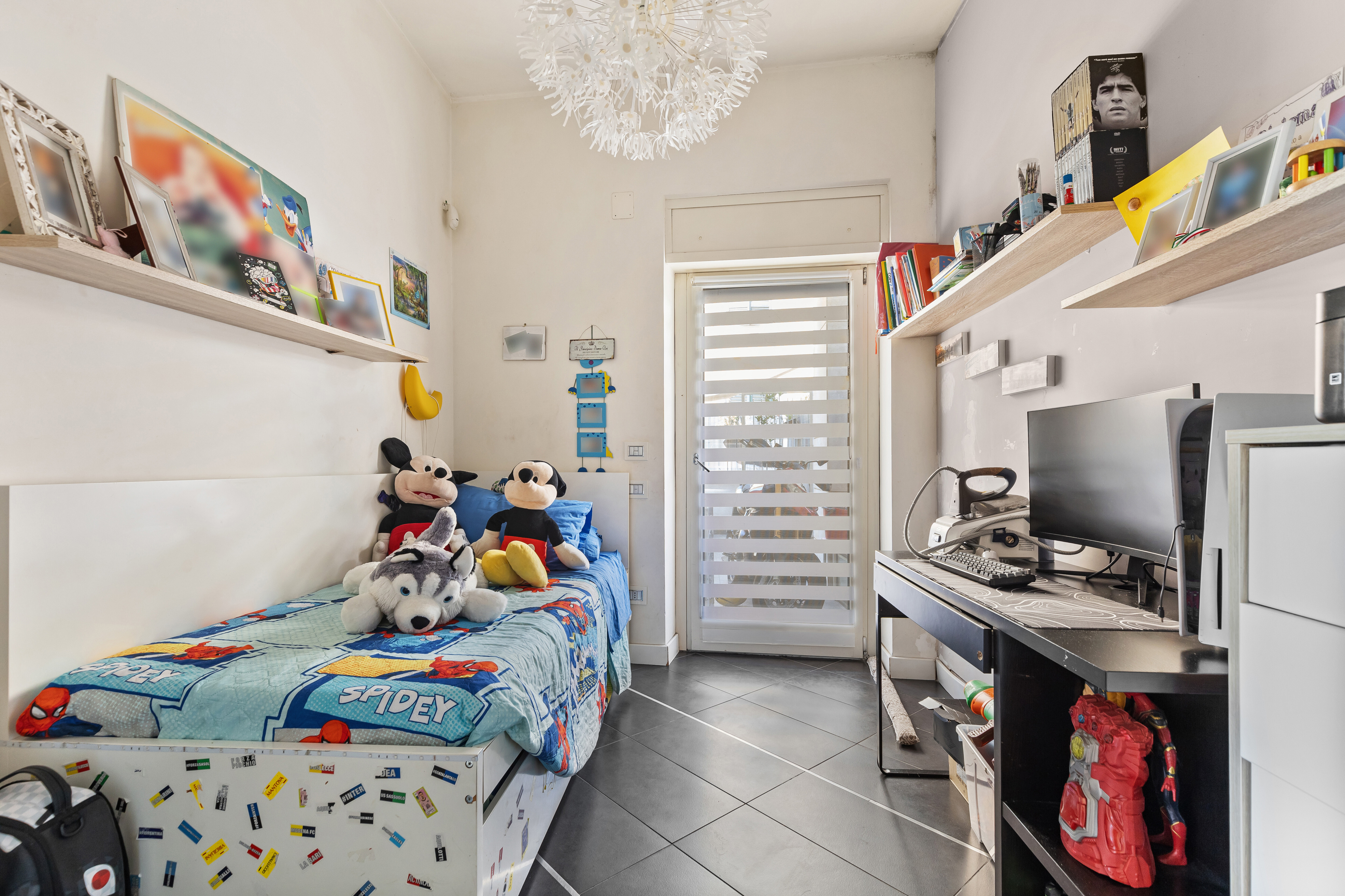 Dall'ingresso principale, che affaccia direttamente sullo spazio esterno, si accede a un luminoso soggiorno con cucina a vista. La zona notte è composta da una camera matrimoniale con balcone, una cameretta e un servizio.