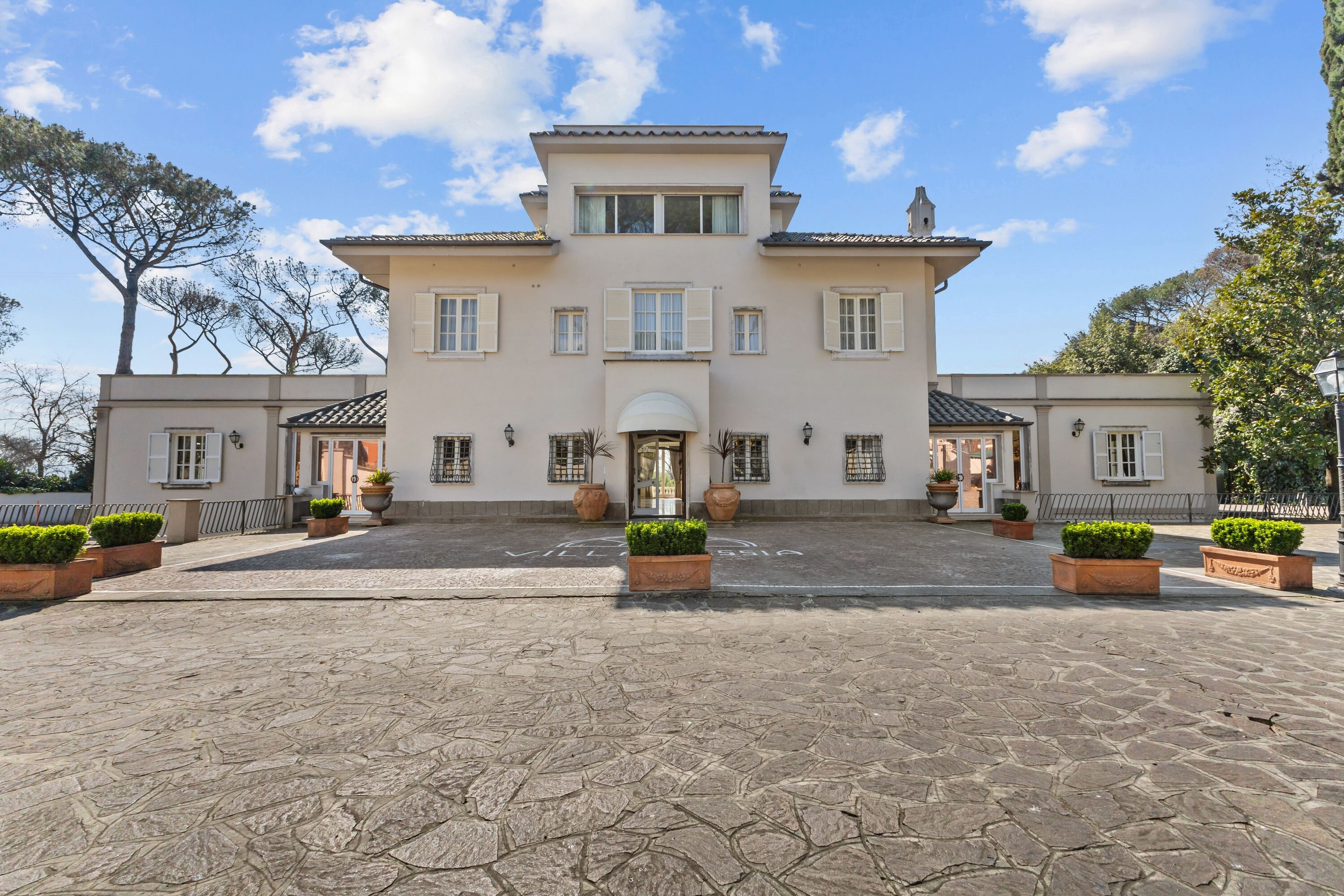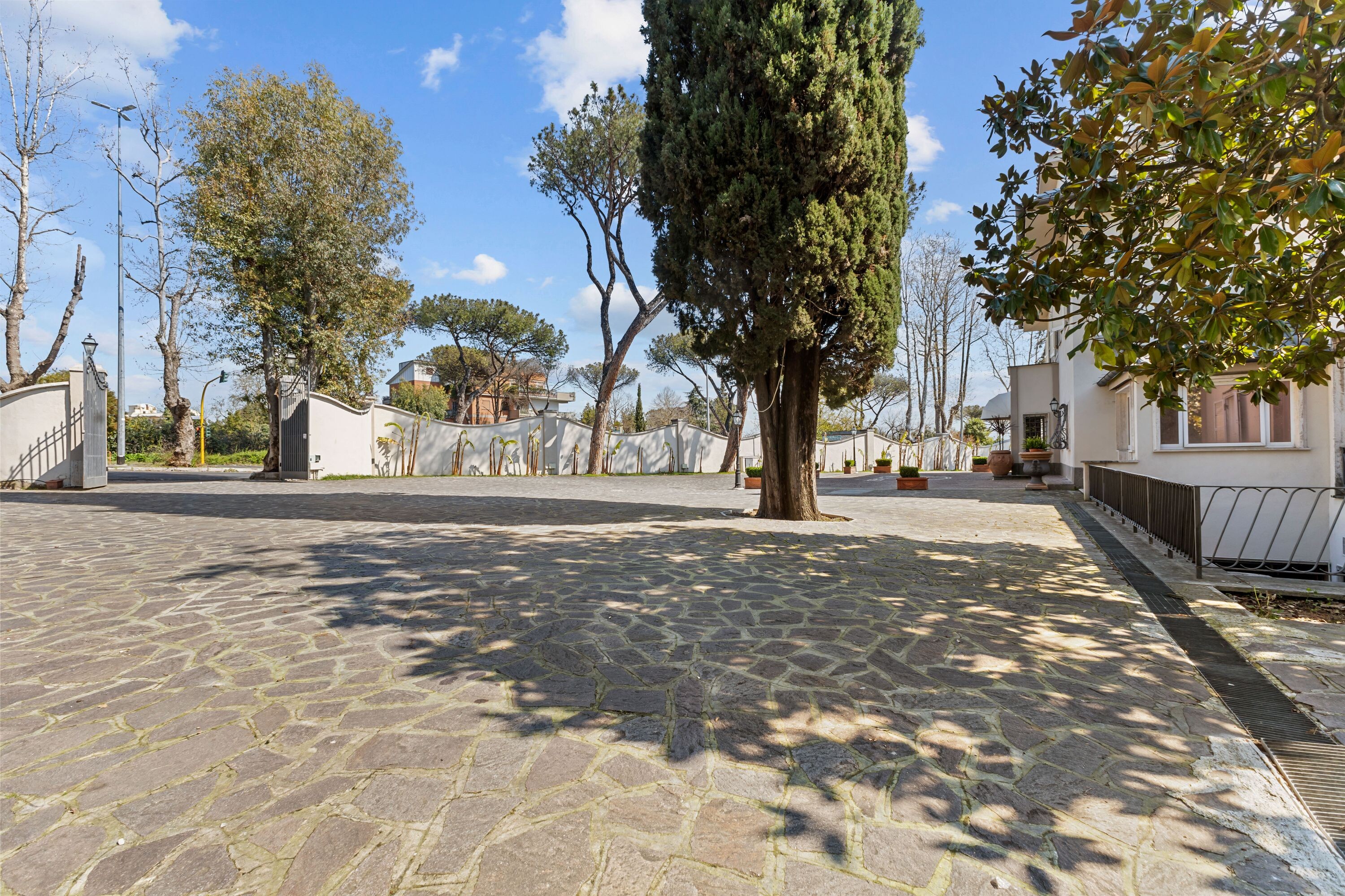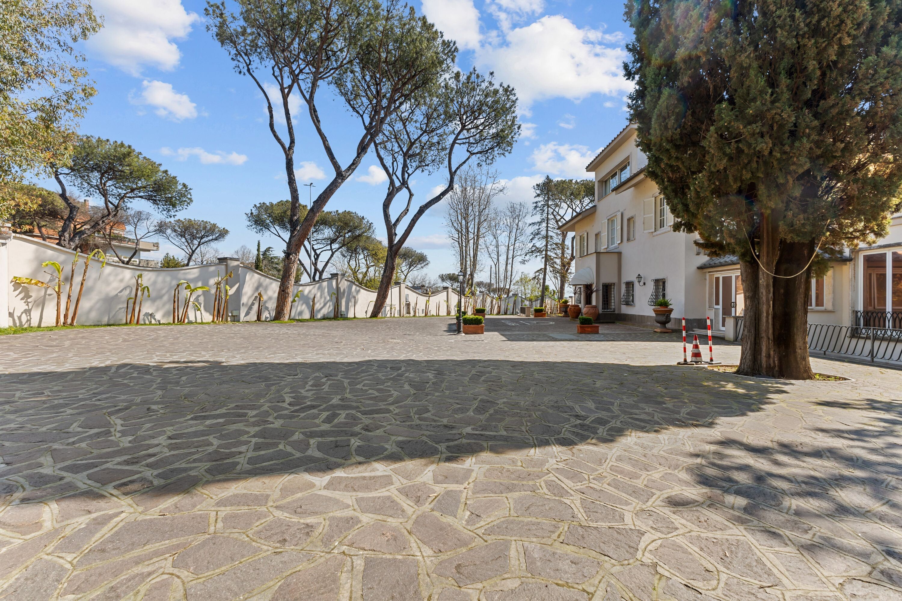 La villa dispone di un ampio parcheggio e di due ingressi principali direttamente da Via Cassia, oltre a un terzo ingresso riservato dal giardino, assicurando praticità, flessibilità e massima riservatezza.