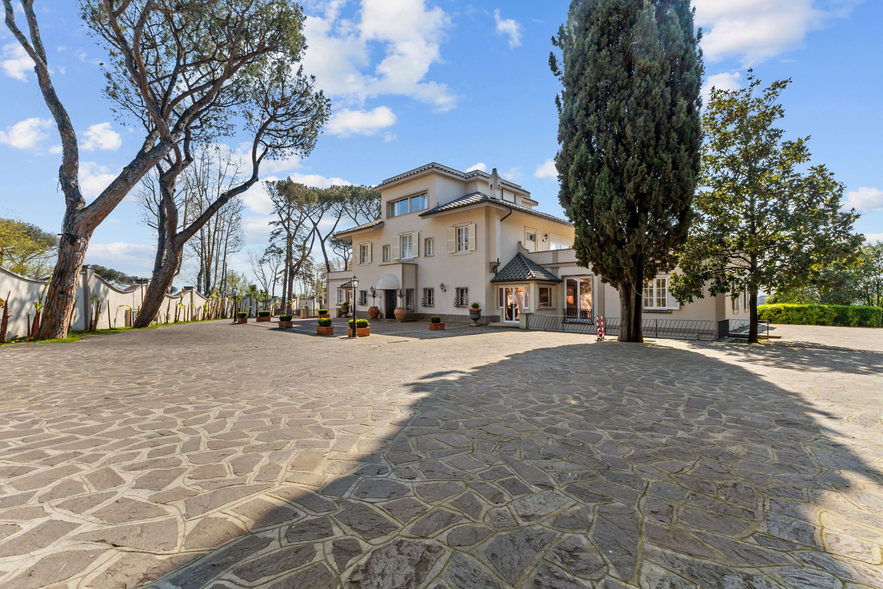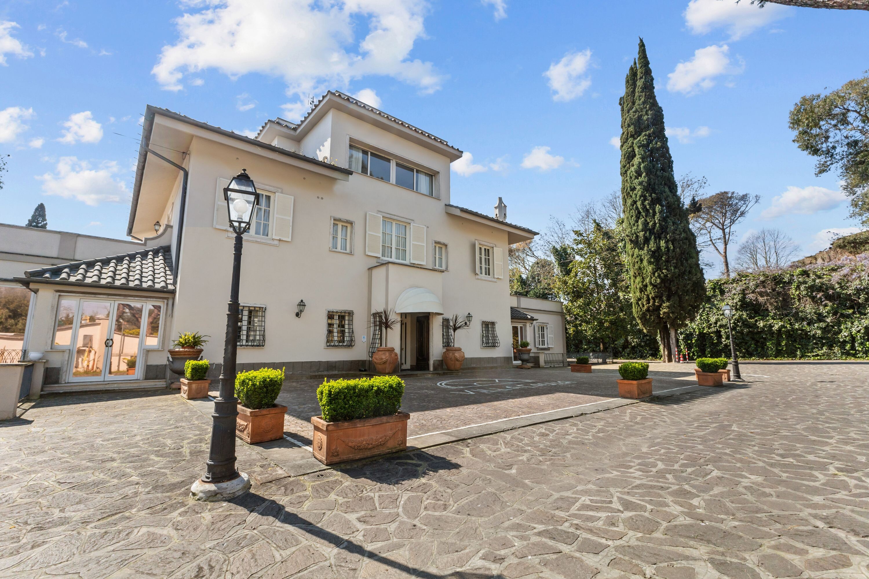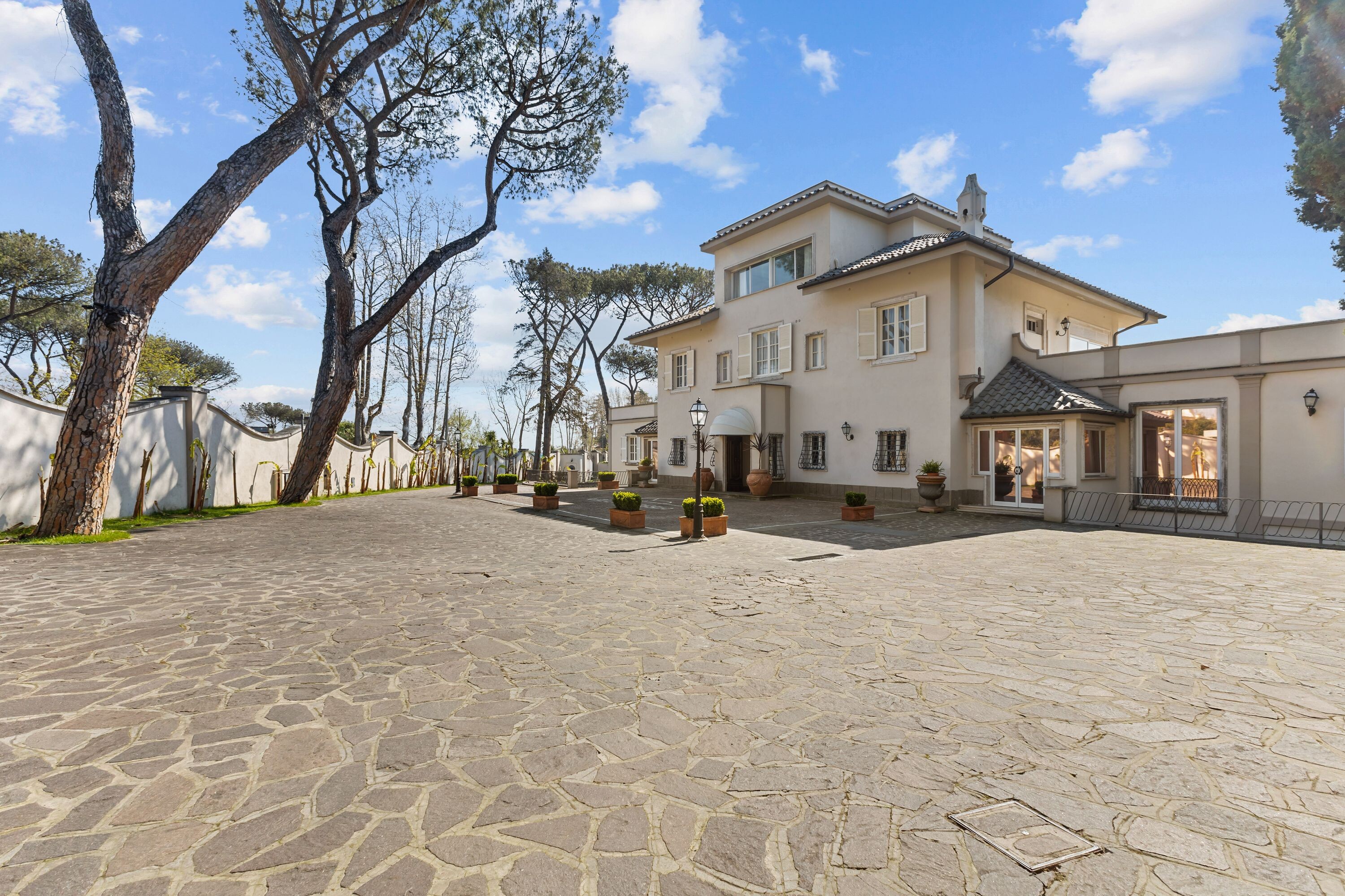 La villa dispone di un ampio parcheggio e di due ingressi principali direttamente da Via Cassia, oltre a un terzo ingresso riservato dal giardino, assicurando praticità, flessibilità e massima riservatezza.