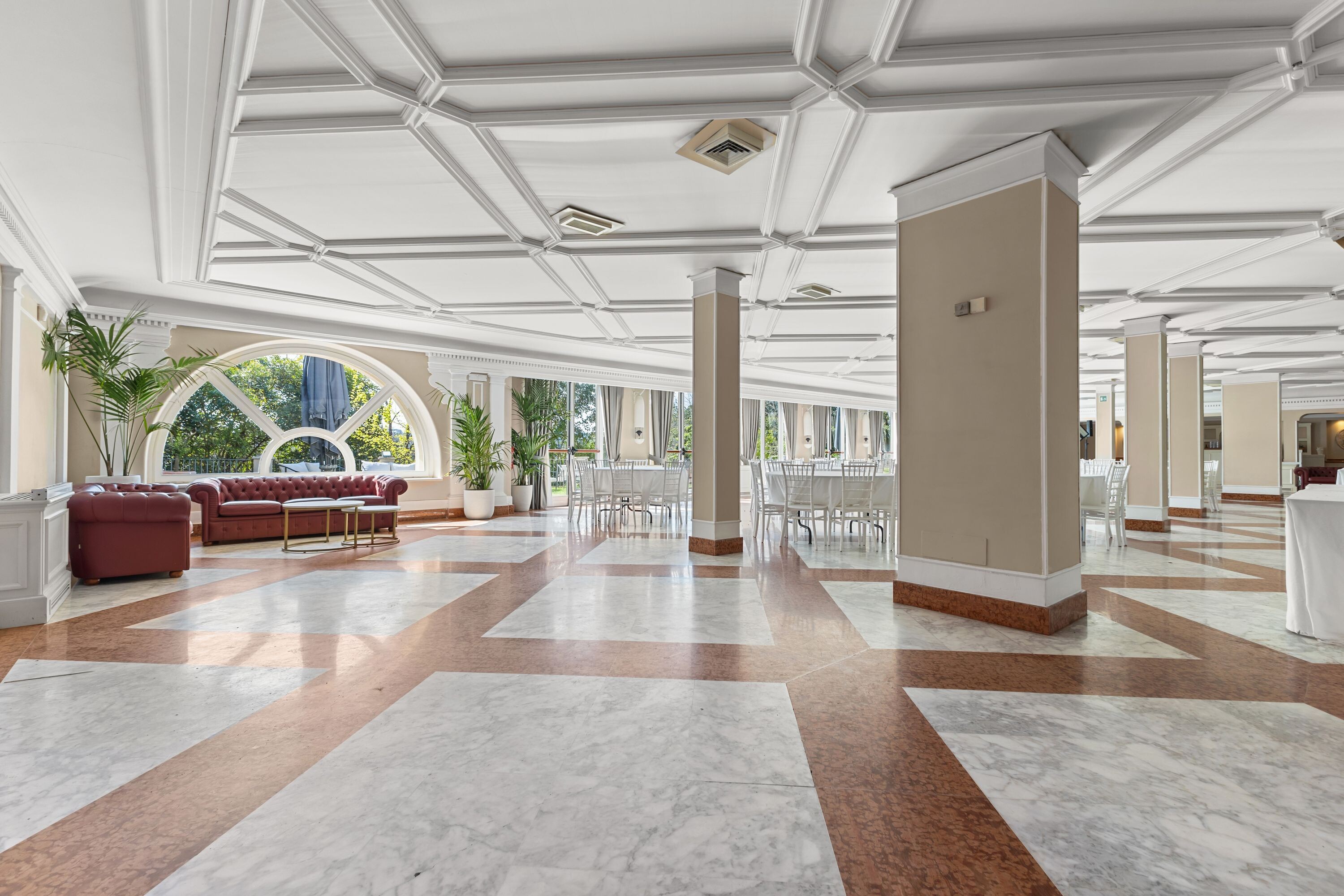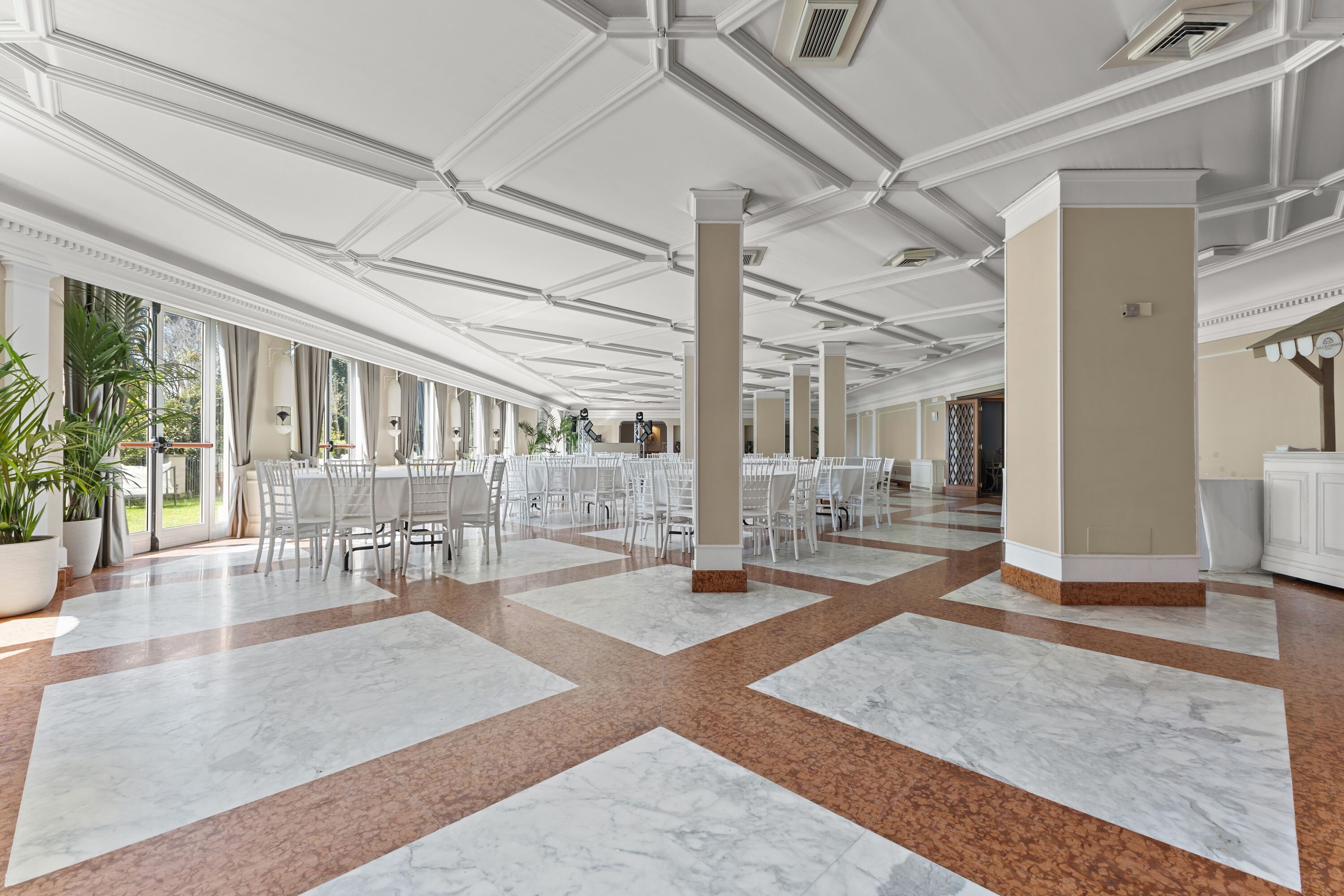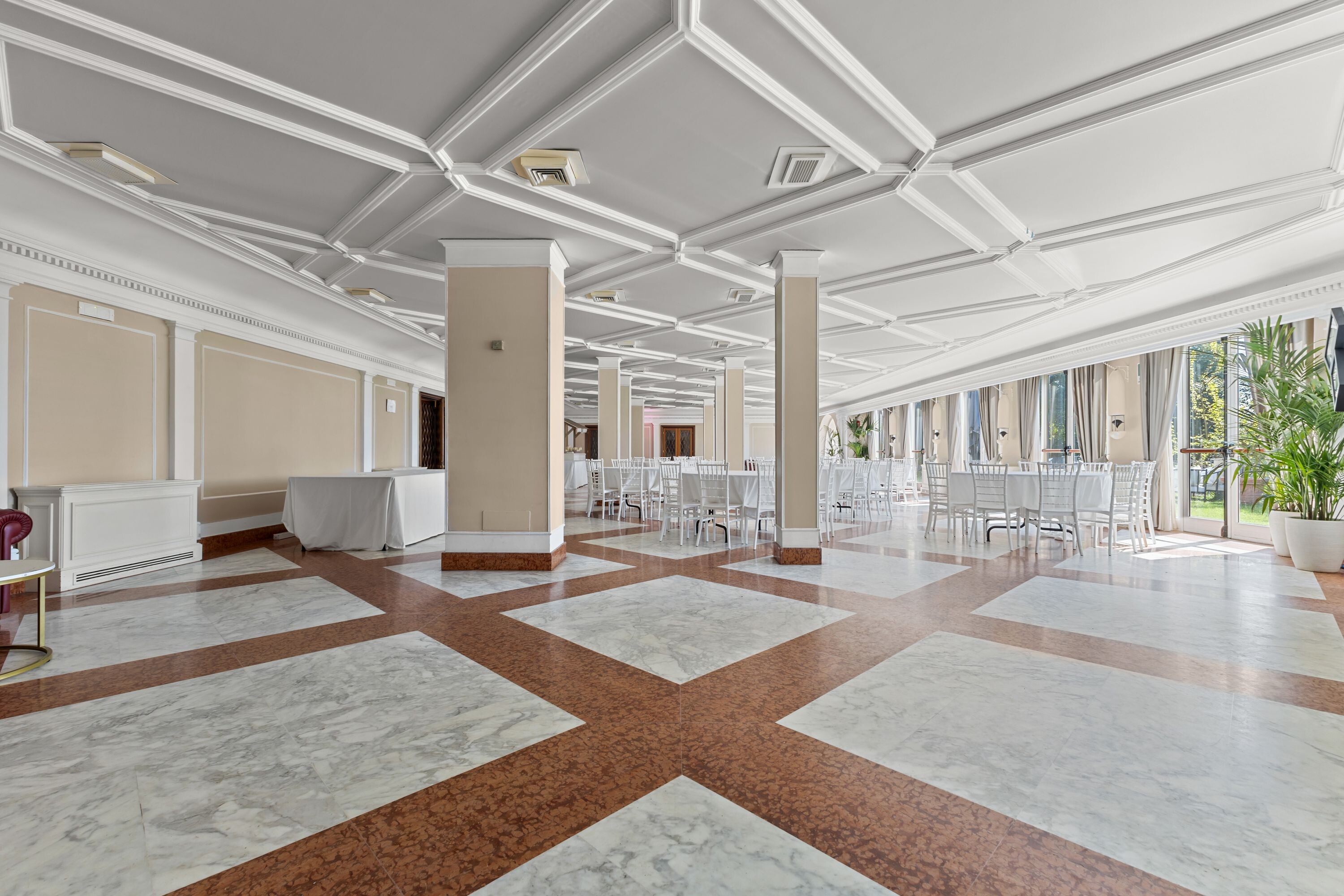 Gli ambienti interni, inondati di luce naturale, si prestano idealmente a cene di rappresentanza, cocktail, meeting ed eventi culturali, creando una raffinata continuità tra interno ed esterno.