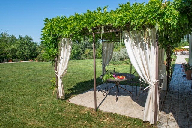 Intorno alla villa il giardino molto curato e recintato, di circa un ettaro con al suo interno una grande piscina 11mX6m, una vasca idromassaggio oltre a dei gazebi dove sono servite le cene e le colazioni allietate dal soffio della brezza che rinfresca le calure estive, in considerazione della posizione dominante.