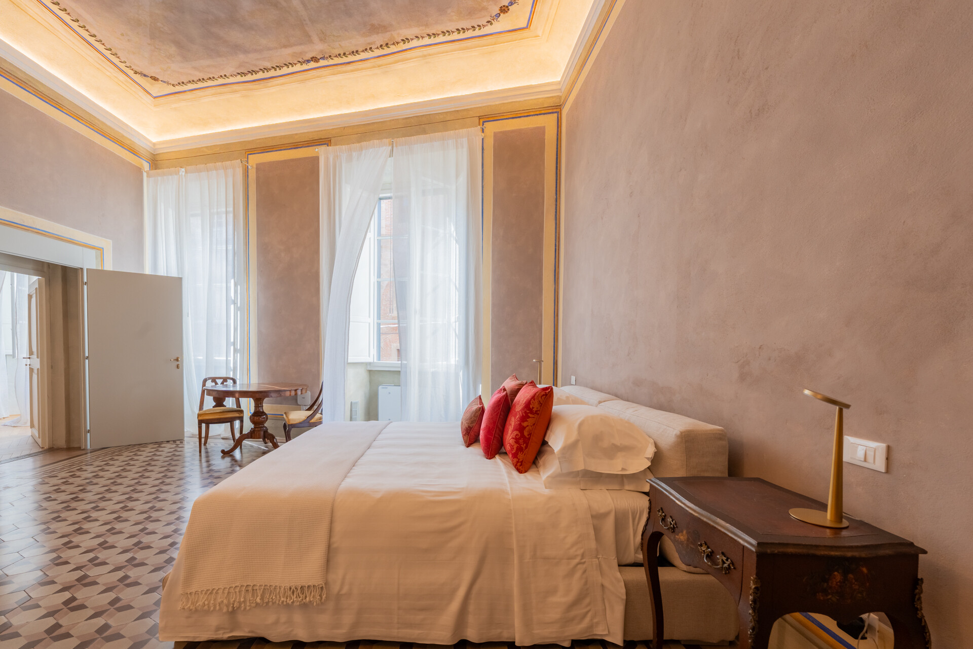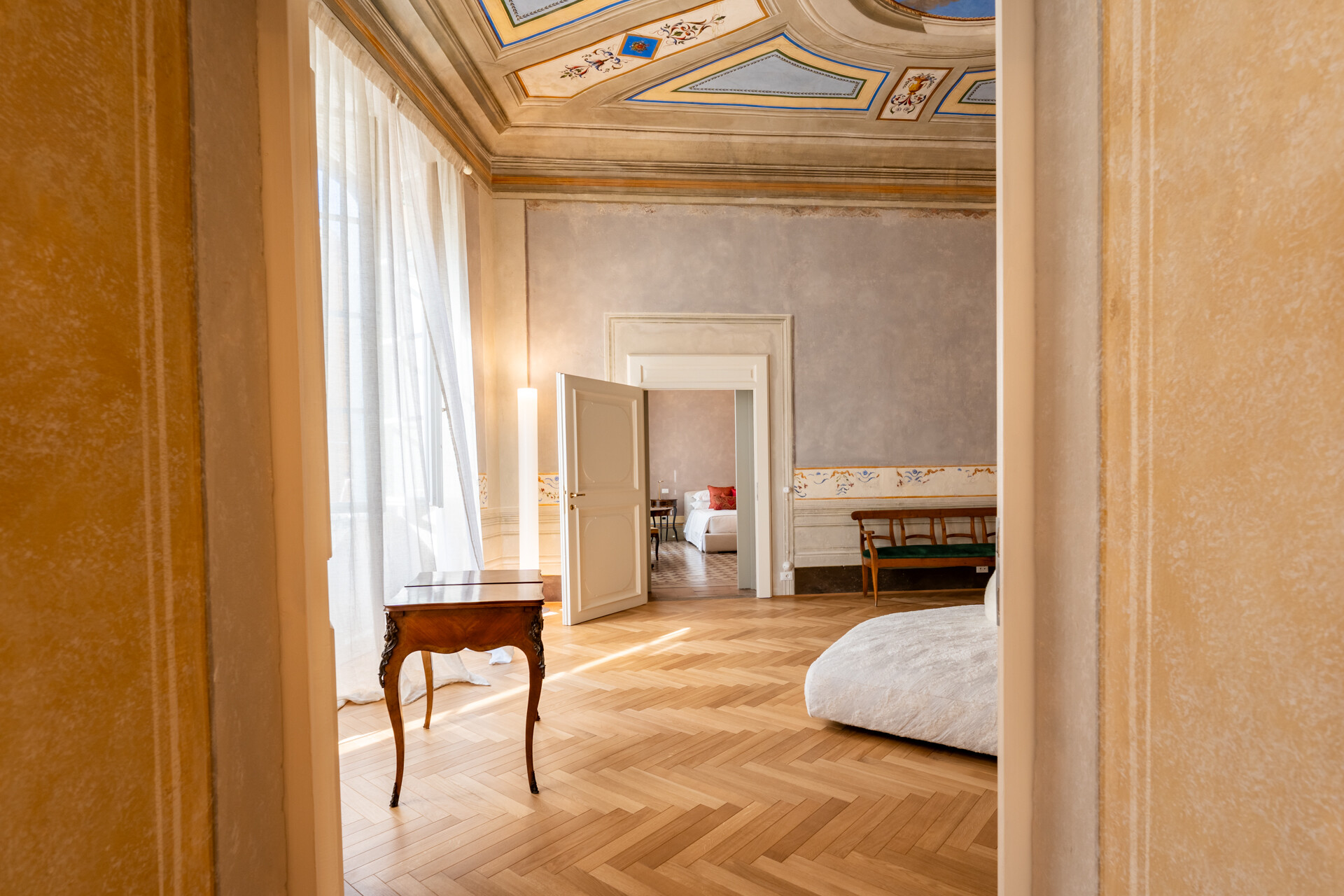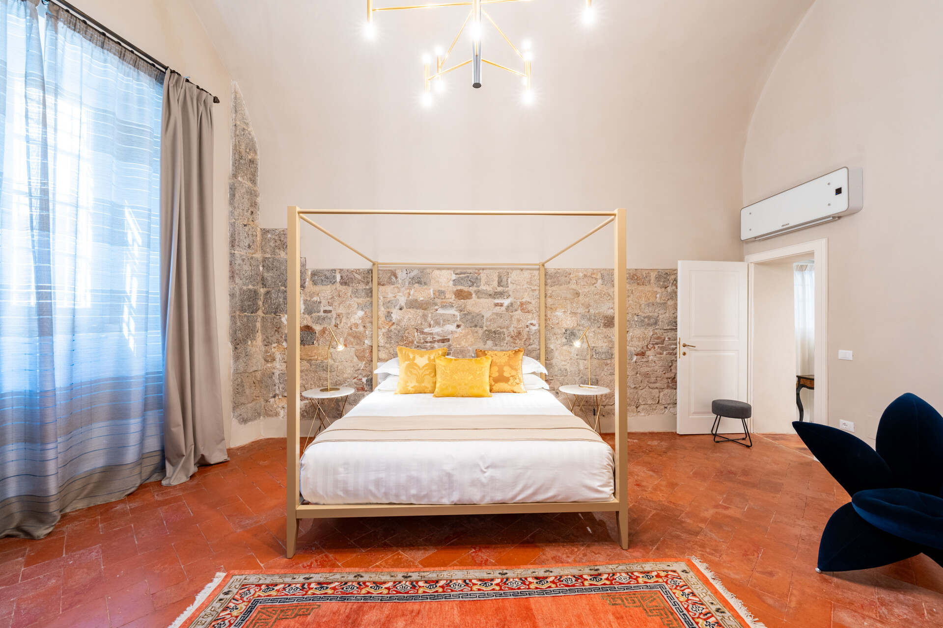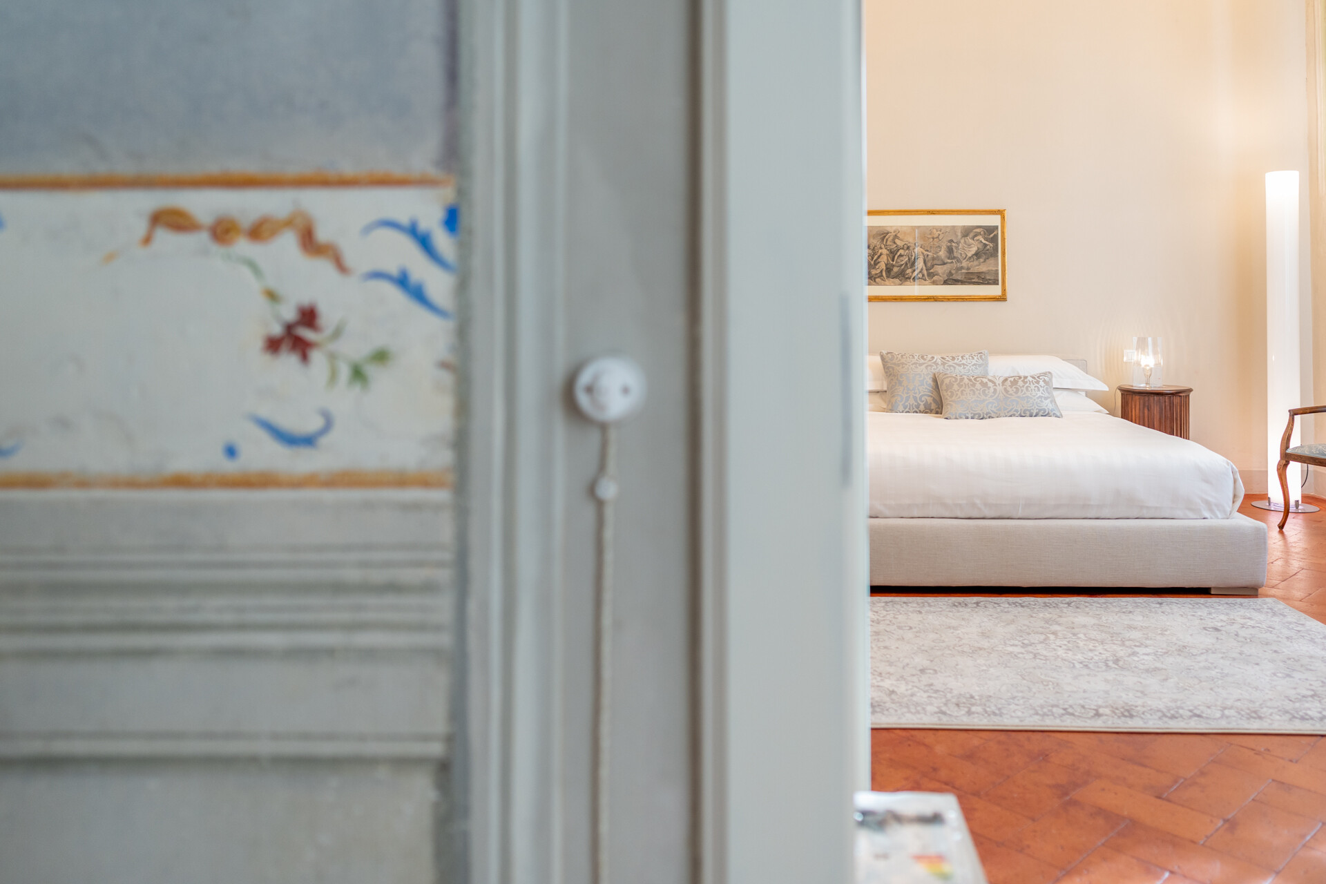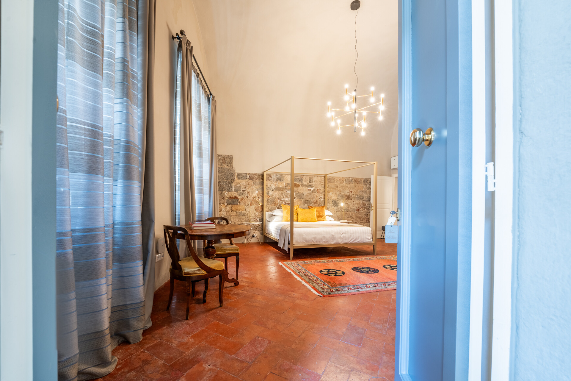 Questo palazzo nobiliare gode di doppia esposizione e ospita oggi sei ampie suite, restaurate con grande ricercatezza. Gli ambienti rivelano un lusso dal carattere unico, esaltato da raffinate pareti in pietra a vista e soffitti affrescati, come documentano queste immagini. Ogni suite dispone di bagno privato, dove marmi pregiati dalle delicate venature si armonizzano con finiture dorate e arredi di grande personalità. Molti spazi conservano i caratteristici camini d’epoca, mentre il cotto originale, le cementine artigianali dai motivi unici e l’elegante parquet a spina di pesce offrono una straordinaria varietà di pavimentazioni.