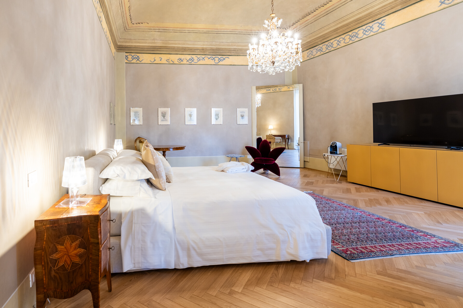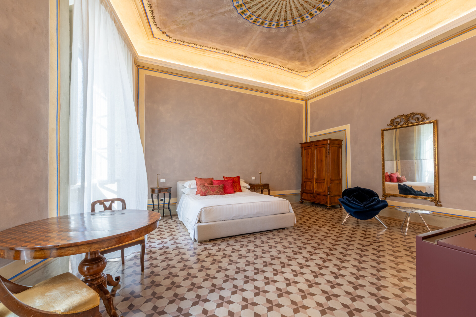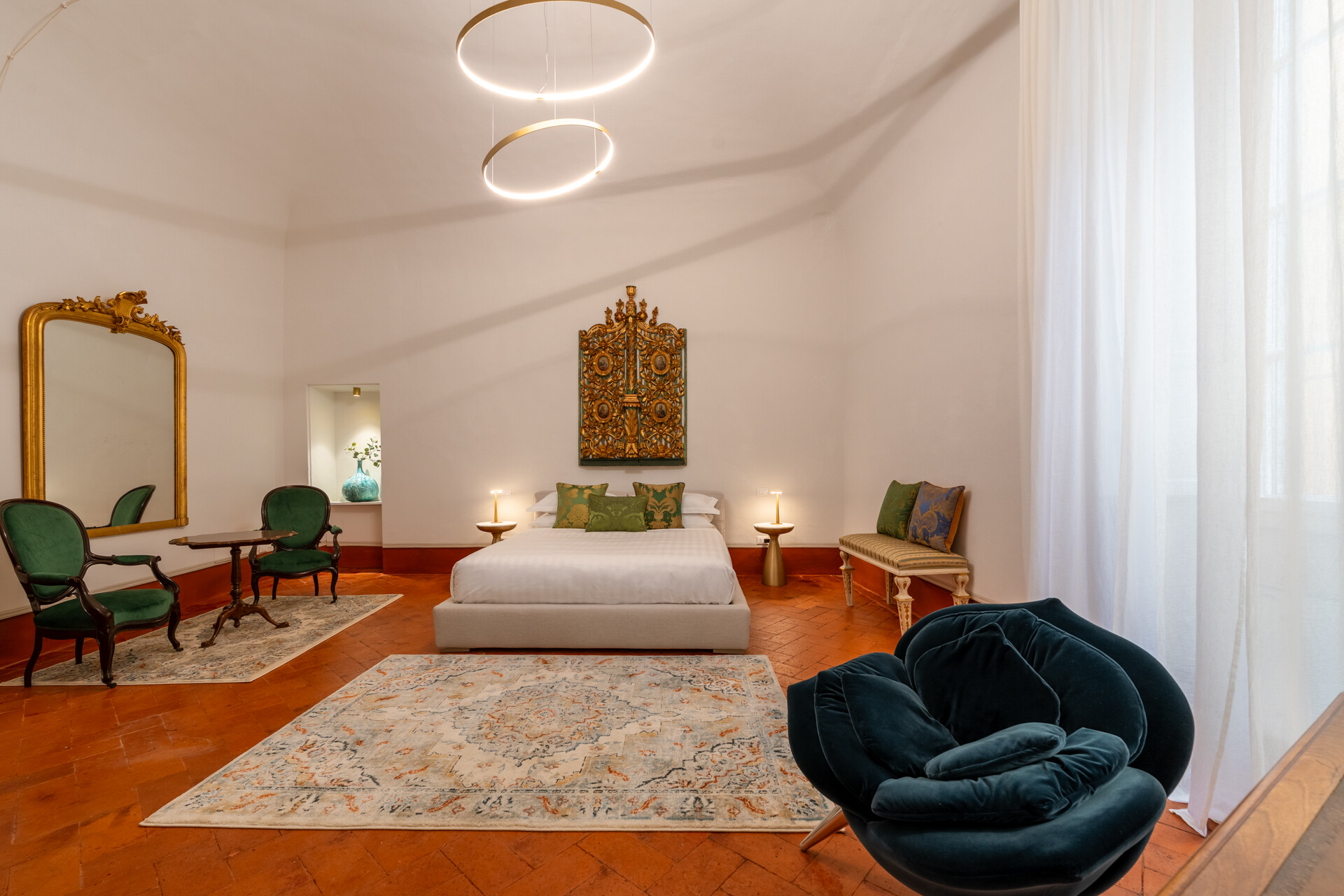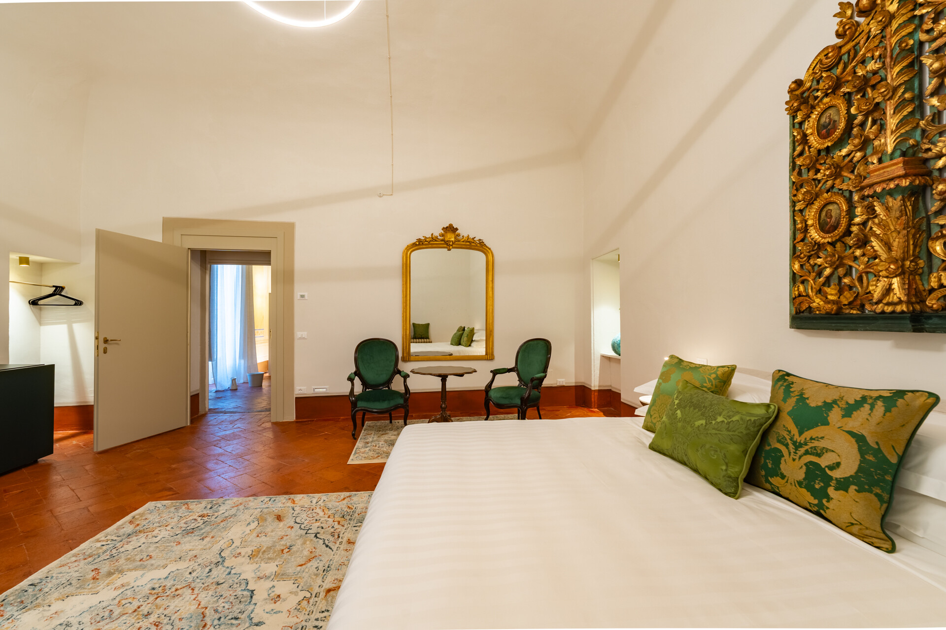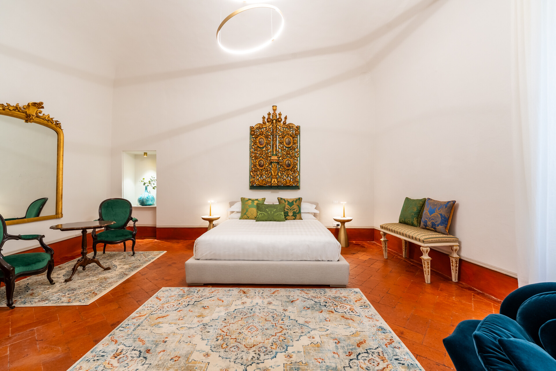 Questo palazzo nobiliare gode di doppia esposizione e ospita oggi sei ampie suite, restaurate con grande ricercatezza. Gli ambienti rivelano un lusso dal carattere unico, esaltato da raffinate pareti in pietra a vista e soffitti affrescati, come documentano queste immagini. Ogni suite dispone di bagno privato, dove marmi pregiati dalle delicate venature si armonizzano con finiture dorate e arredi di grande personalità. Molti spazi conservano i caratteristici camini d’epoca, mentre il cotto originale, le cementine artigianali dai motivi unici e l’elegante parquet a spina di pesce offrono una straordinaria varietà di pavimentazioni.