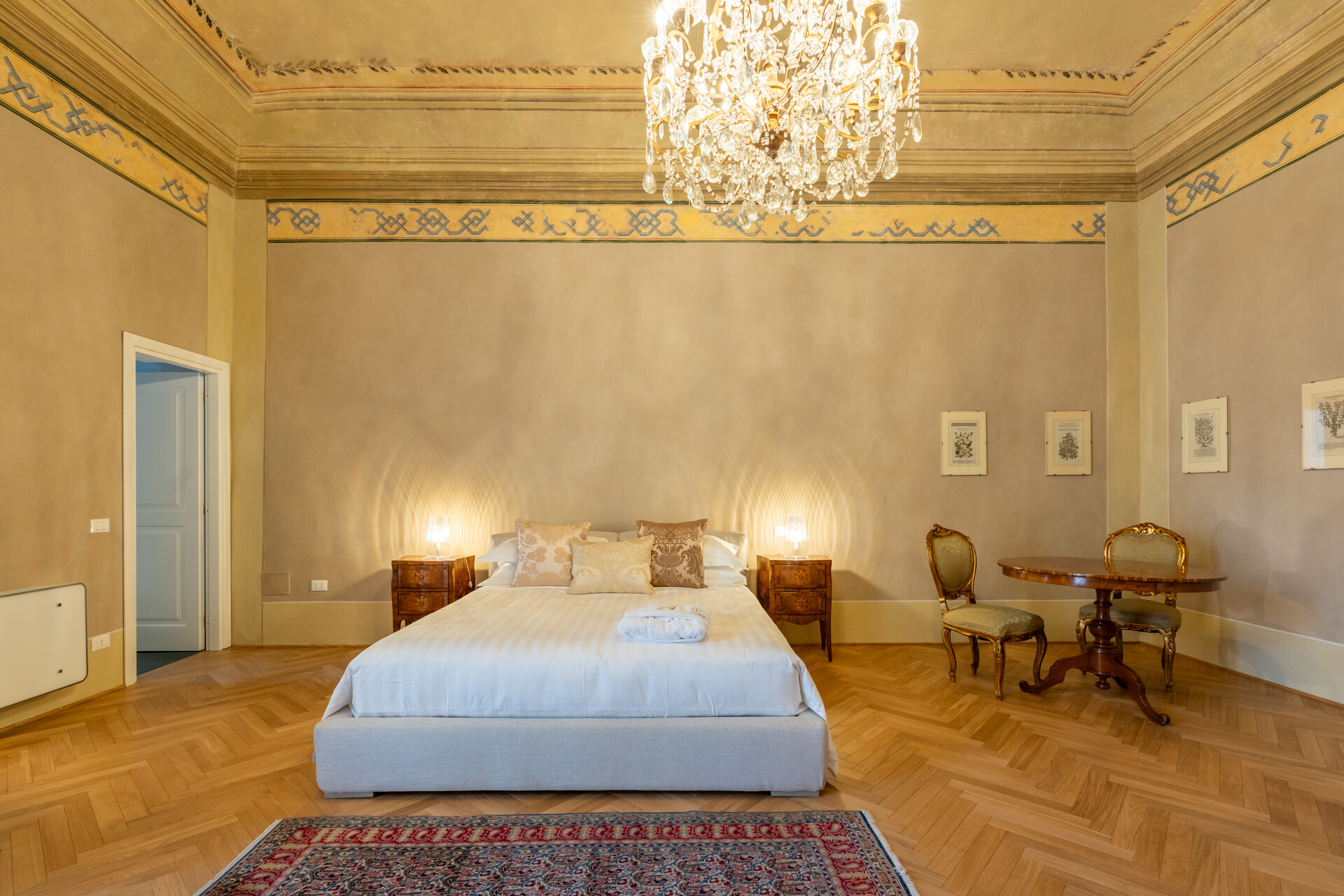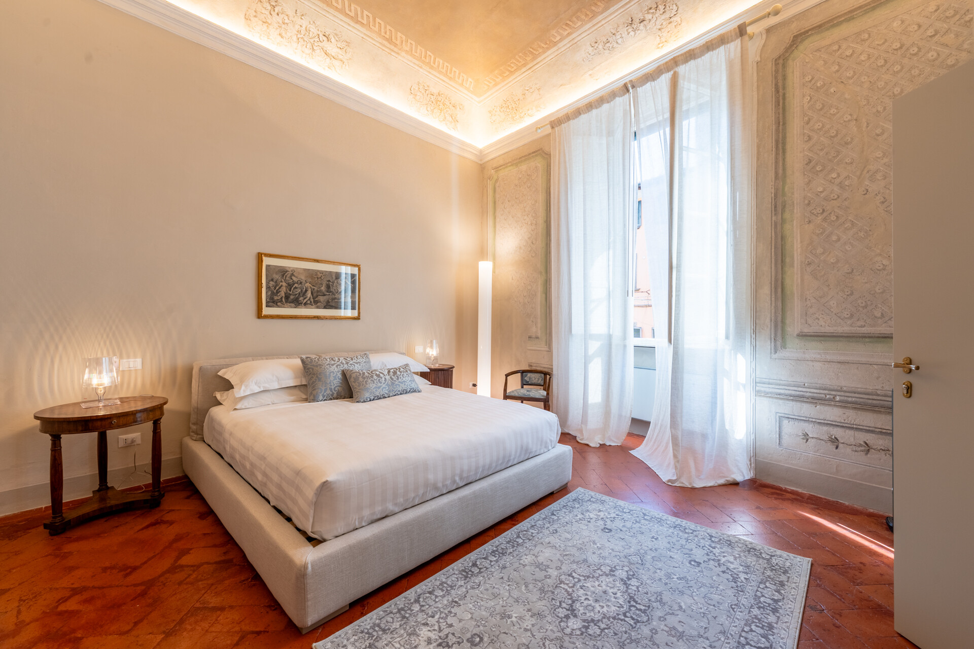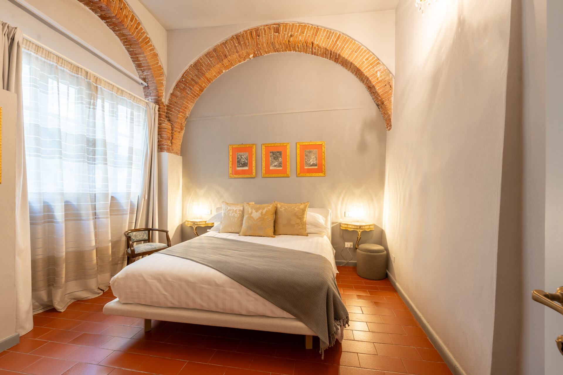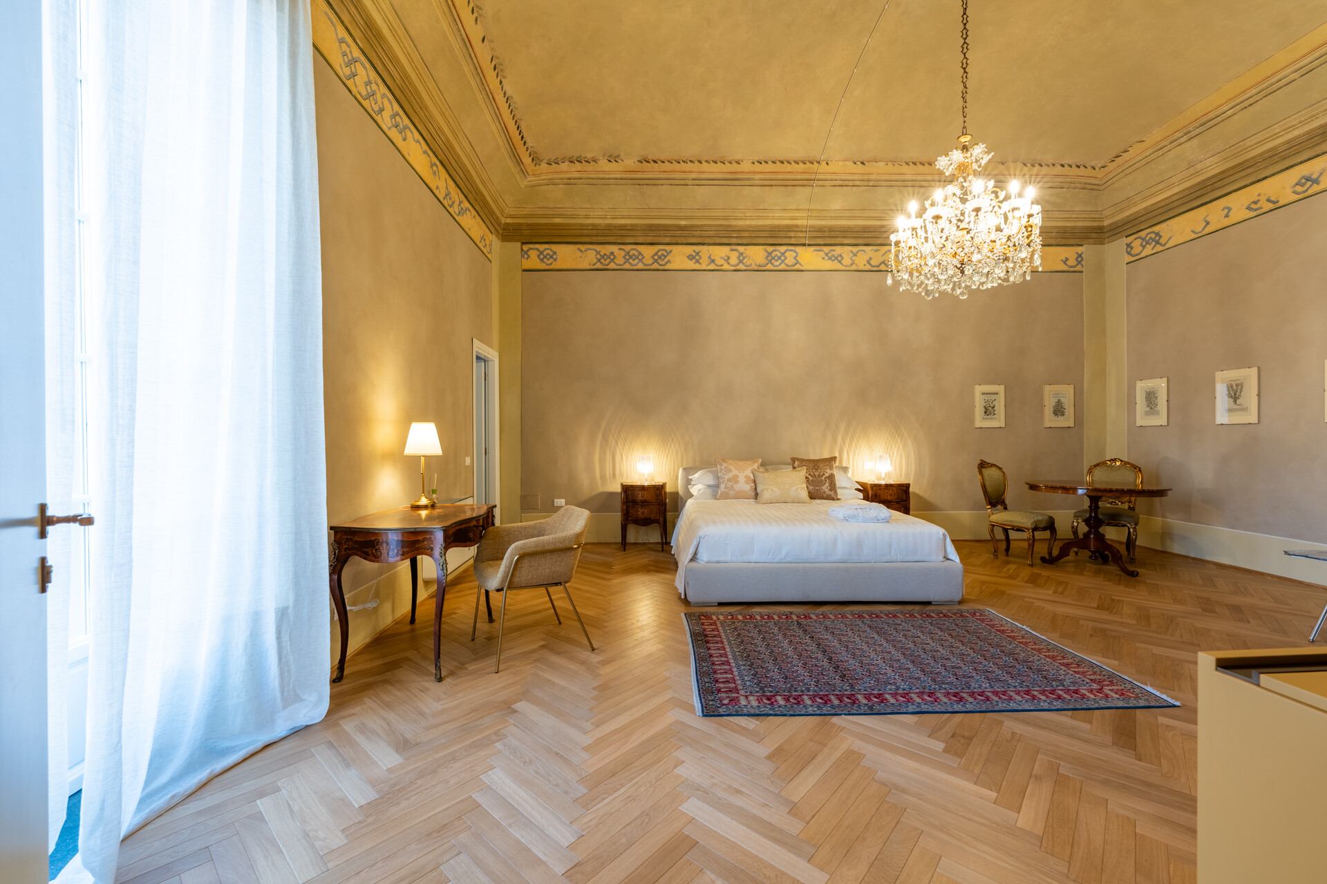Questo palazzo nobiliare gode di doppia esposizione e ospita oggi sei ampie suite, restaurate con grande ricercatezza. Gli ambienti rivelano un lusso dal carattere unico, esaltato da raffinate pareti in pietra a vista e soffitti affrescati, come documentano queste immagini. Ogni suite dispone di bagno privato, dove marmi pregiati dalle delicate venature si armonizzano con finiture dorate e arredi di grande personalità. Molti spazi conservano i caratteristici camini d’epoca, mentre il cotto originale, le cementine artigianali dai motivi unici e l’elegante parquet a spina di pesce offrono una straordinaria varietà di pavimentazioni.