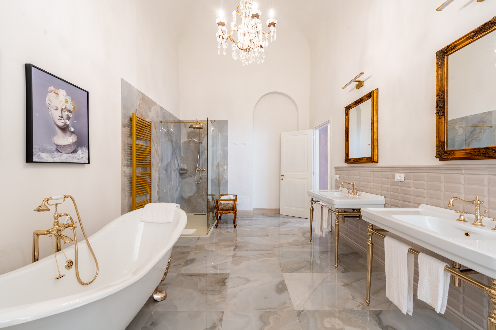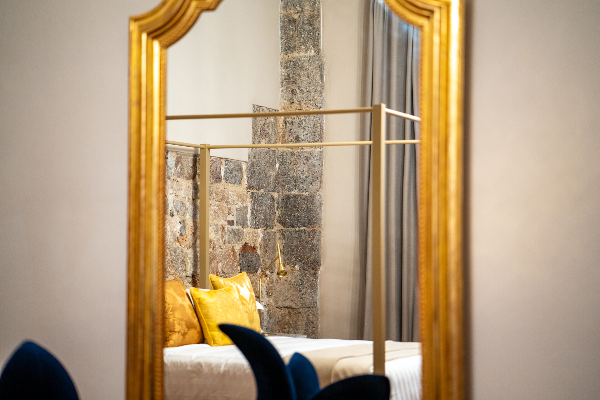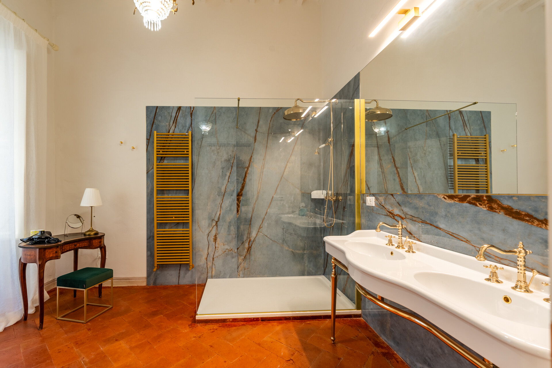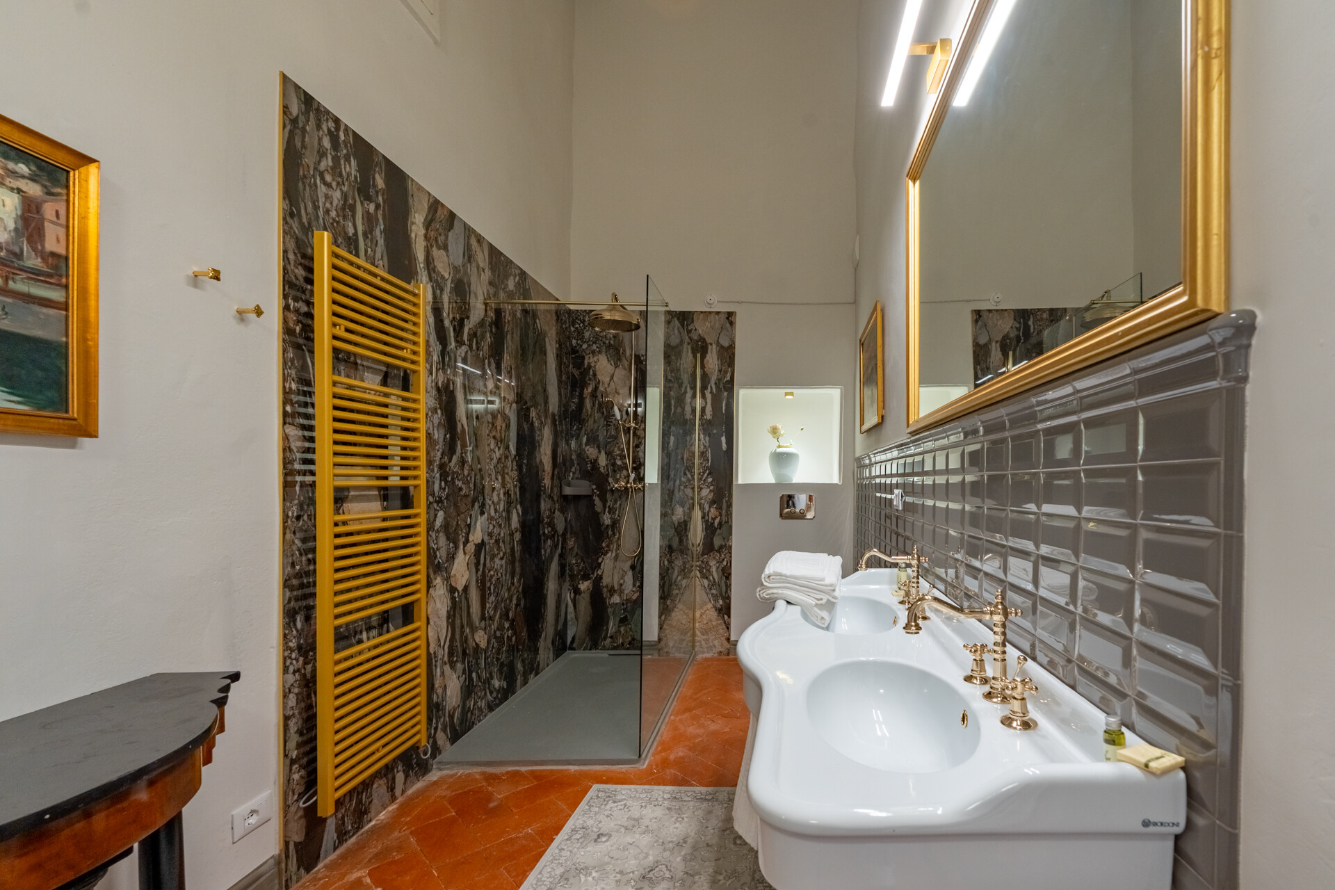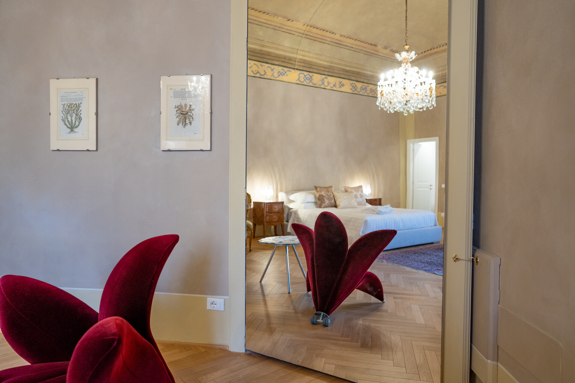 Questo palazzo nobiliare gode di doppia esposizione e ospita oggi sei ampie suite, restaurate con grande ricercatezza. Gli ambienti rivelano un lusso dal carattere unico, esaltato da raffinate pareti in pietra a vista e soffitti affrescati, come documentano queste immagini. Ogni suite dispone di bagno privato, dove marmi pregiati dalle delicate venature si armonizzano con finiture dorate e arredi di grande personalità. Molti spazi conservano i caratteristici camini d’epoca, mentre il cotto originale, le cementine artigianali dai motivi unici e l’elegante parquet a spina di pesce offrono una straordinaria varietà di pavimentazioni.