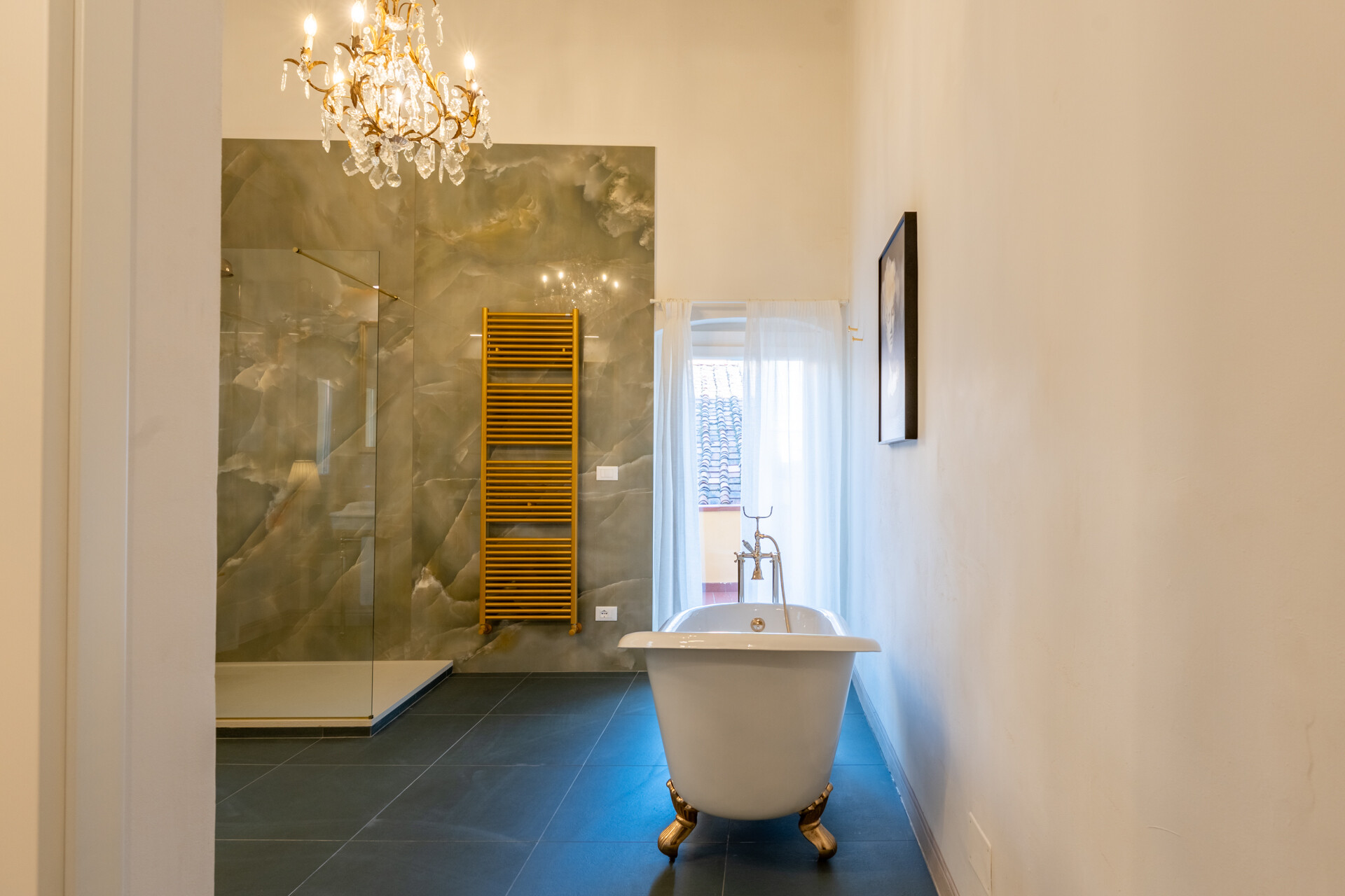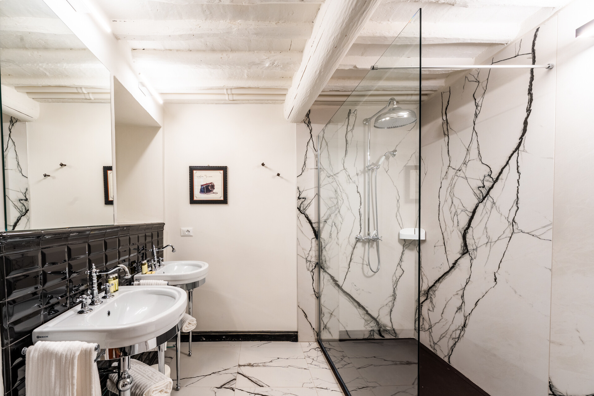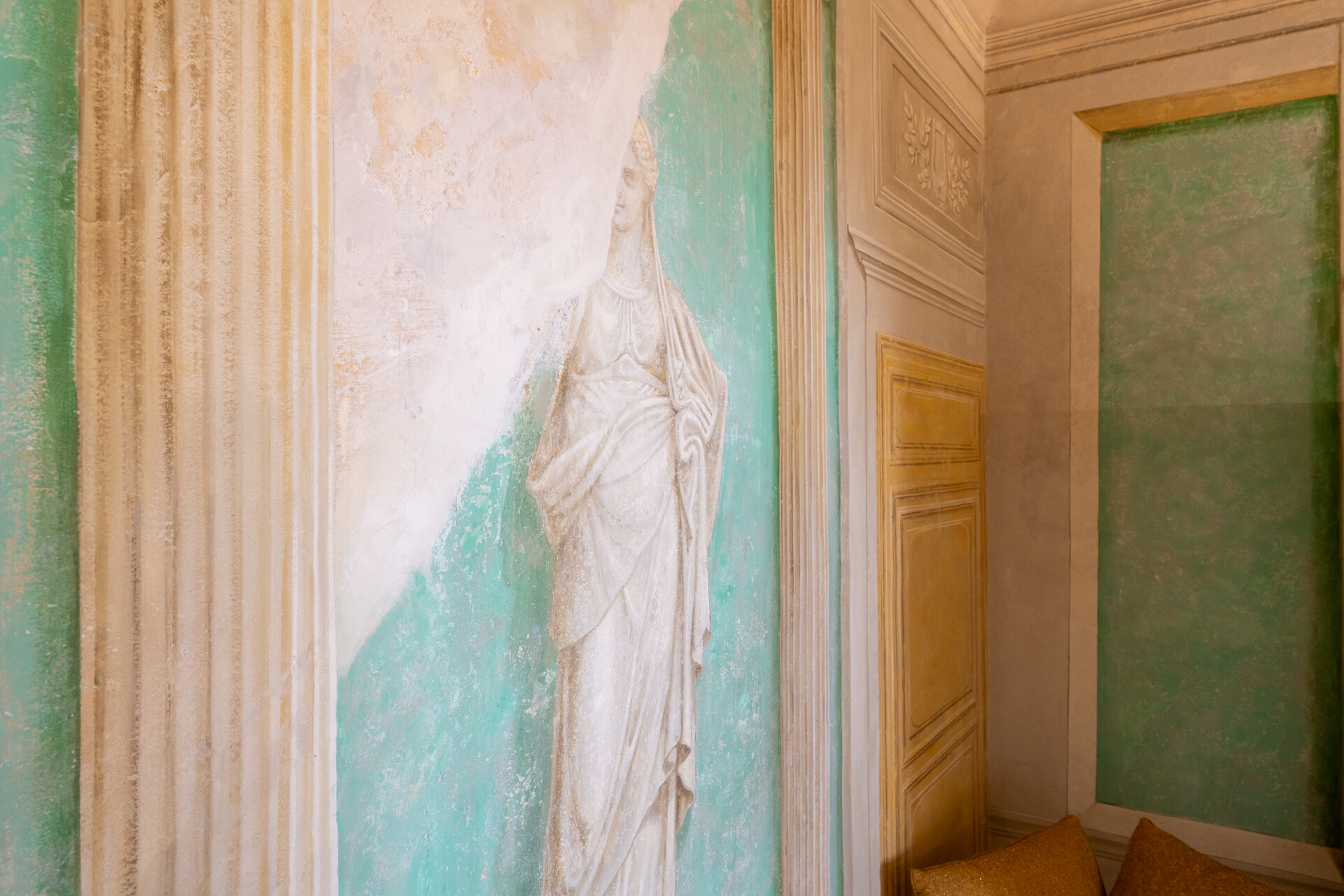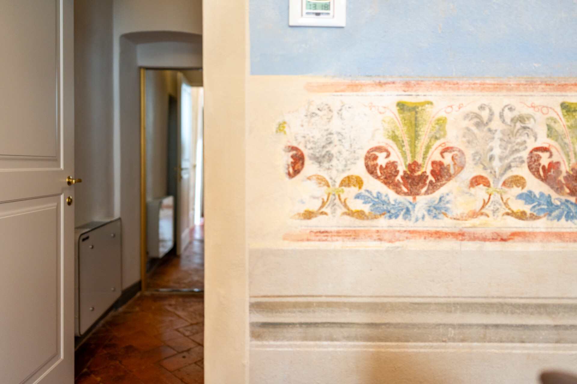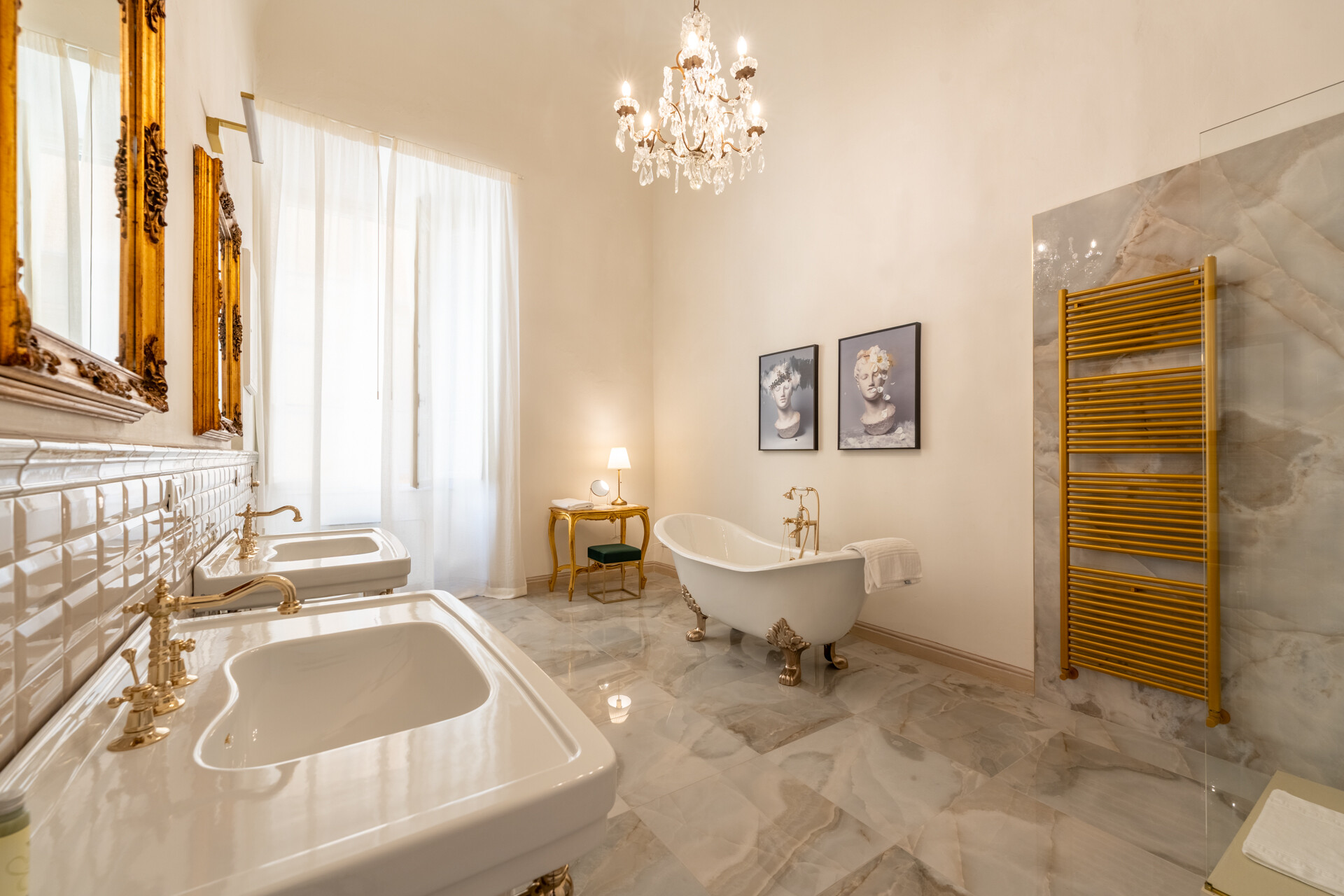 Questo palazzo nobiliare gode di doppia esposizione e ospita oggi sei ampie suite, restaurate con grande ricercatezza. Gli ambienti rivelano un lusso dal carattere unico, esaltato da raffinate pareti in pietra a vista e soffitti affrescati, come documentano queste immagini. Ogni suite dispone di bagno privato, dove marmi pregiati dalle delicate venature si armonizzano con finiture dorate e arredi di grande personalità. Molti spazi conservano i caratteristici camini d’epoca, mentre il cotto originale, le cementine artigianali dai motivi unici e l’elegante parquet a spina di pesce offrono una straordinaria varietà di pavimentazioni.