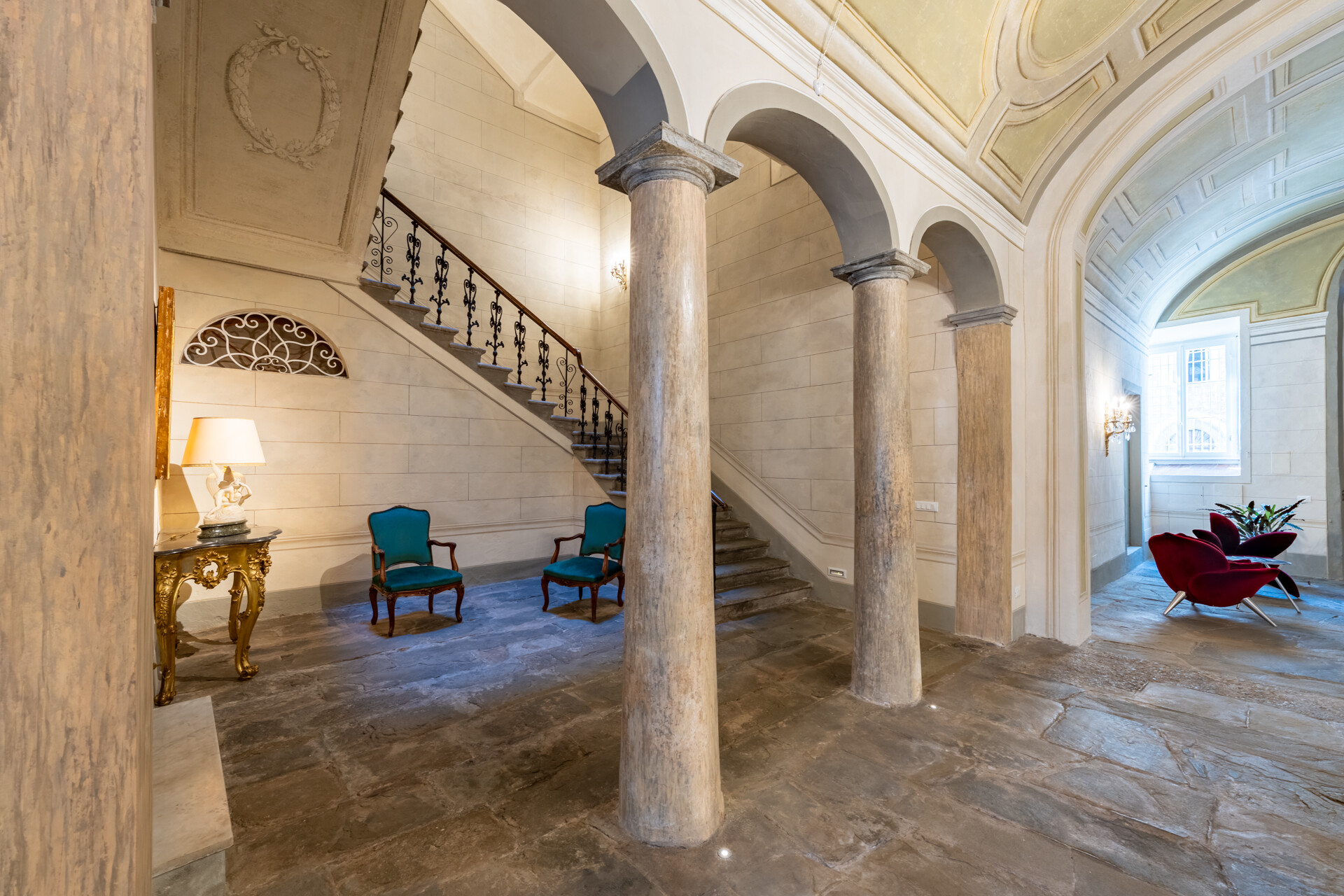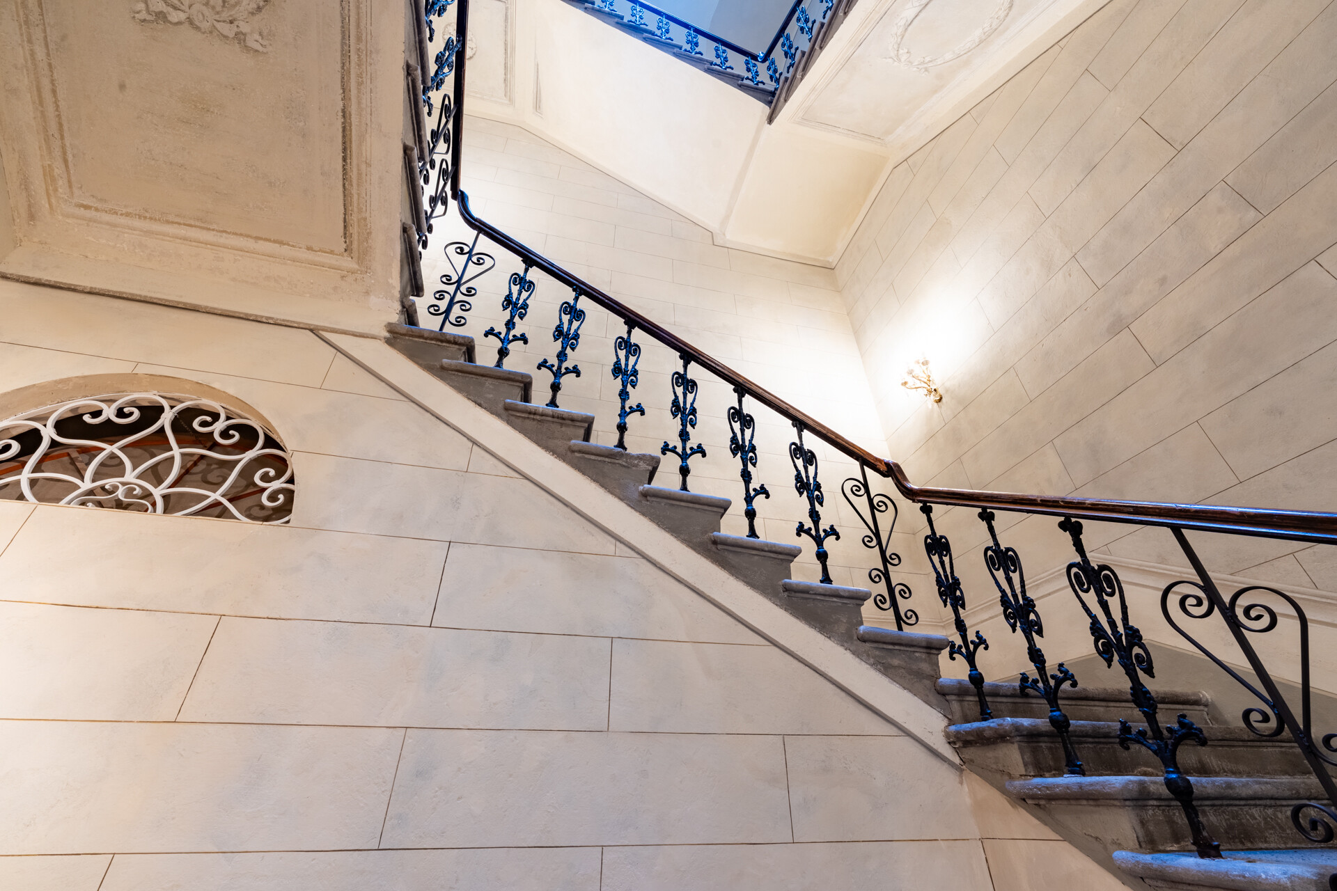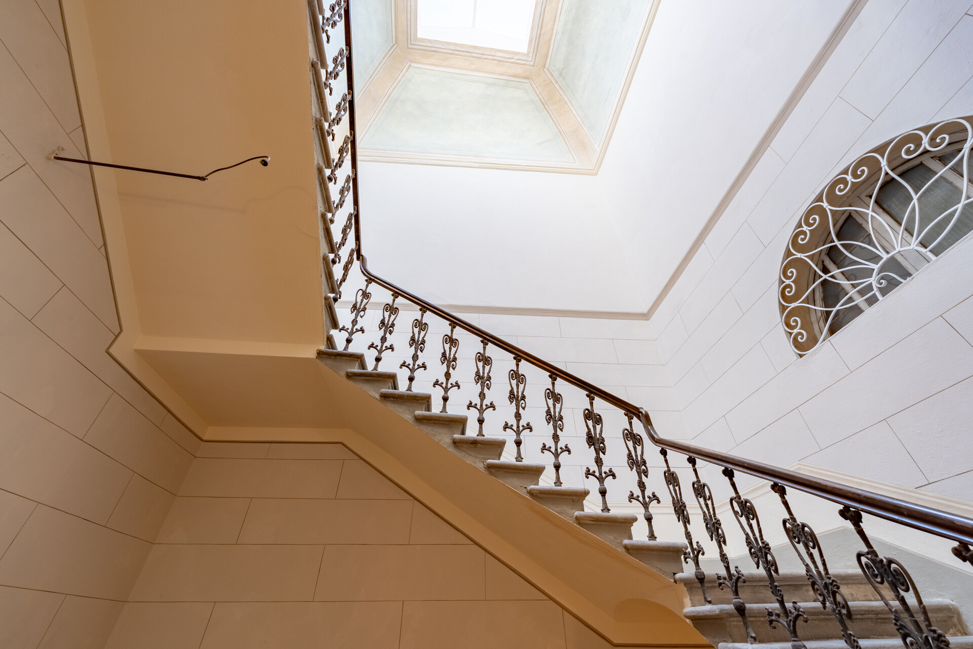 I quattro livelli si sviluppano attorno a una scenografica scala in pietra, con balaustra in ferro battuto e corrimano in legno finemente levigato, culminante sotto un’ampia finestra zenitale che illumina l’intero vano.