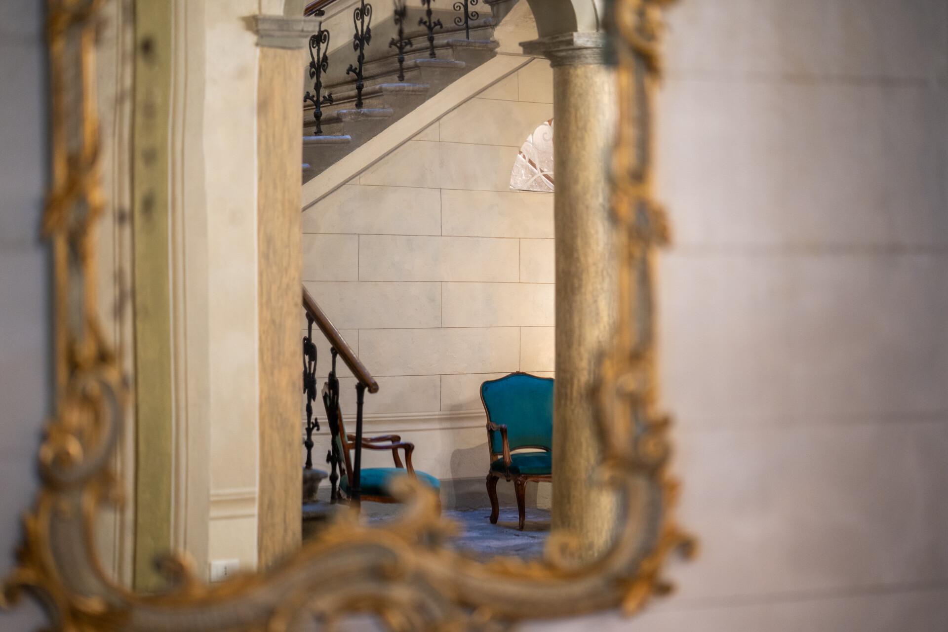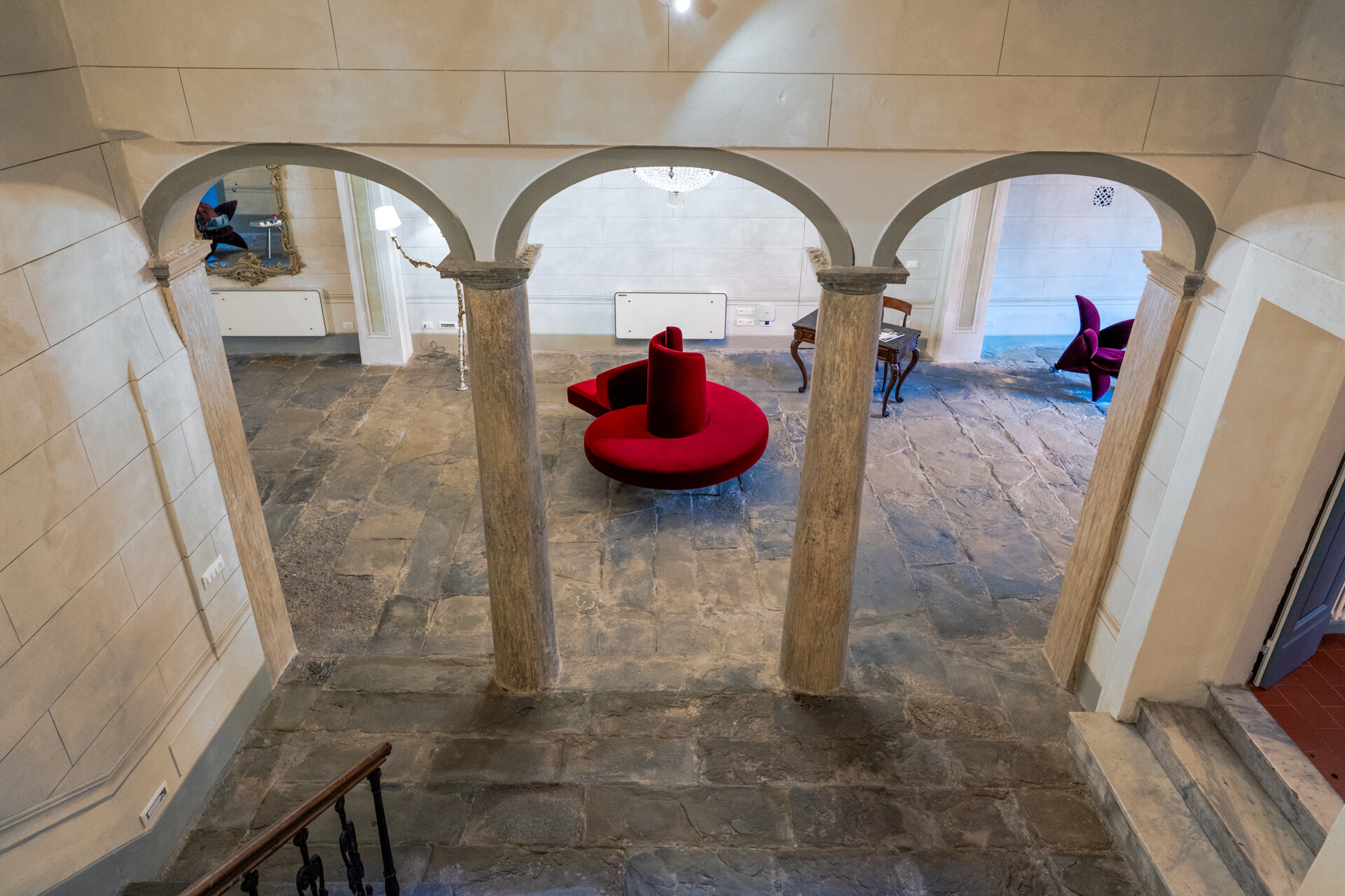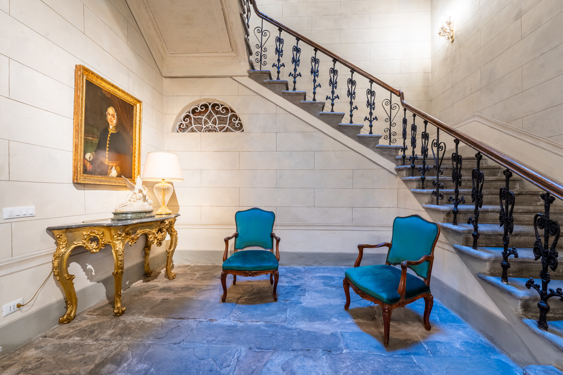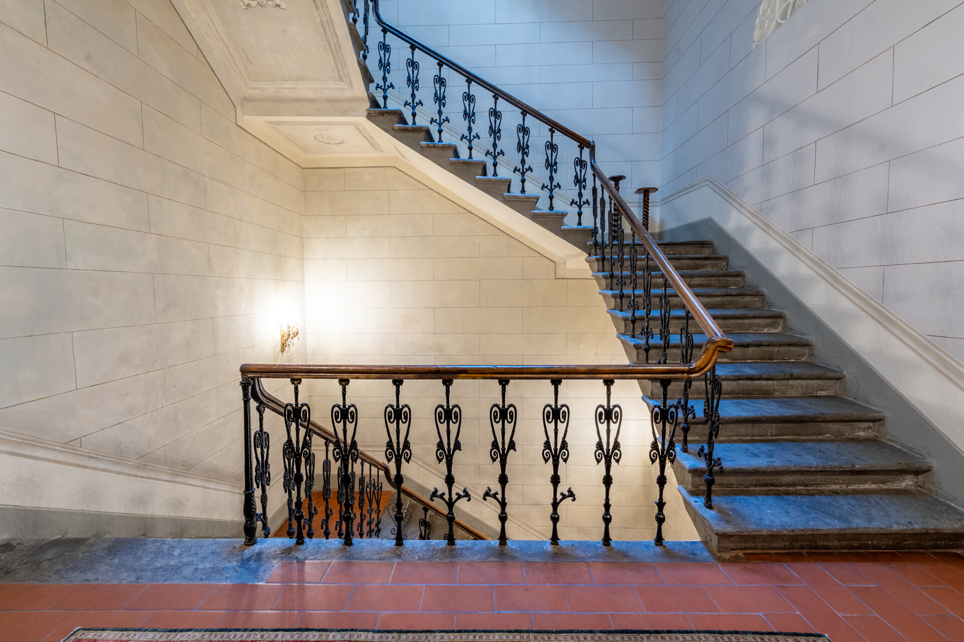 I quattro livelli si sviluppano attorno a una scenografica scala in pietra, con balaustra in ferro battuto e corrimano in legno finemente levigato, culminante sotto un’ampia finestra zenitale che illumina l’intero vano.