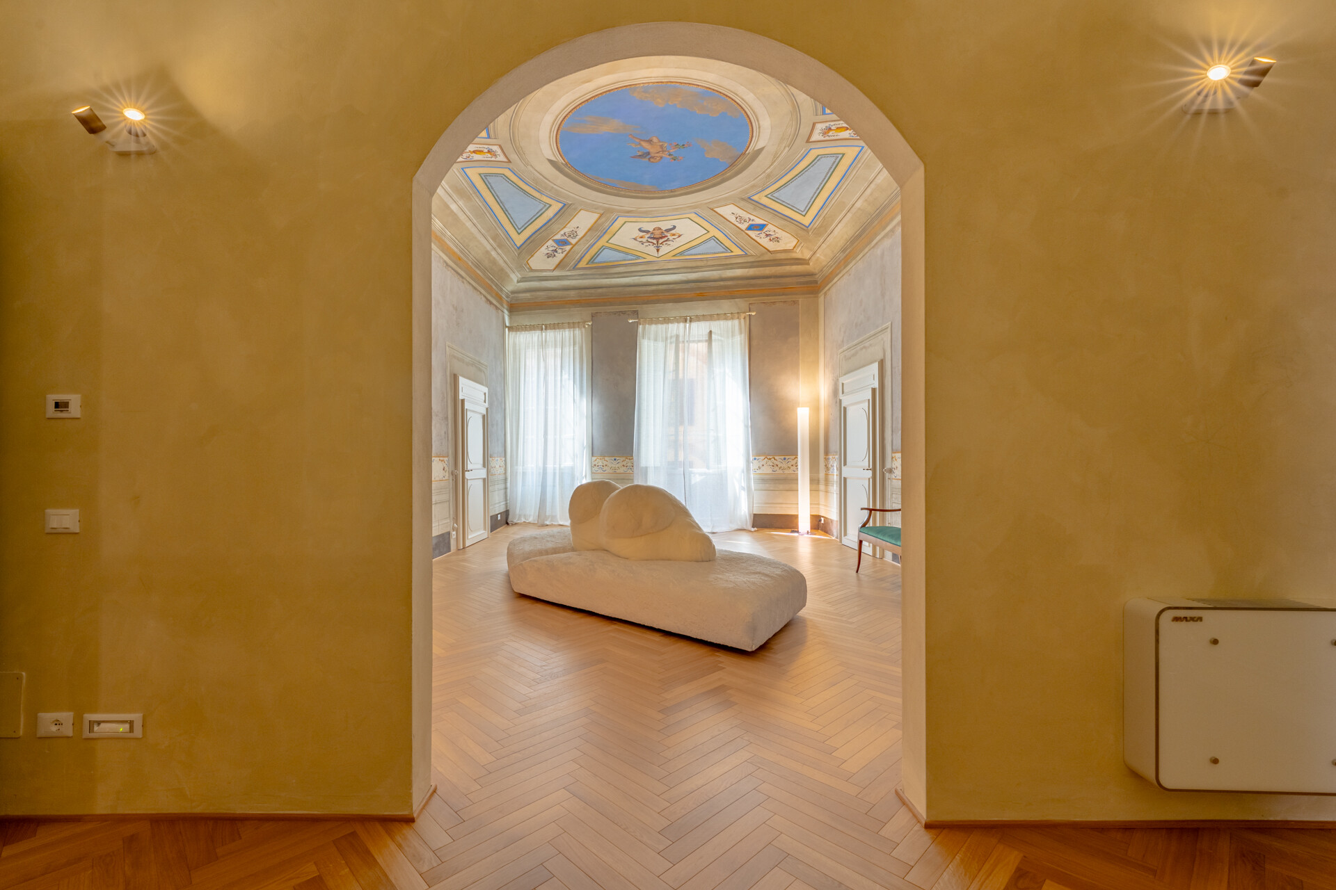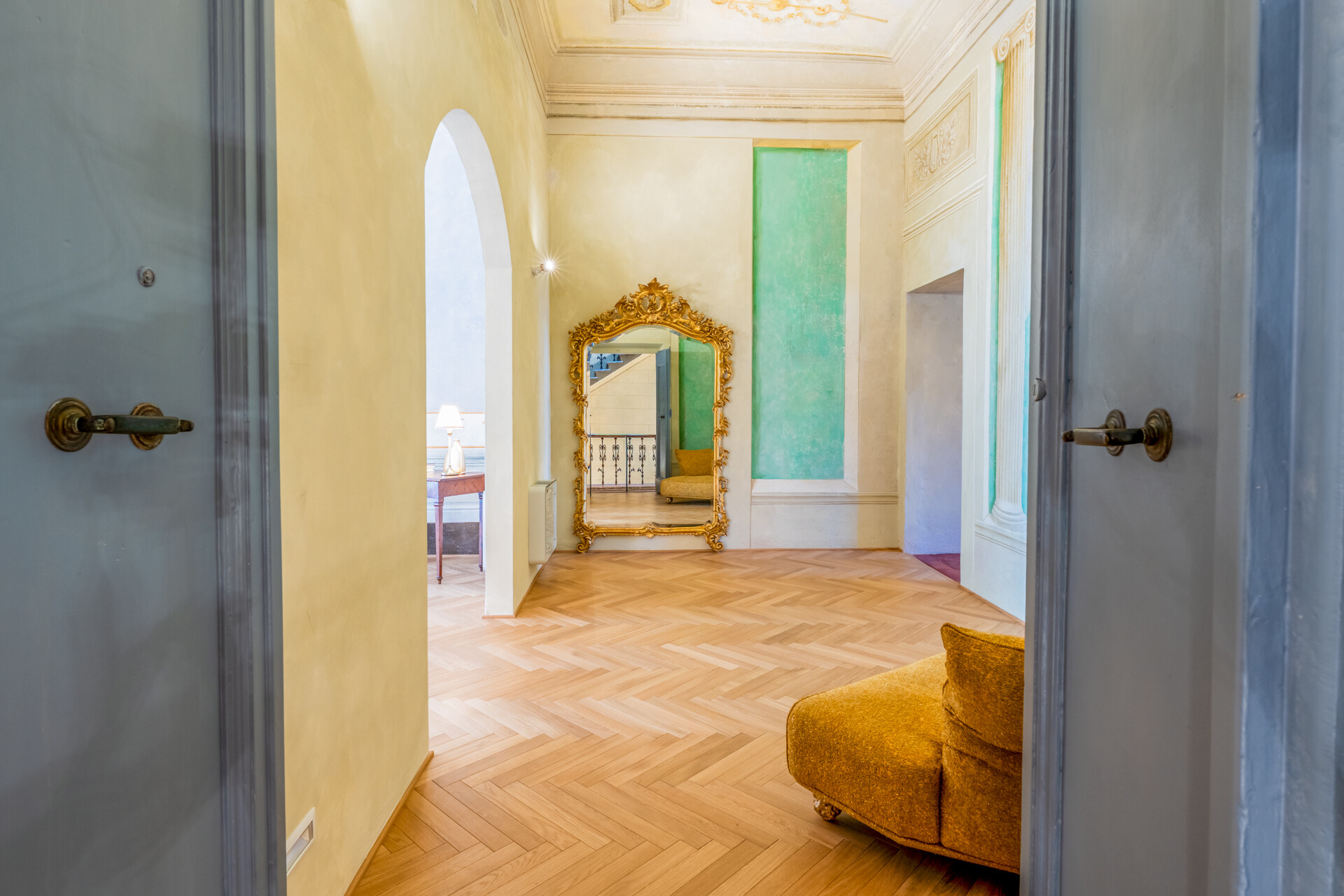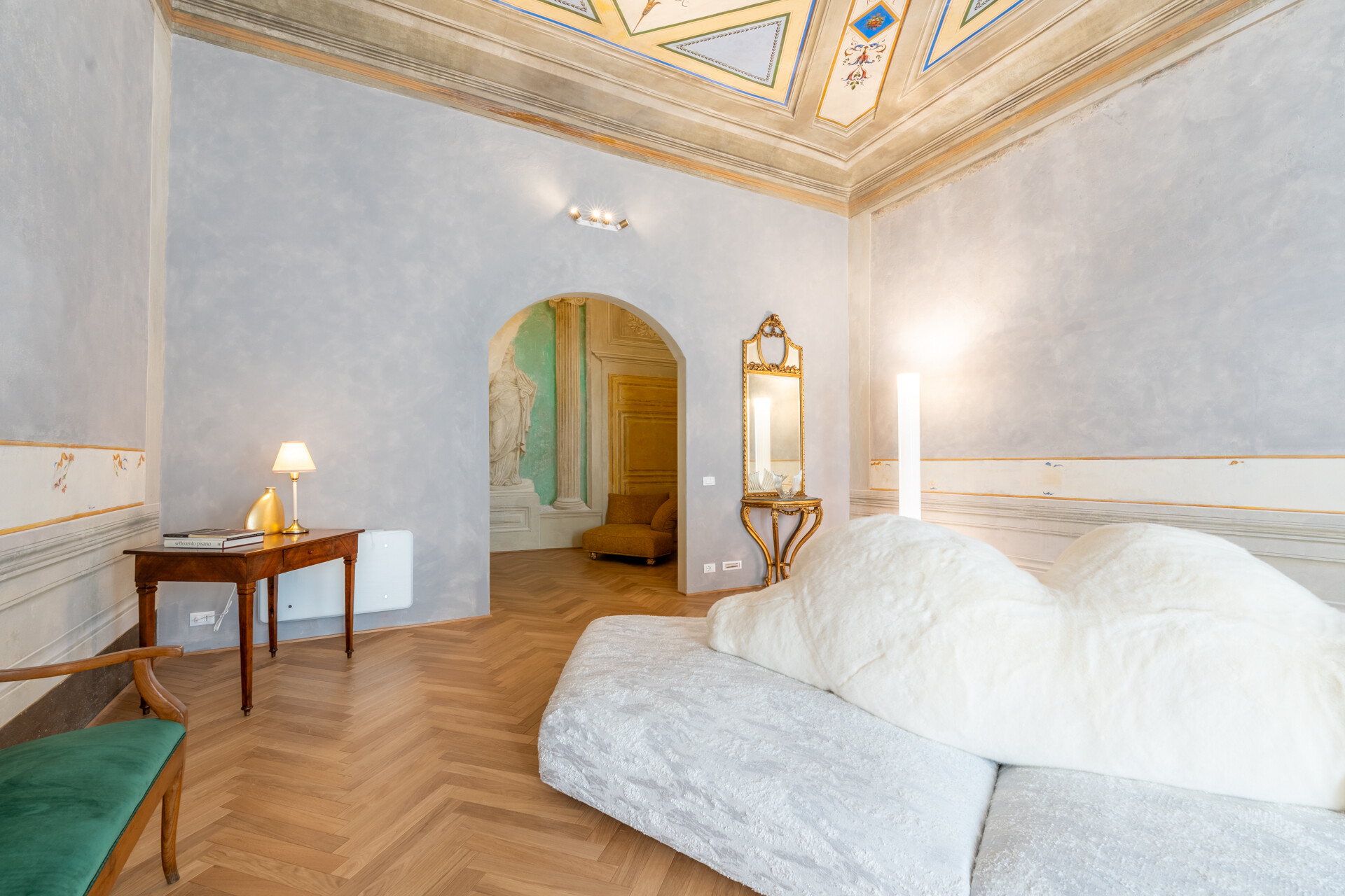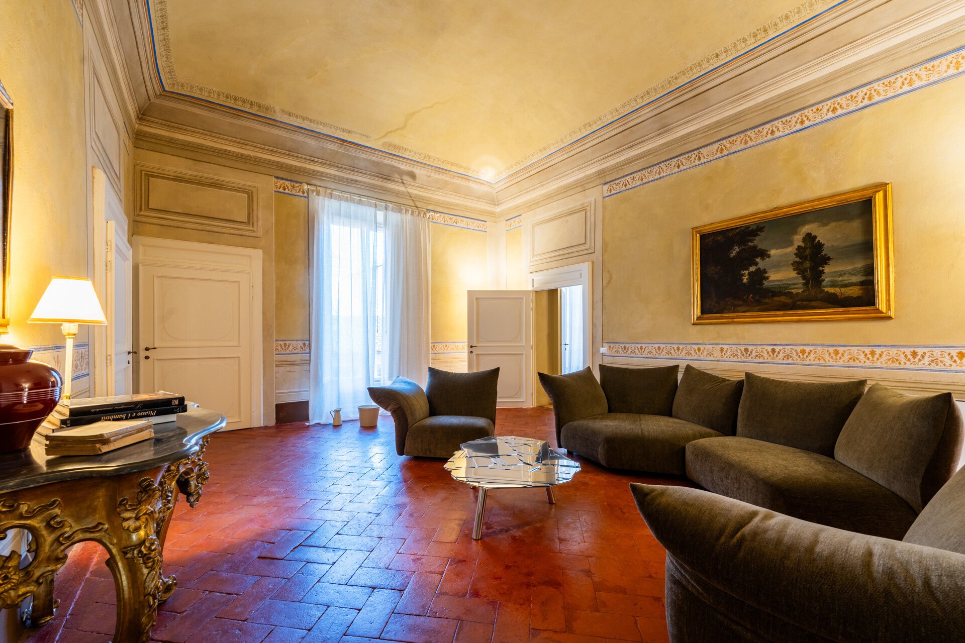 Il soffitto a volta, impreziosito da dettagli in stucco e da morbide linee architettoniche, conferisce agli ambienti un’eleganza senza tempo, esaltata da un lampadario di cristallo che diffonde una luce avvolgente, creando un’atmosfera sofisticata e accogliente.