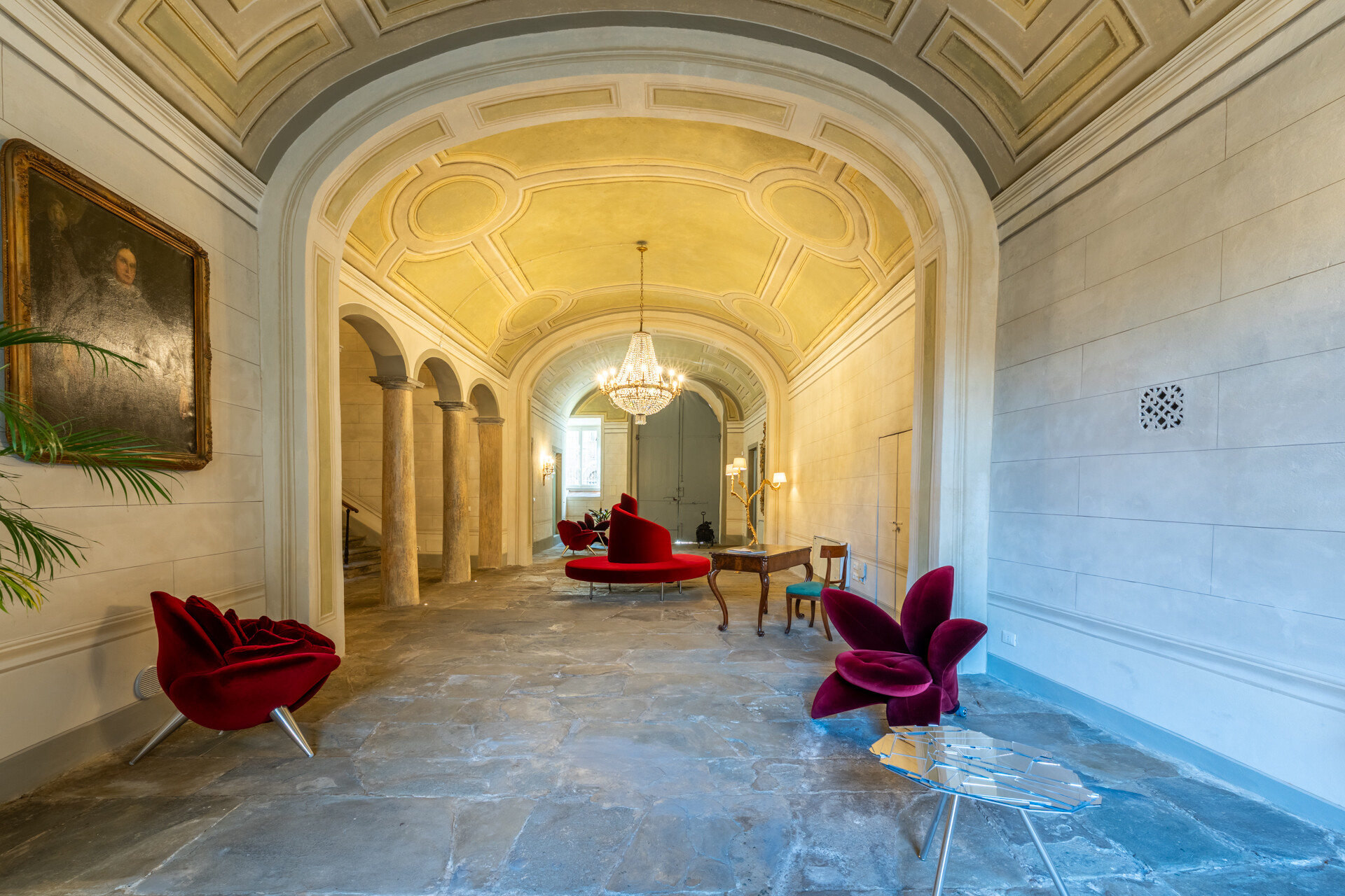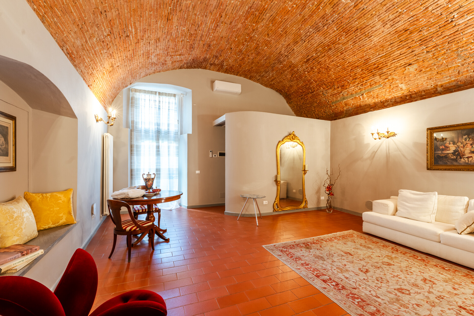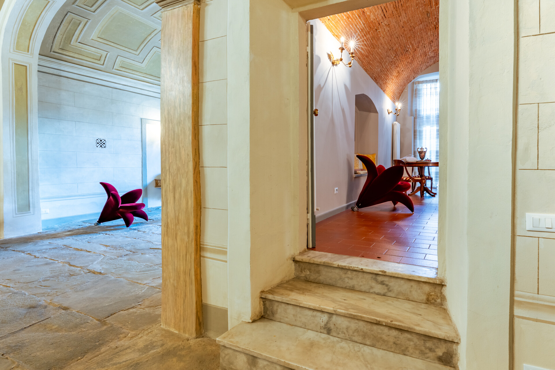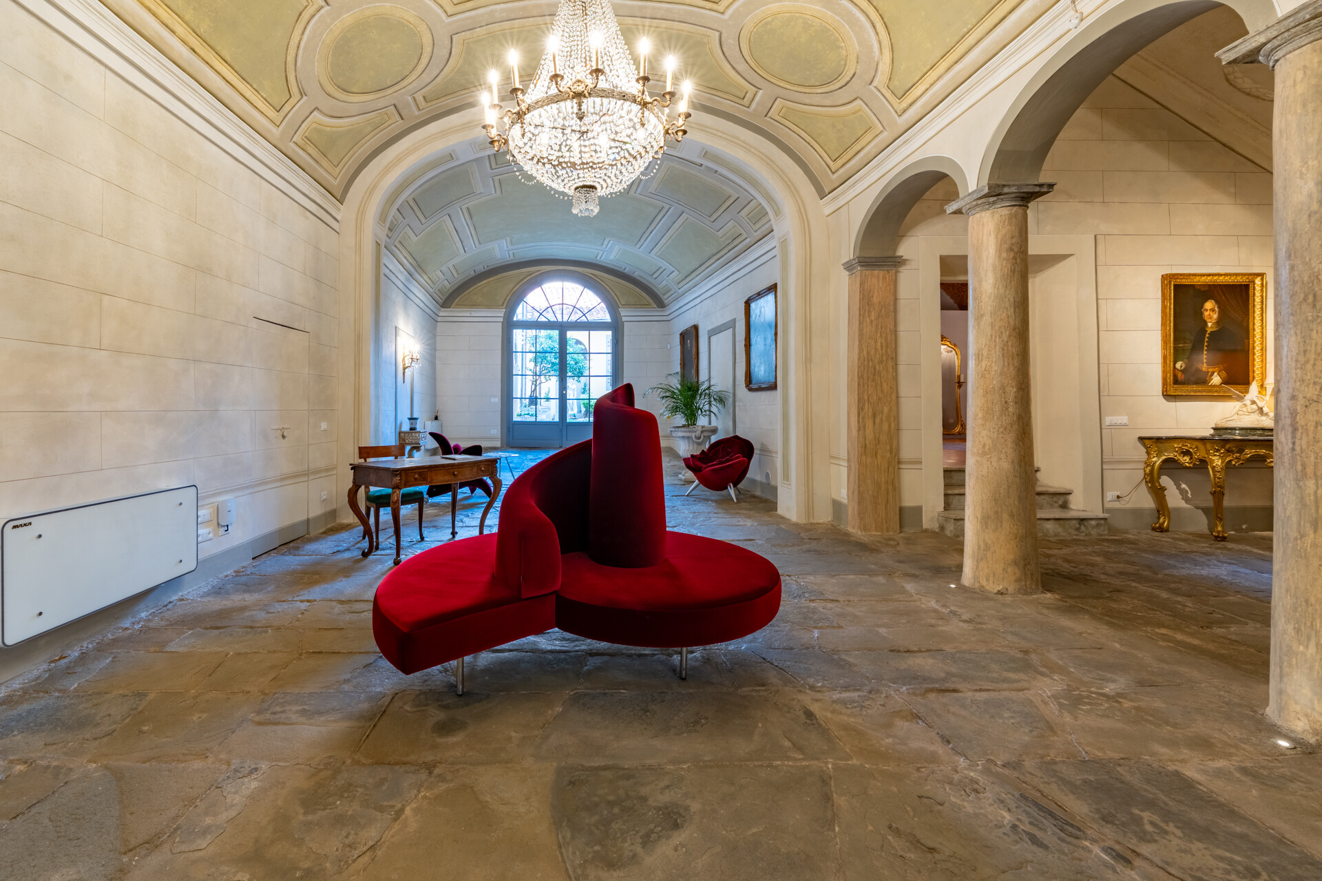 Il soffitto a volta, impreziosito da dettagli in stucco e da morbide linee architettoniche, conferisce agli ambienti un’eleganza senza tempo, esaltata da un lampadario di cristallo che diffonde una luce avvolgente, creando un’atmosfera sofisticata e accogliente.