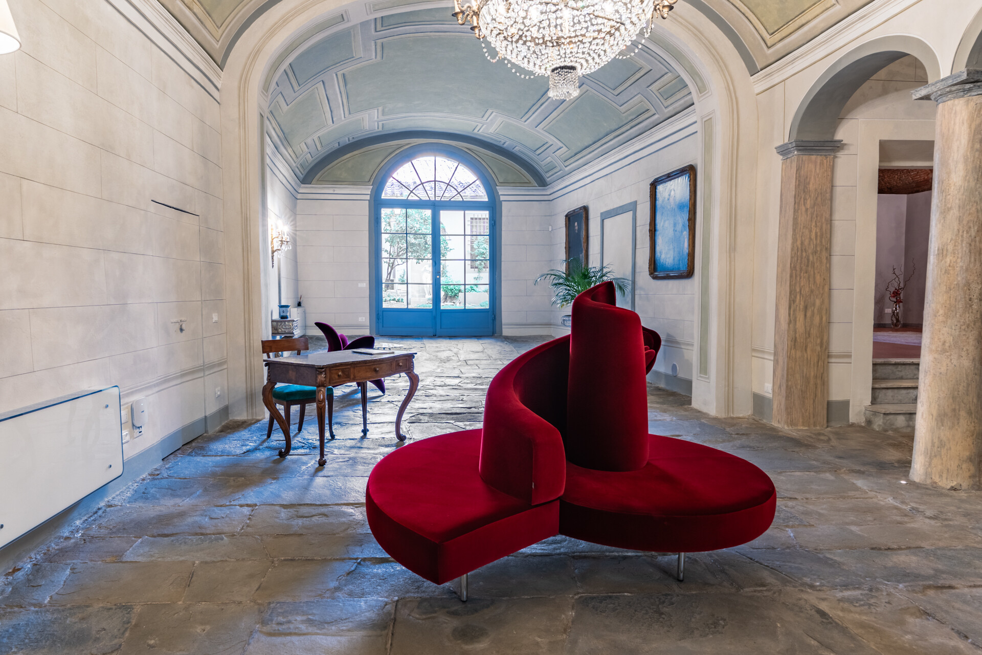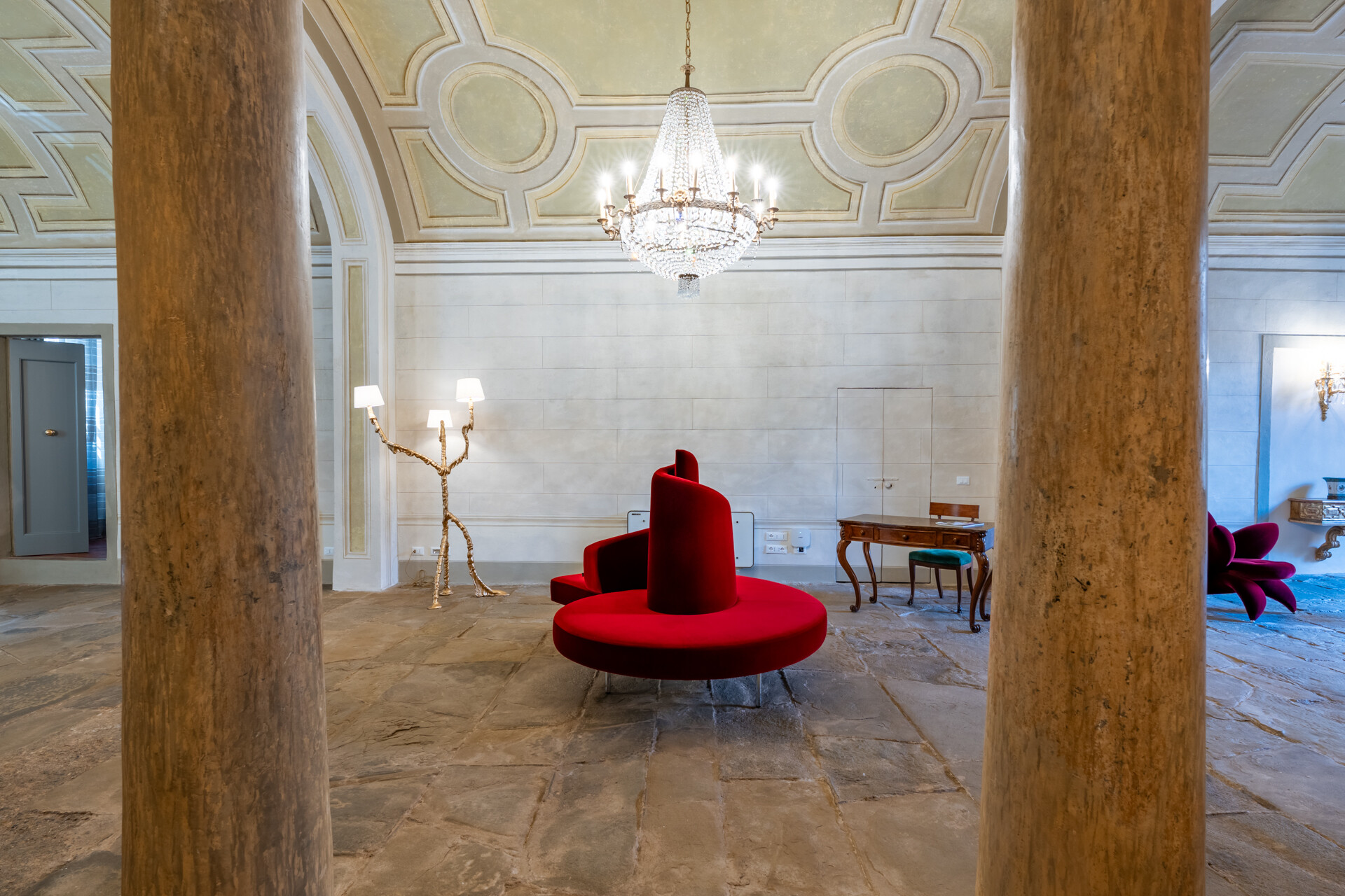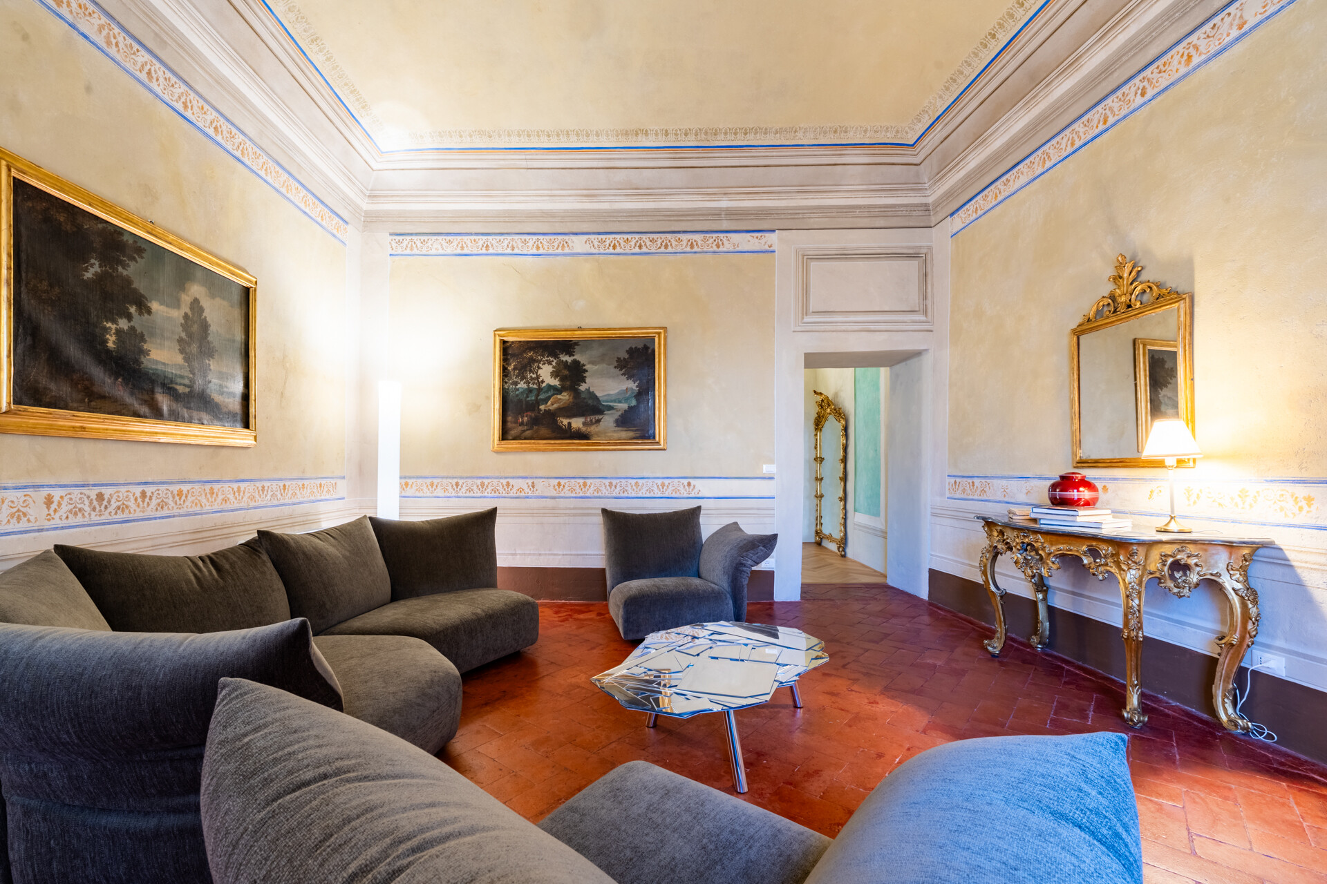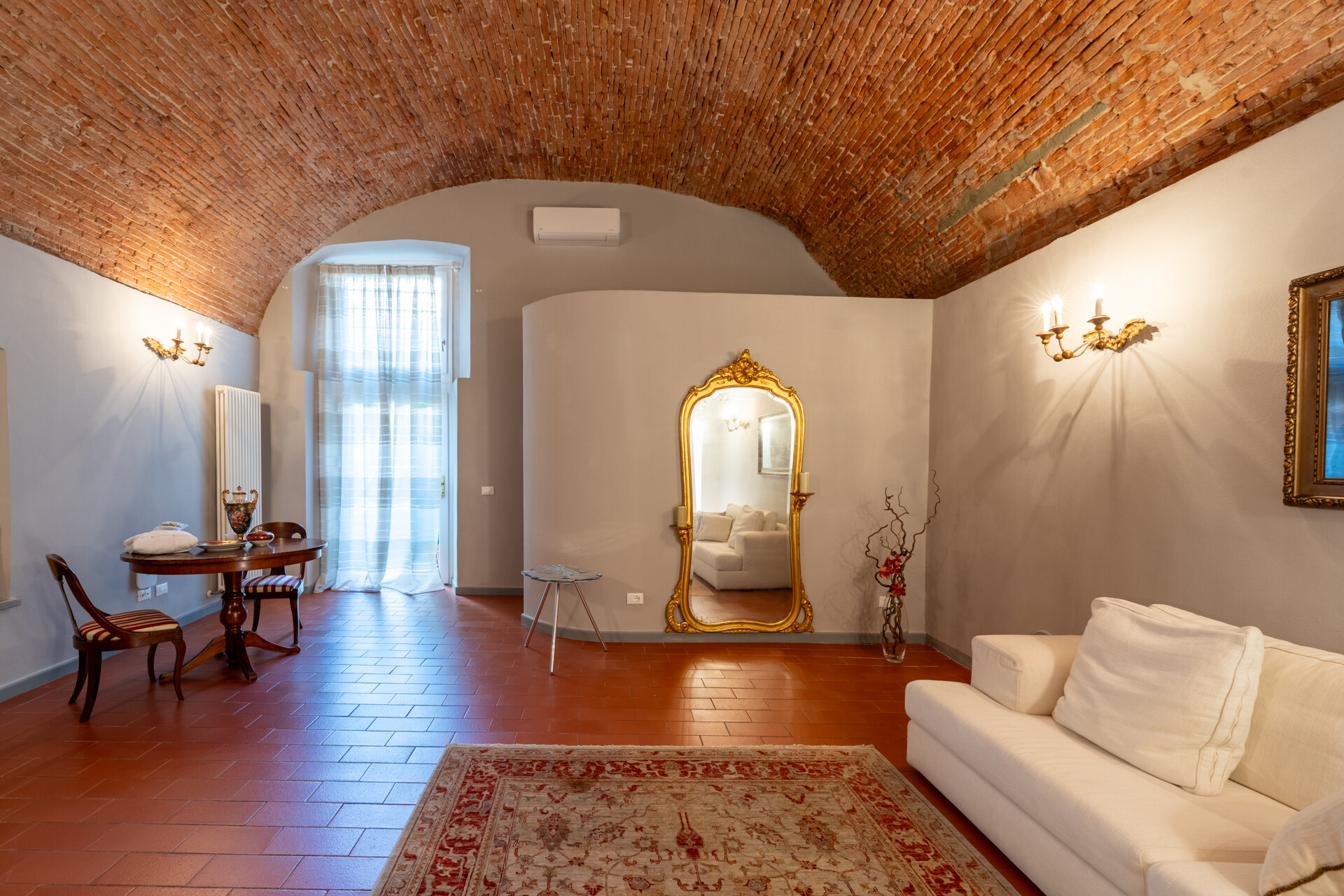 Il soffitto a volta, impreziosito da dettagli in stucco e da morbide linee architettoniche, conferisce agli ambienti un’eleganza senza tempo, esaltata da un lampadario di cristallo che diffonde una luce avvolgente, creando un’atmosfera sofisticata e accogliente.