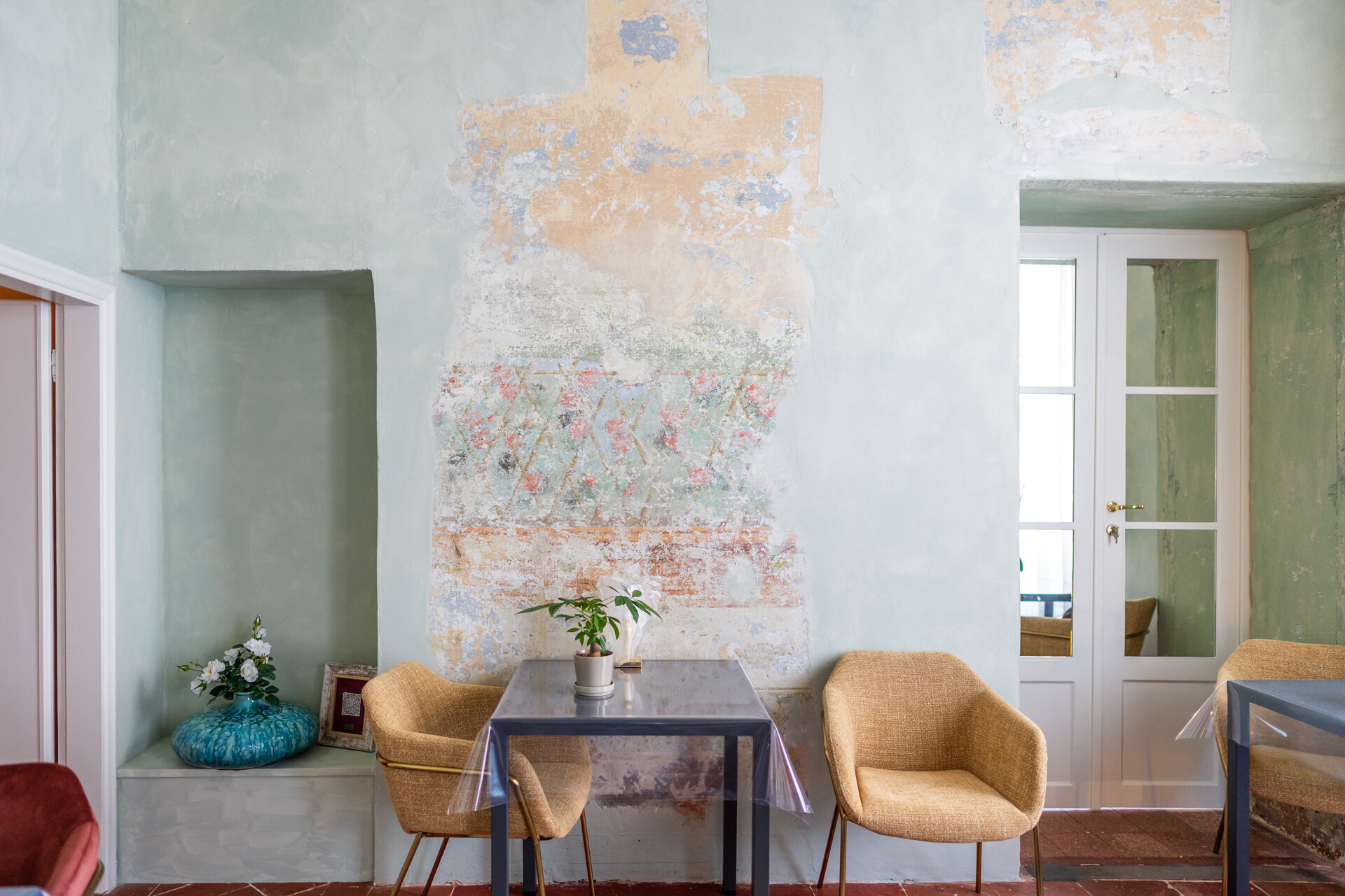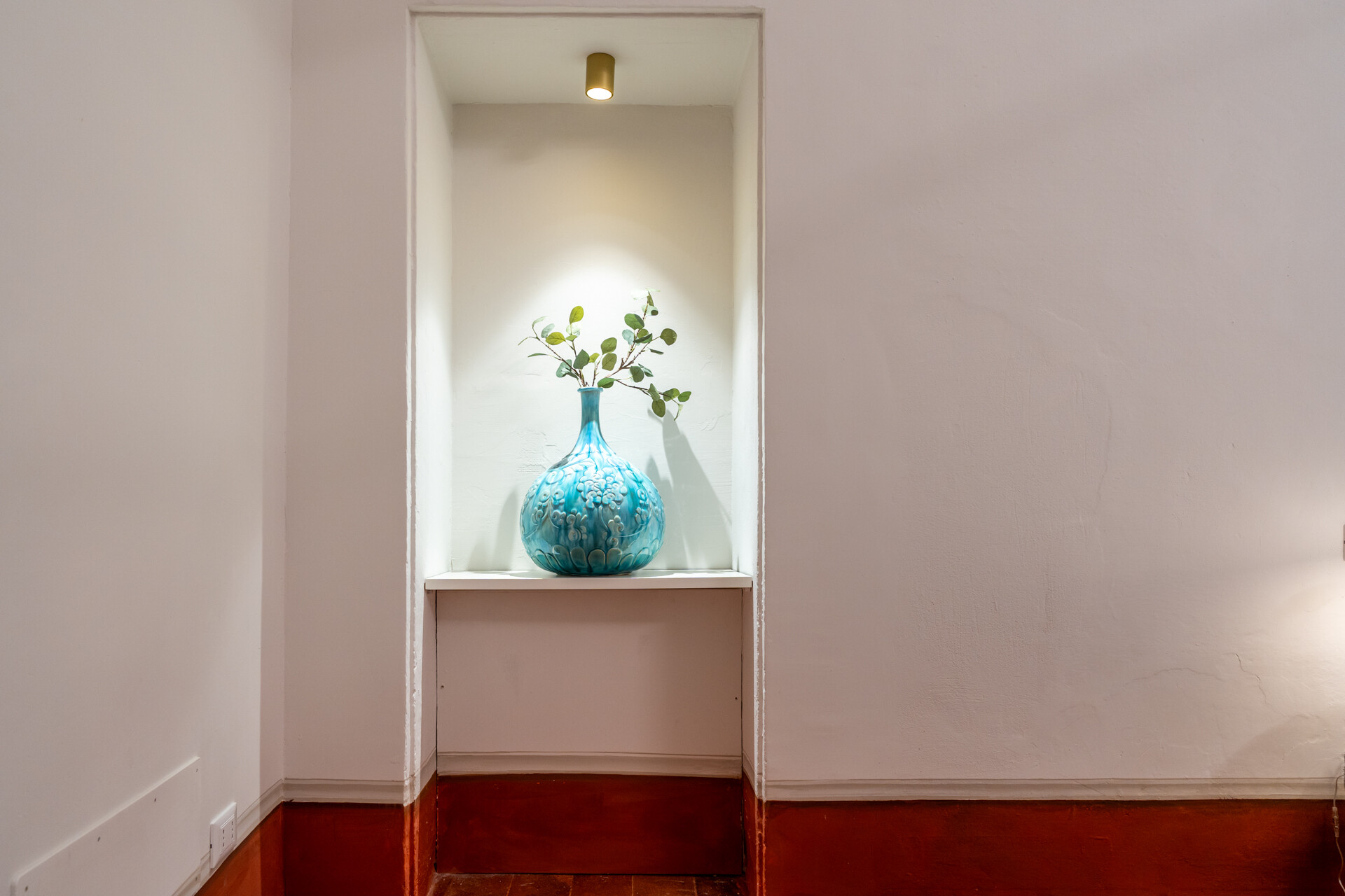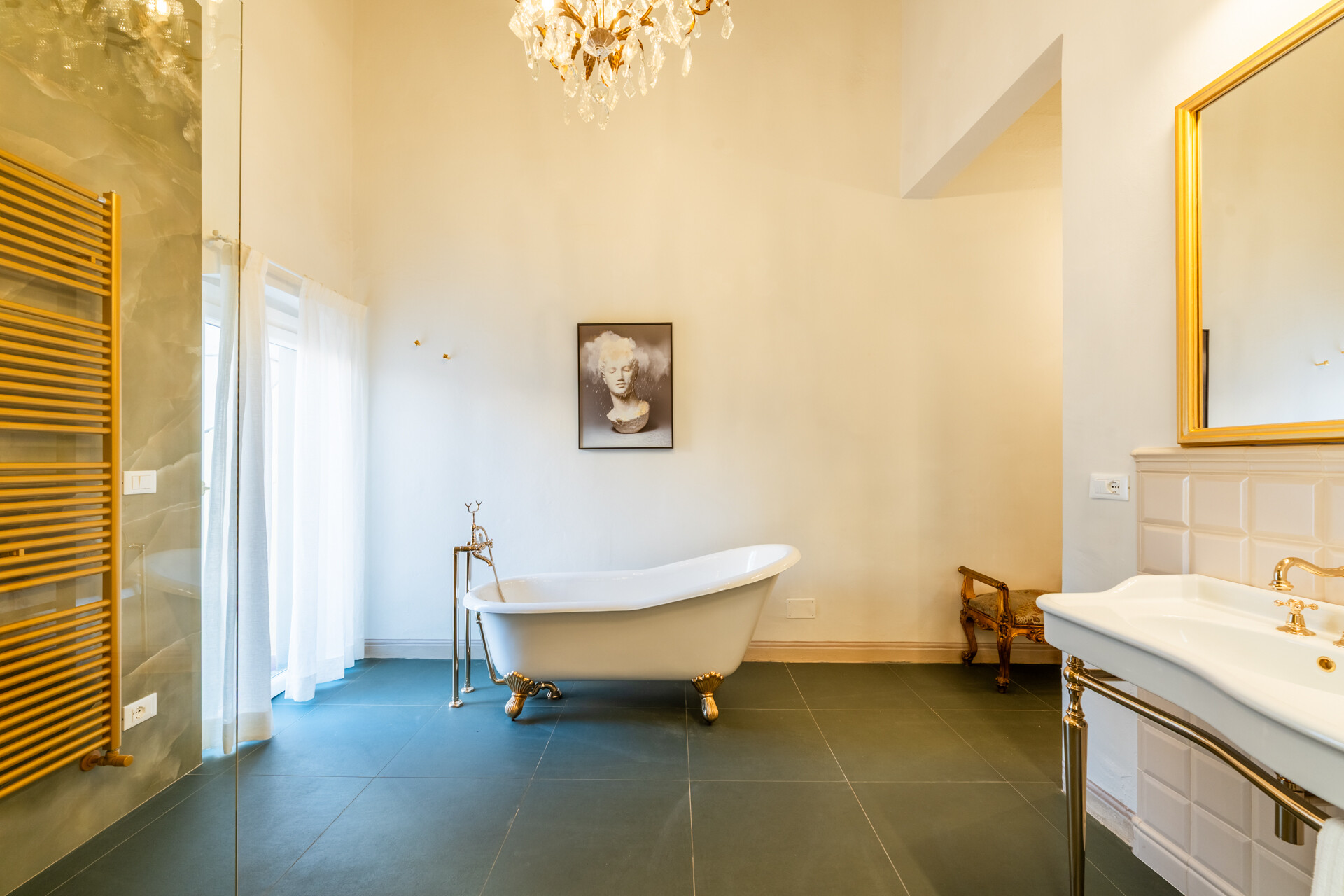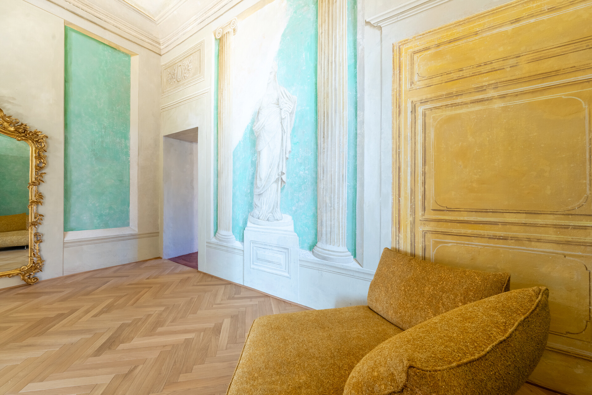 Il soffitto a volta, impreziosito da dettagli in stucco e da morbide linee architettoniche, conferisce agli ambienti un’eleganza senza tempo, esaltata da un lampadario di cristallo che diffonde una luce avvolgente, creando un’atmosfera sofisticata e accogliente.