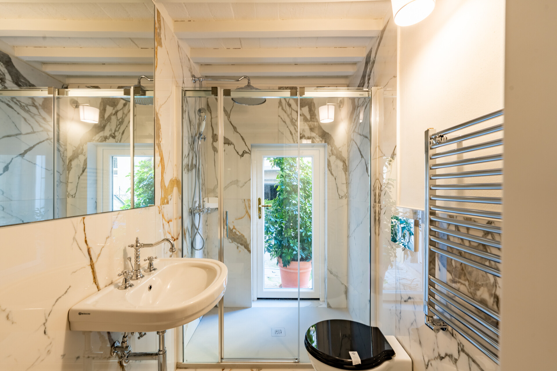 La dimora comprende due terrazze con affacci sui pittoreschi tetti della città, un cortile interno privato con posto auto e un garage, una rarità per il centro storico.