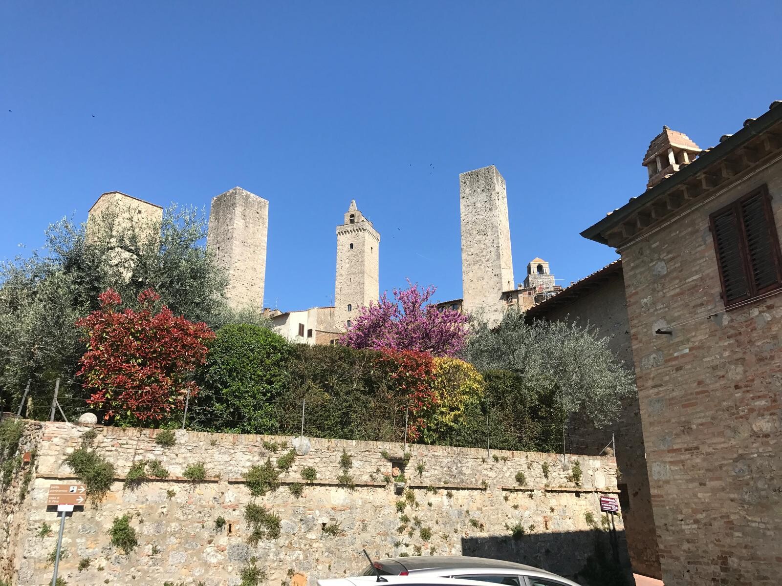 Il giardino, rarissimo da trovare all'interno delle antiche mura del centro storico, invita alla sosta per godere del magnifico panorama costellato da colline rigogliose e vigneti ed uliveti a perdita d'occhio ma è soprattutto la vista delle famose Torri che ci entusiasma maggiormente, guardandole dal giardino infatti, sembra quasi di toccarle con mano.
