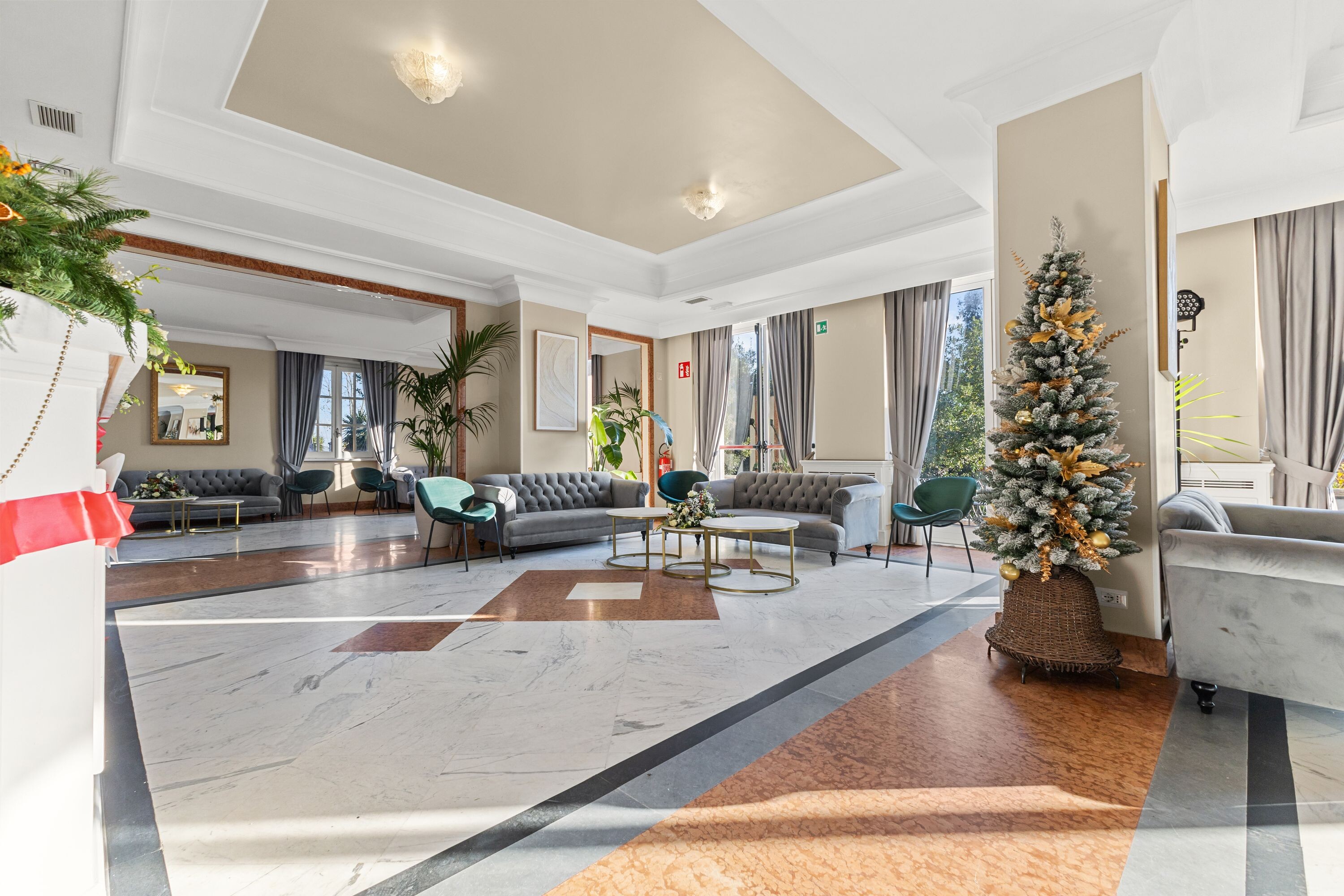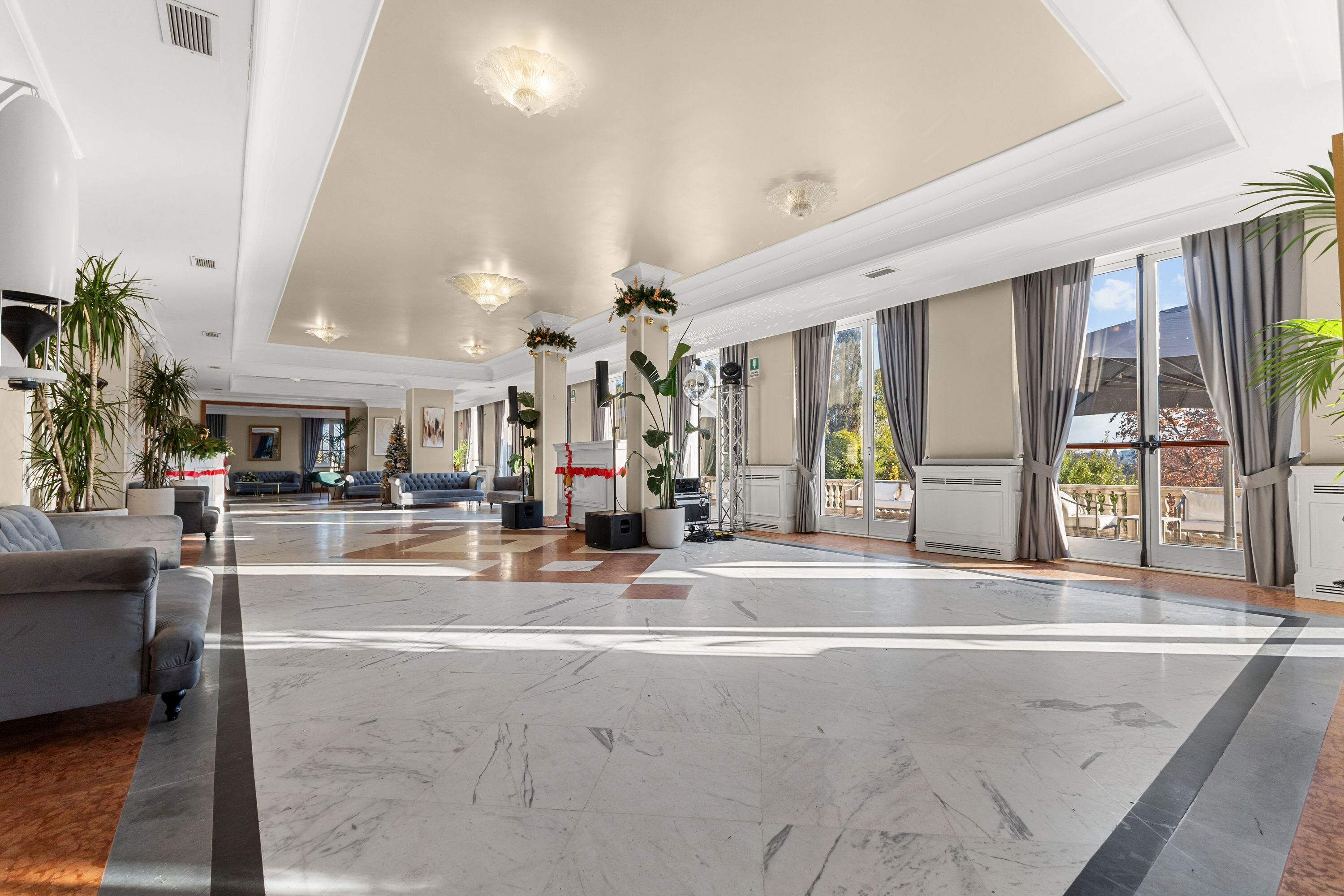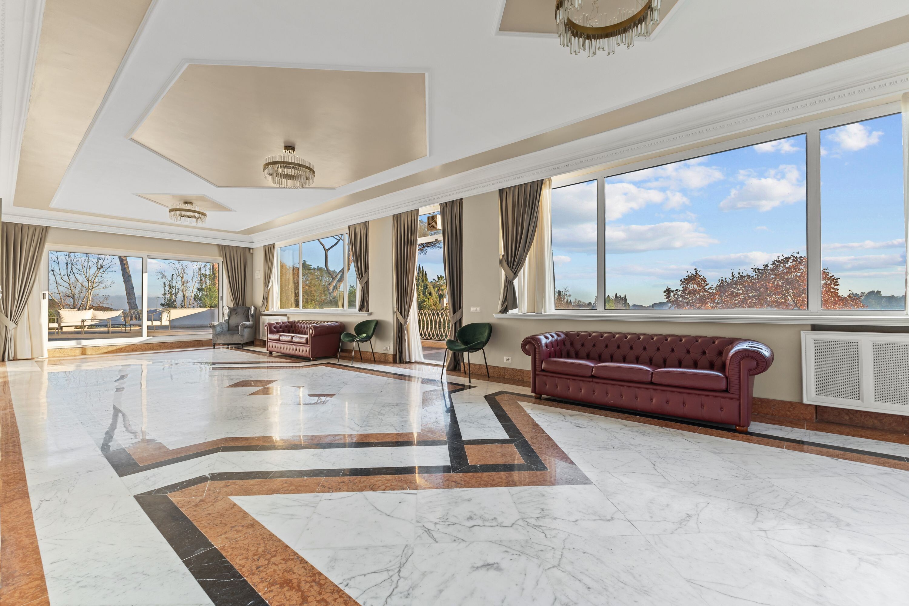 Accoglie due saloni di grande rappresentanza, impreziositi da ampie vetrate con affacci sui giardini terrazzati, oltre a un terzo salone con terrazza panoramica, ideale per momenti di convivialità, ricevimenti e aperitivi esclusivi.