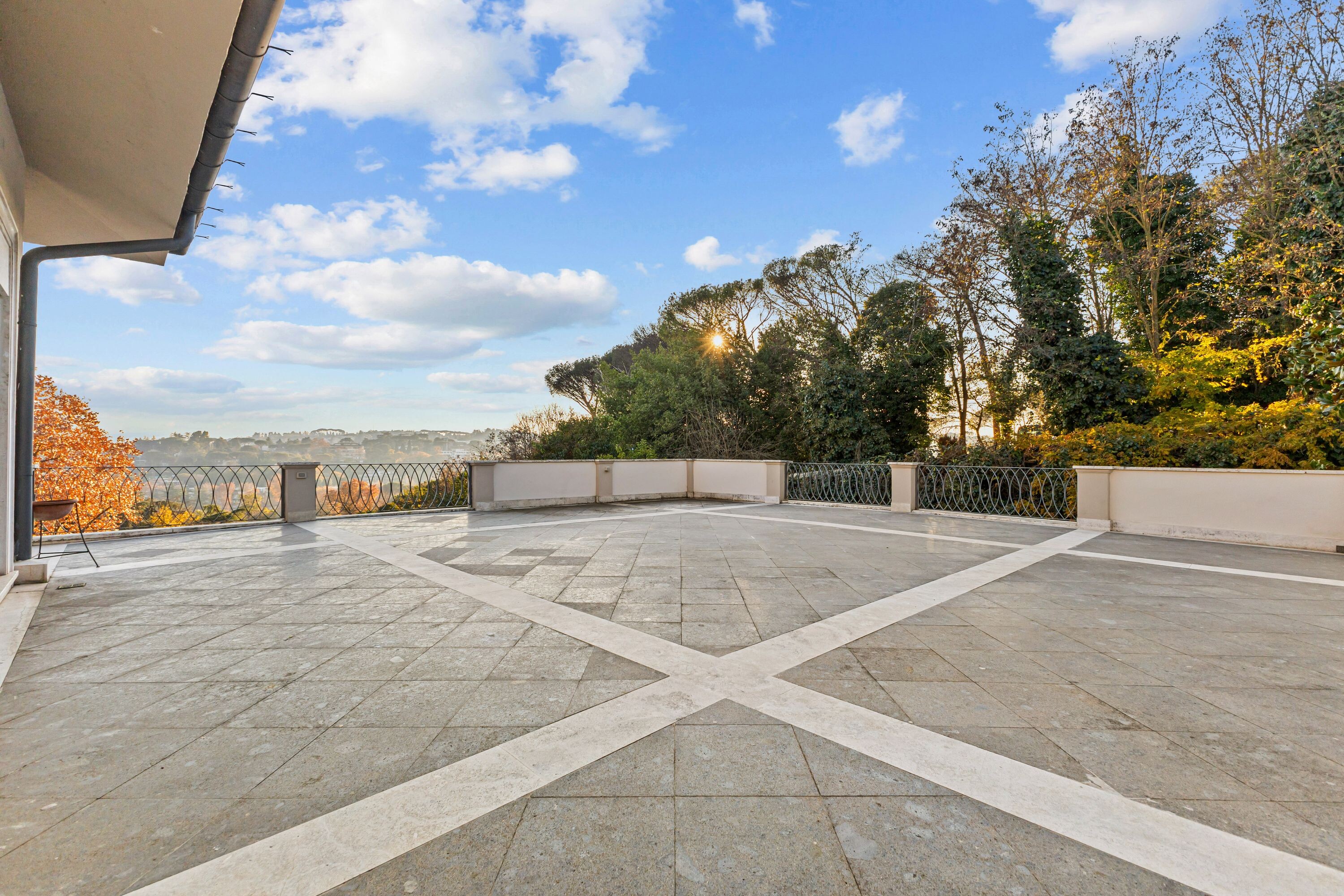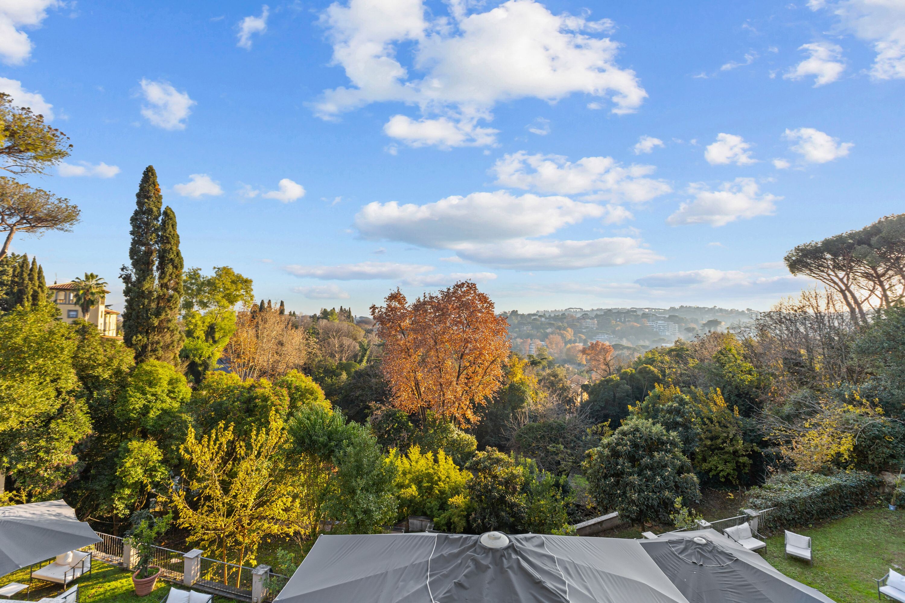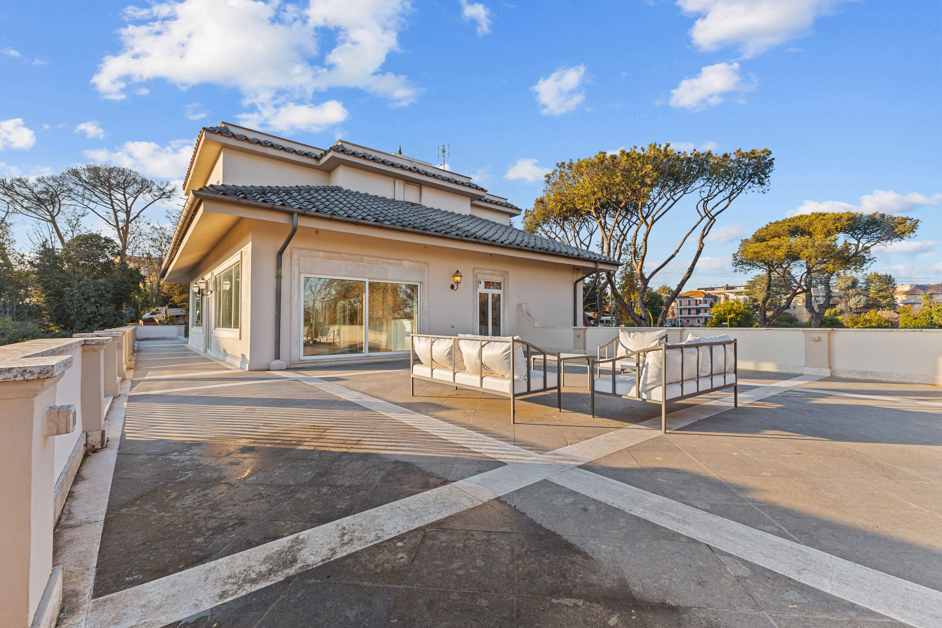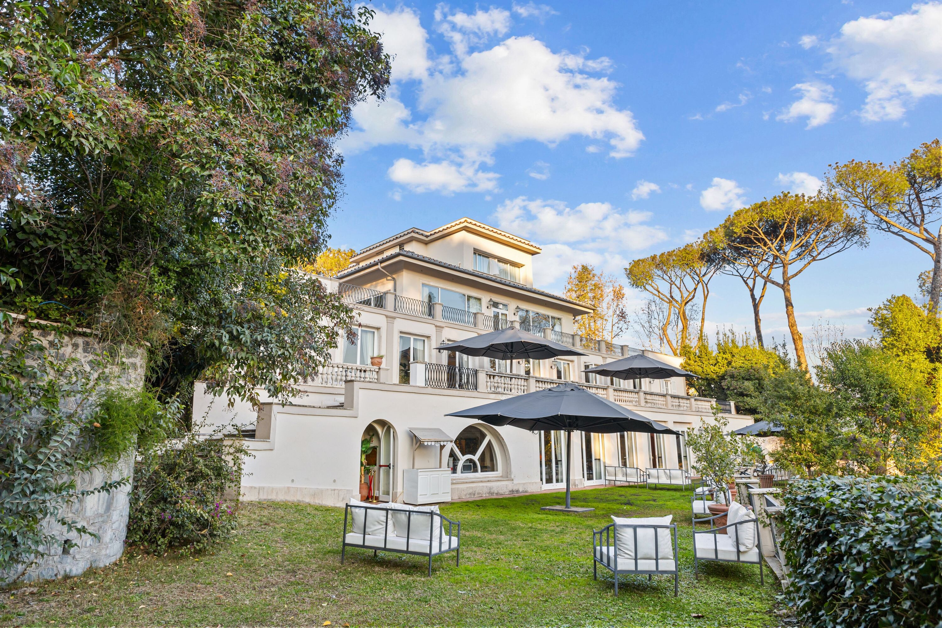 In posizione dominante, a pochi passi da Piazza dei Giuochi Delfici, sorge una prestigiosa villa di rappresentanza immersa nel verde di un parco privato.