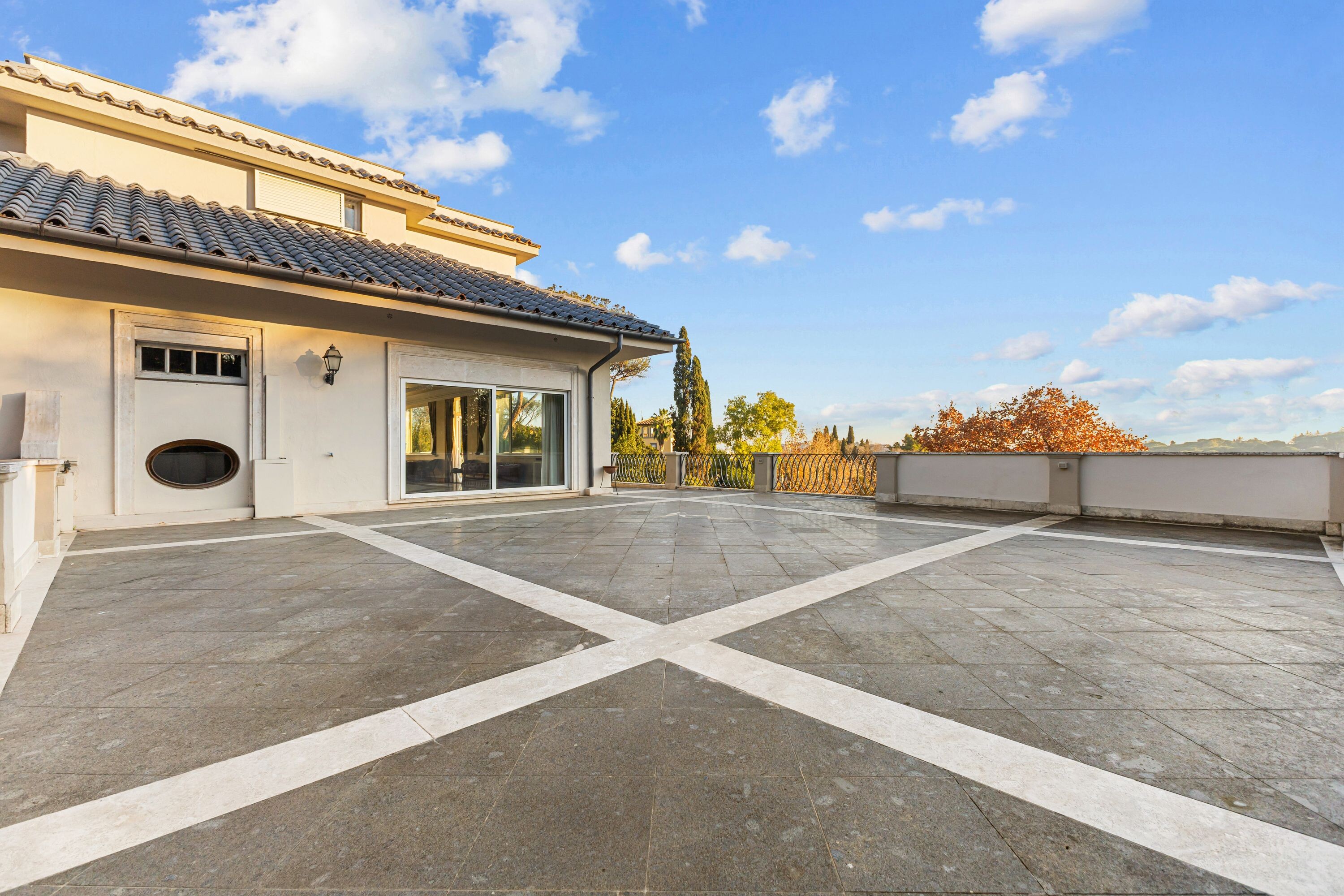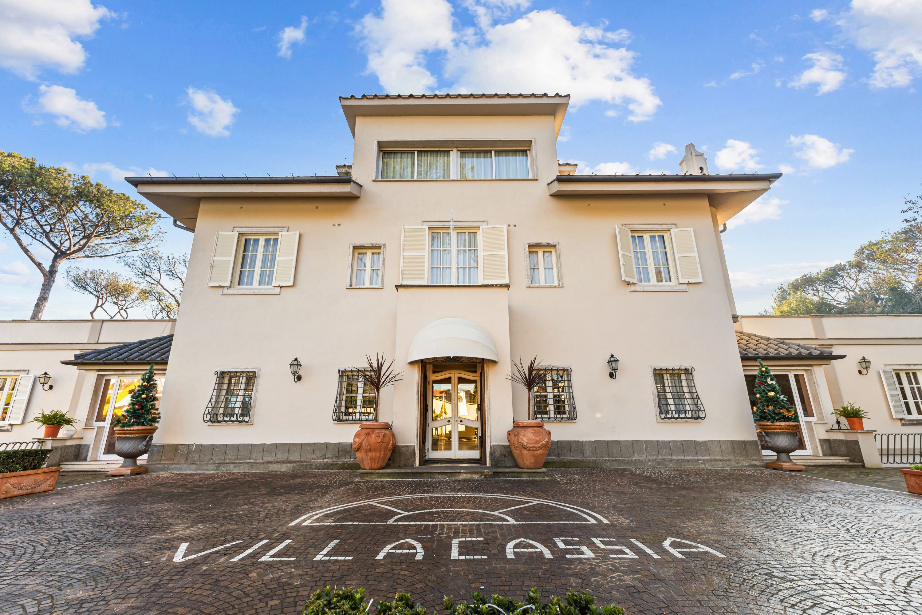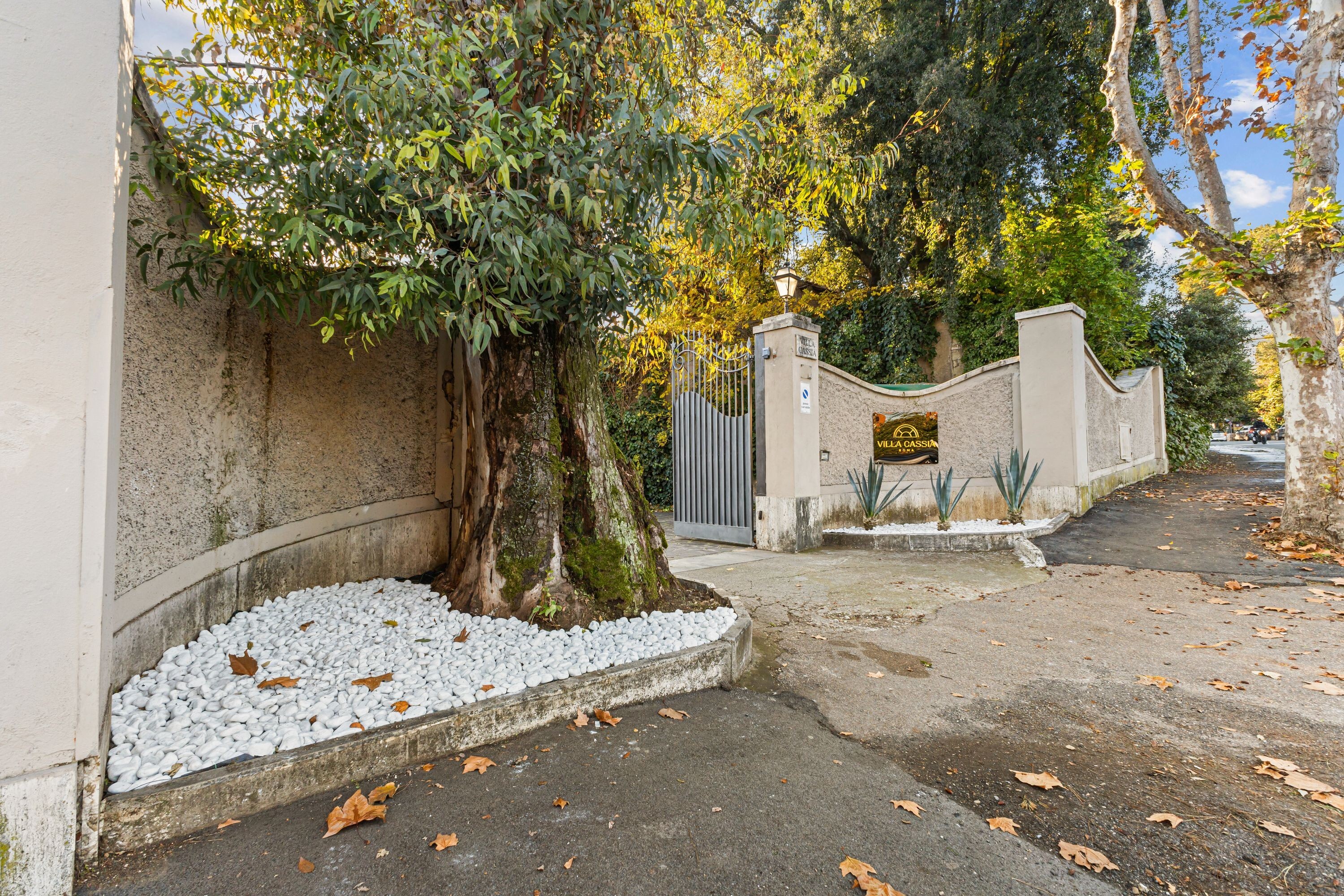 La villa dispone di un ampio parcheggio e di due ingressi principali direttamente da Via Cassia, oltre a un terzo ingresso riservato dal giardino, assicurando praticità, flessibilità e massima riservatezza.