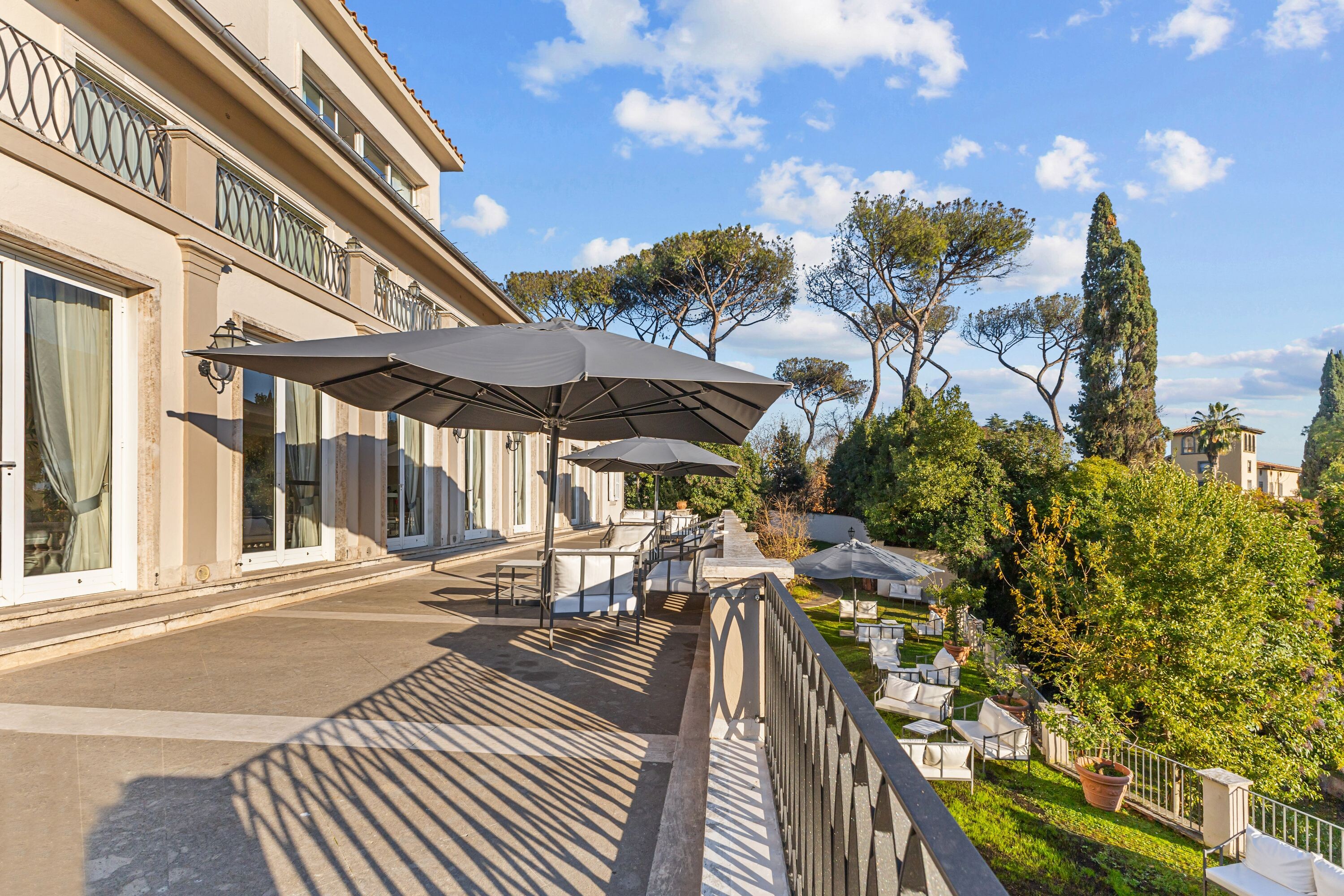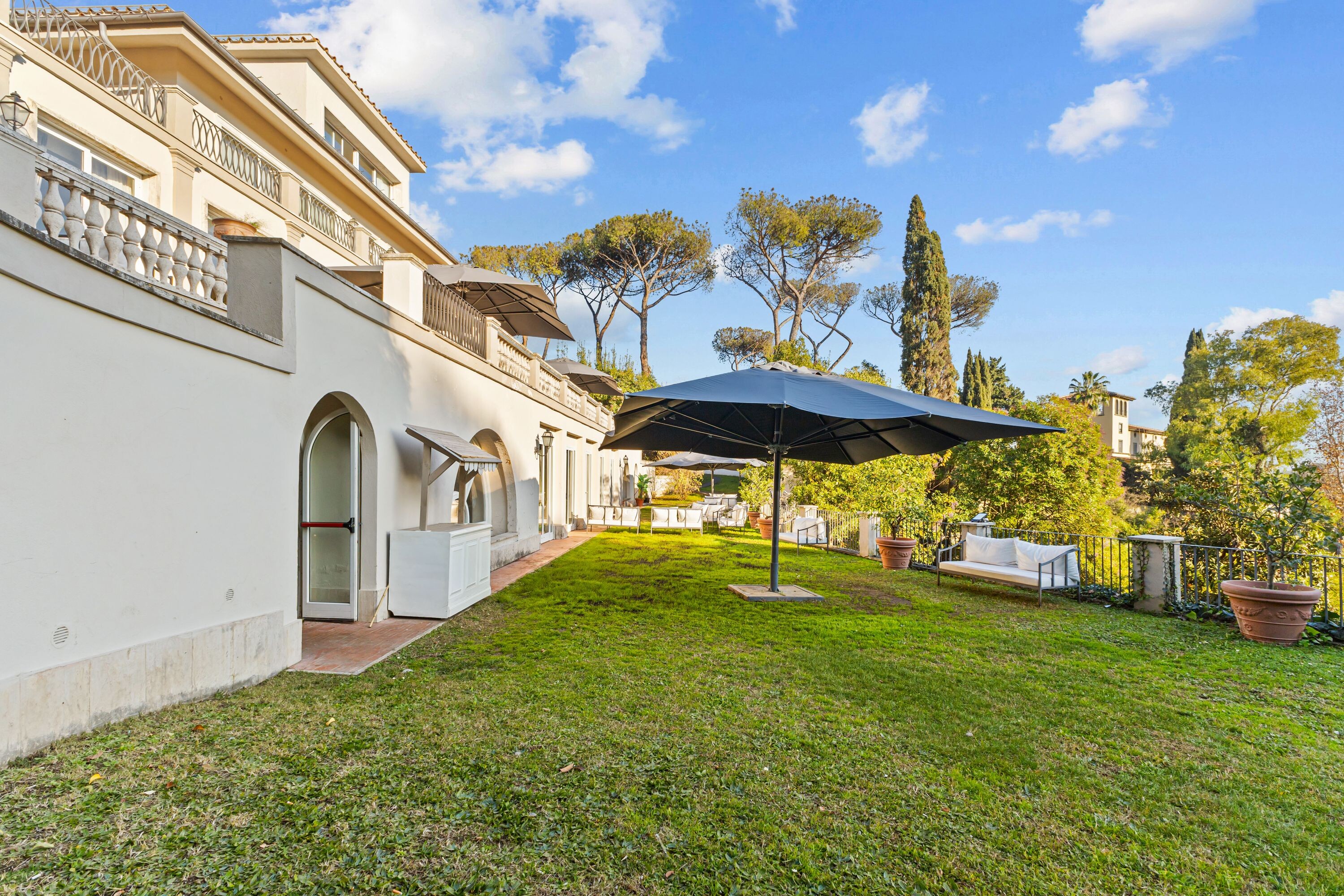 Le sale principali si aprono su spazi esterni sapientemente curati, immersi nel verde, dai quali si gode di una vista panoramica di straordinaria bellezza.