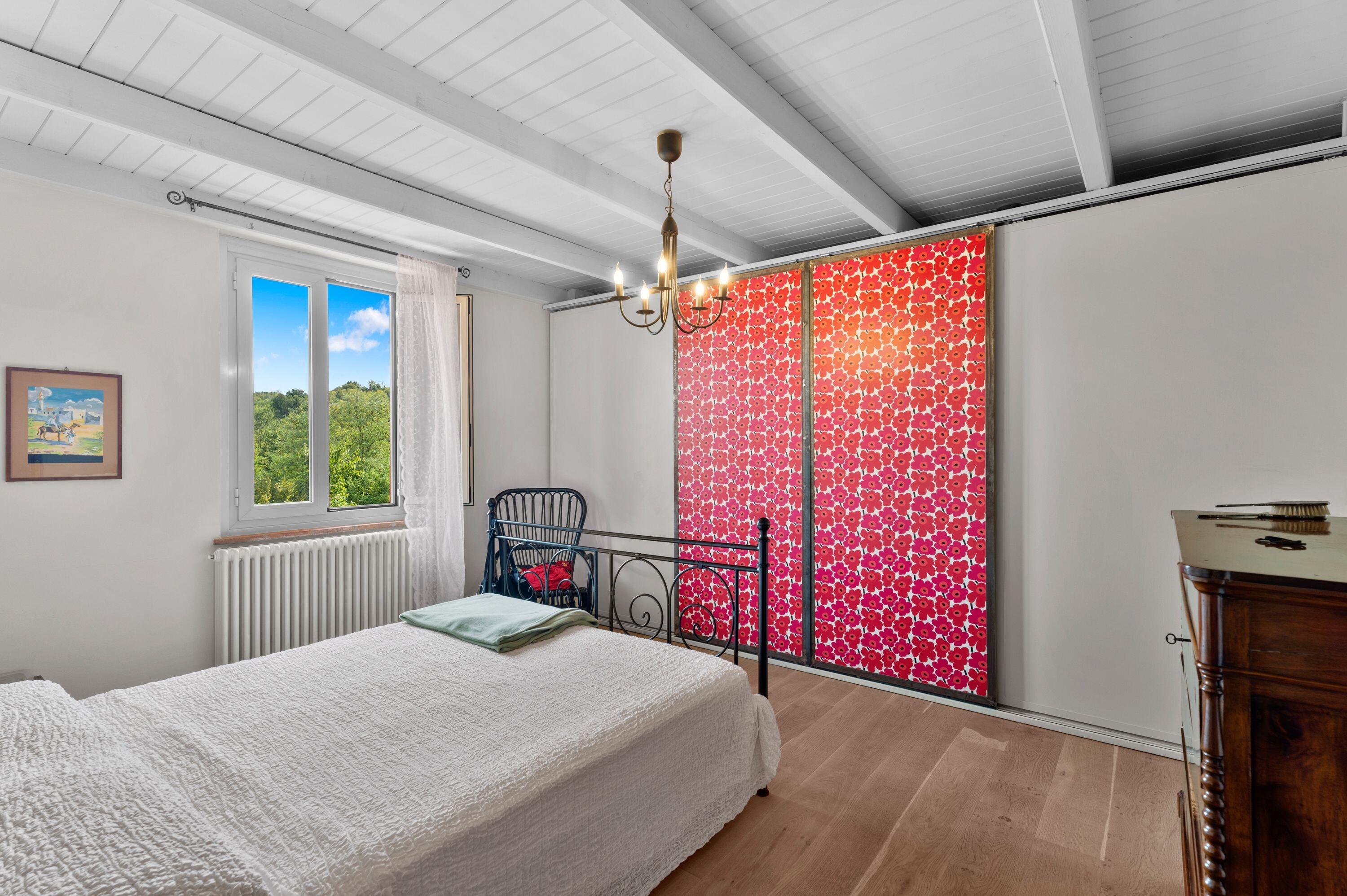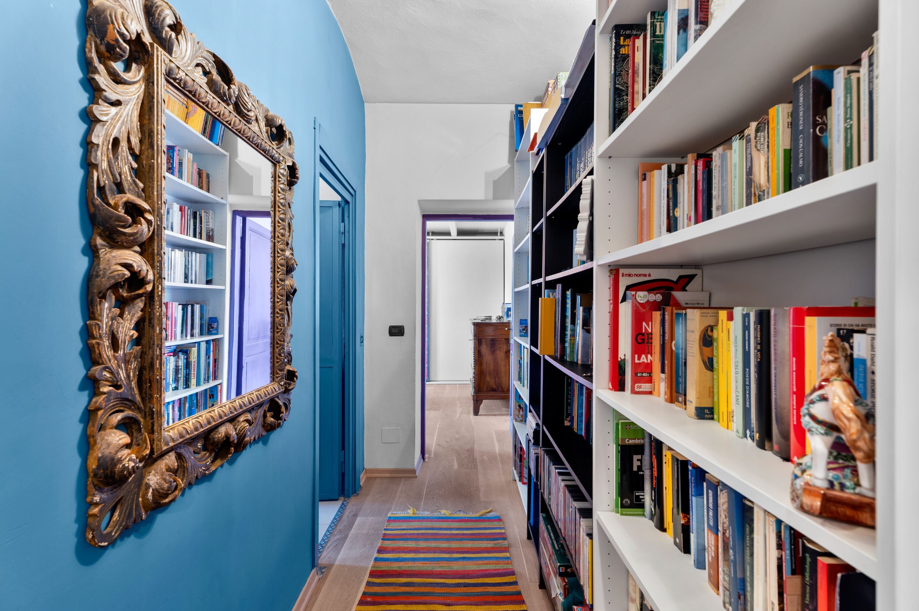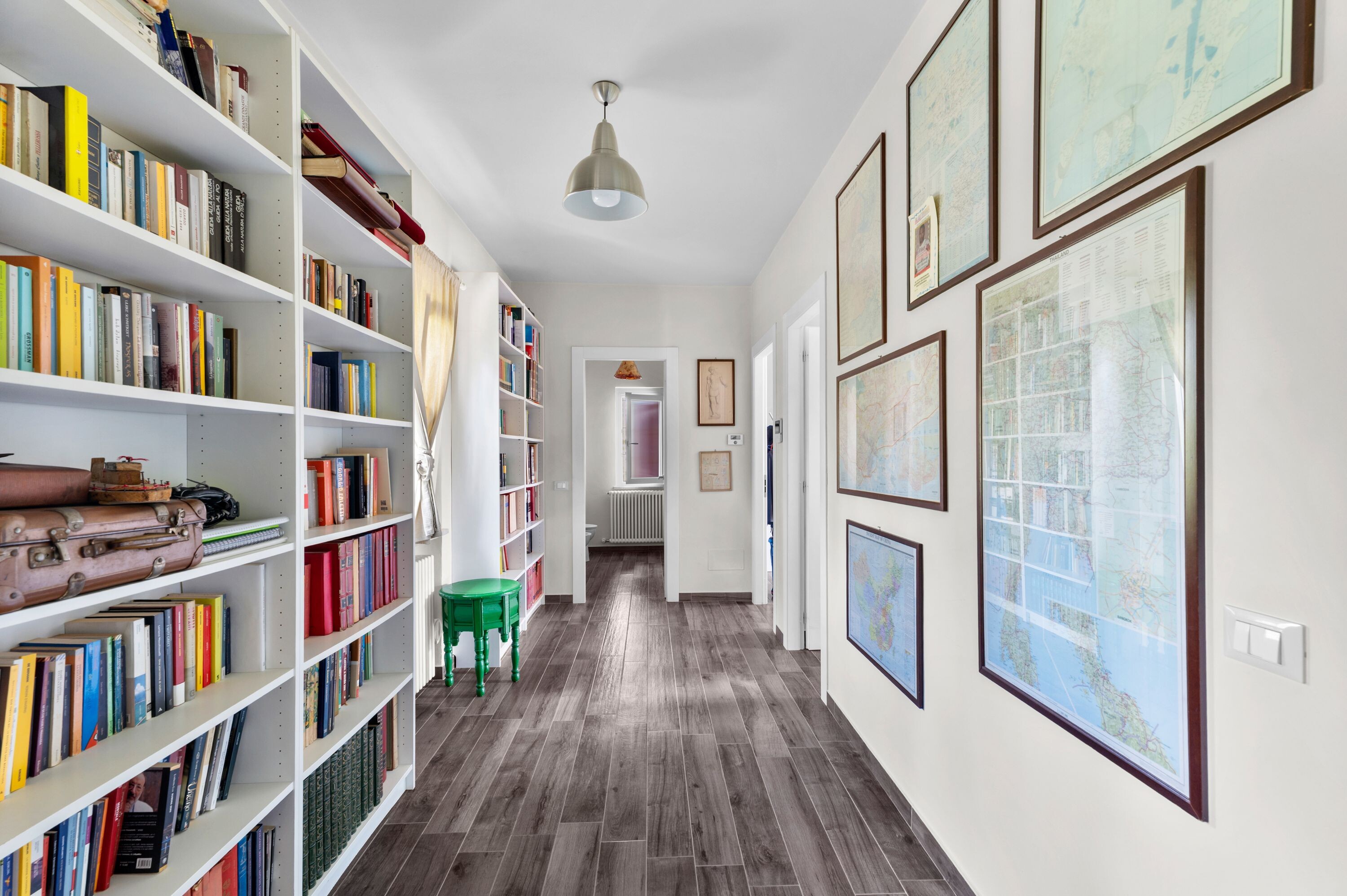 Going up to the second floor, there are two perfectly independent sleeping areas. On one side are two large bedrooms both with balconies, disengaged by a library area and a bathroom. The other wing leads to the master bedroom with walk-in closet, a second very bright room and bathroom. Each room is tastefully furnished with typical flavor details.