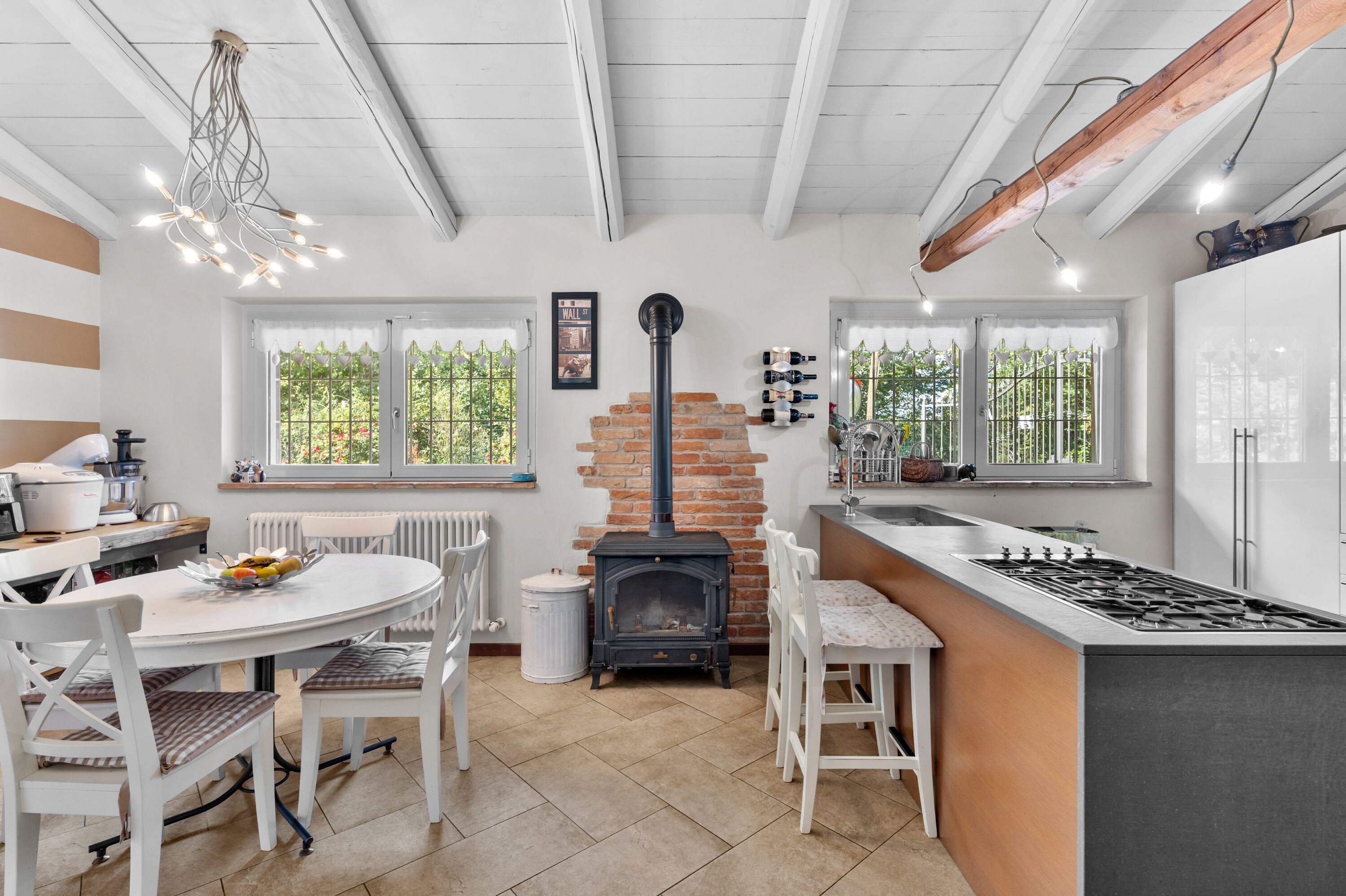 Originally the farmhouse was divided into two separate units, and two entrances have remained as a distinguishing feature, allowing it to maintain independence. The first entrance leads into the large open living room, overlooking the garden, which the current owners use as an office with adjoining show room. The second entrance opens onto the dining room, which, thanks to expertly restored typical elements, conveys a warm yet modern atmosphere. A hallway leads to the large kitchen with dining area that is the real centerpiece of the house, beautiful the idea of cooking while friends chat wrapped in the warmth of the stove. A bathroom with shower completes the living area.