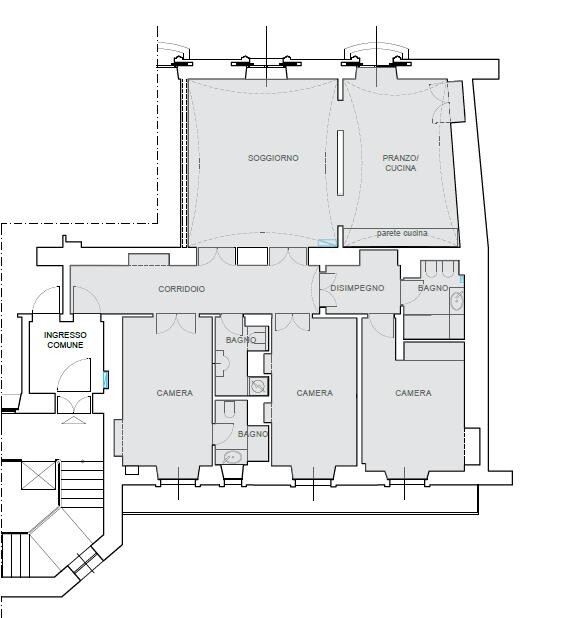 The property will be delivered completely renovated to new and is distinguished by an elegant and functional distribution of space: entrance hall, large and bright living room with small balcony overlooking Via Pietro Micca, spacious kitchen, three bedrooms and three bathrooms, two of which are en suite.
