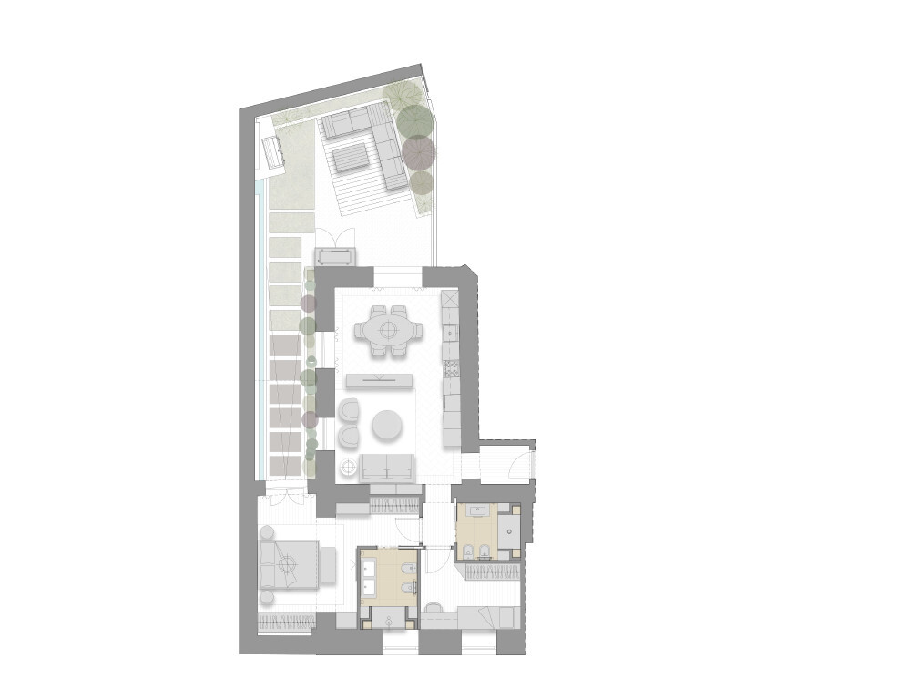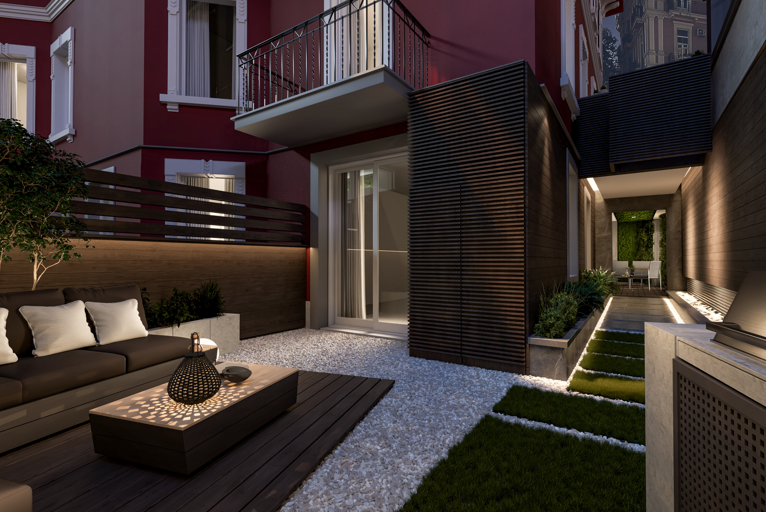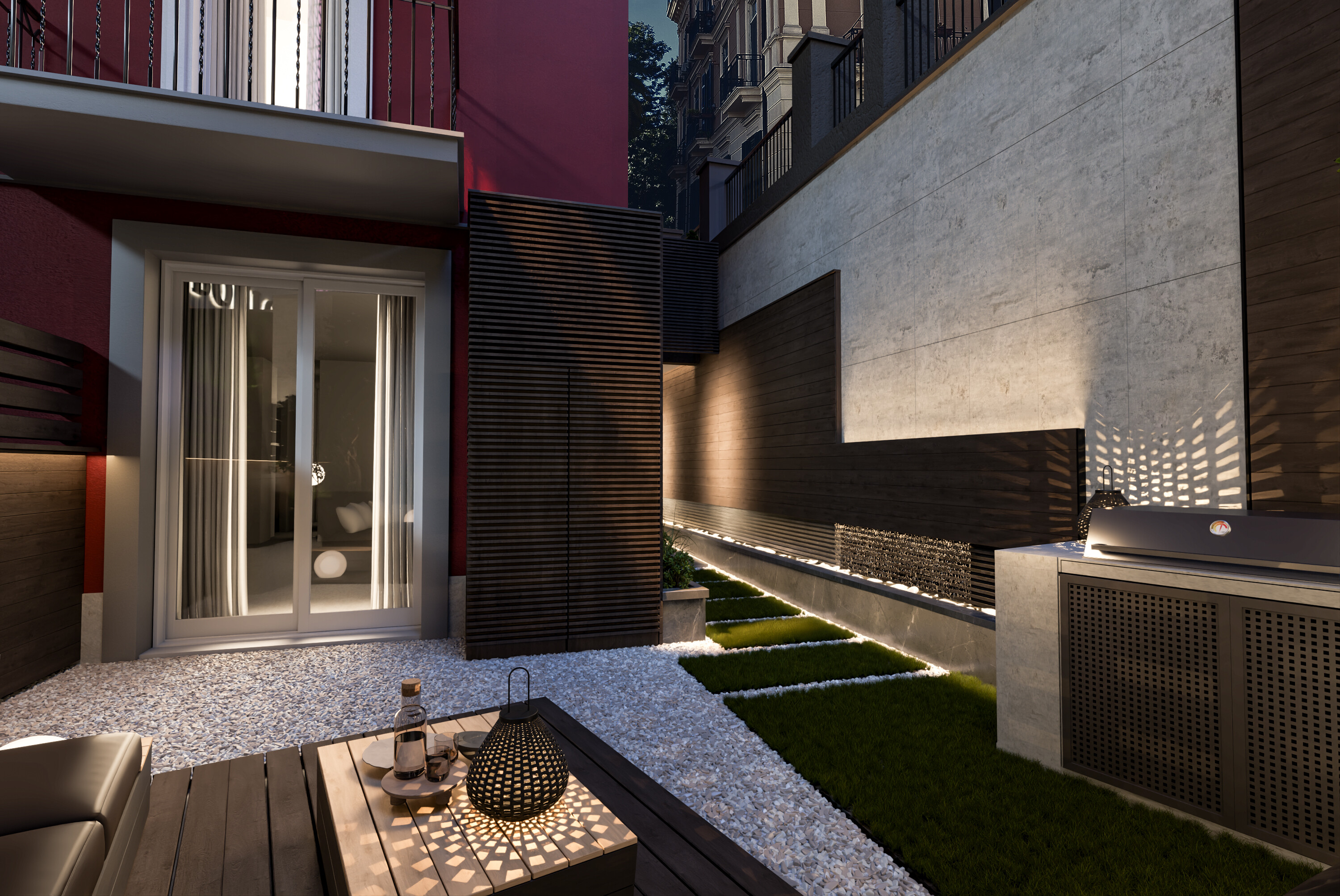 We propose a three-room apartment of about 104 sqm with private garden of 53 sqm, located in an exclusive and quiet context. The apartment consists of large living room with open kitchen and access to the garden, master bedroom with en suite bathroom, second bedroom and second bathroom.