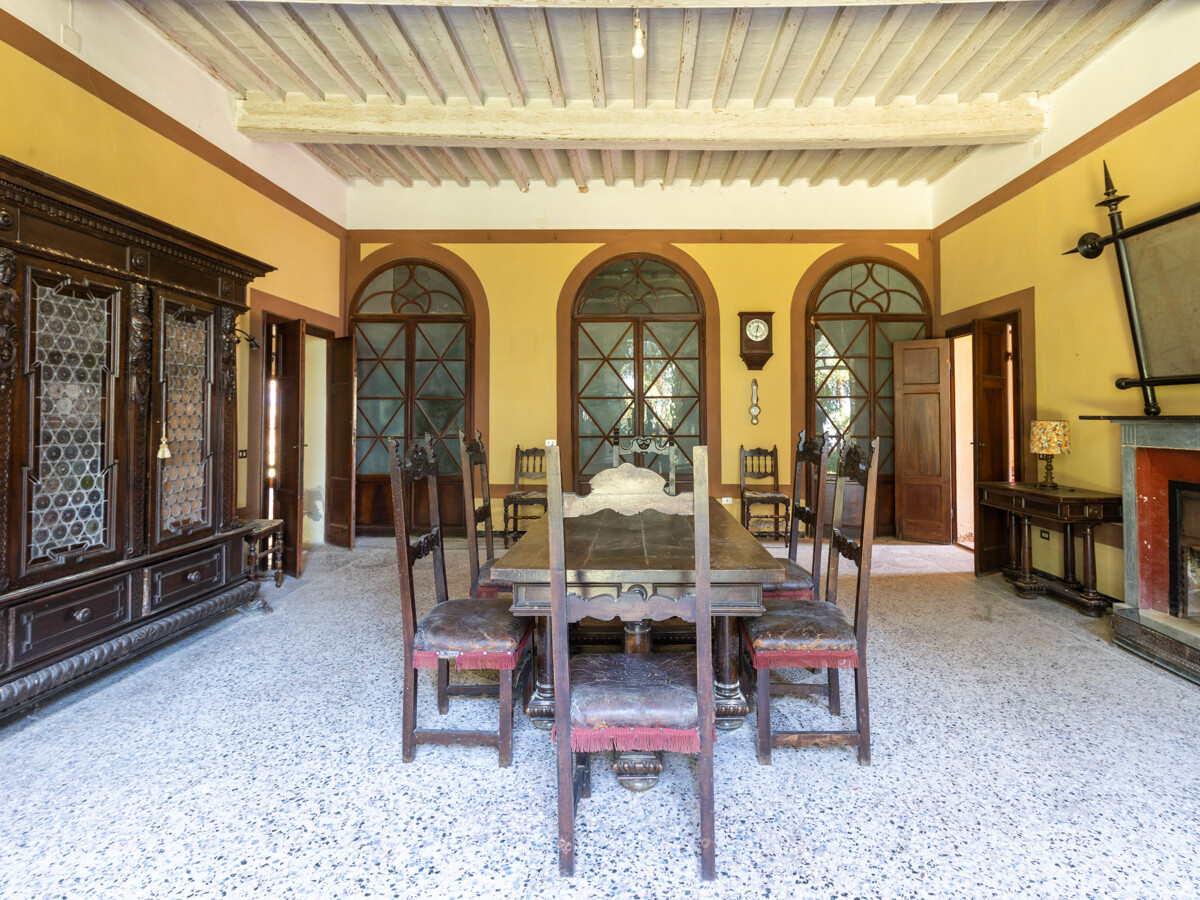 Al piano terra l'ingresso porta in un ampio salone con pavimenti originali a mosaico: le porte dei quattro locali attigui si affacciano su questo ampio locale e ospitano la sala da pranzo, la cucina, il salotto ed uno studio.