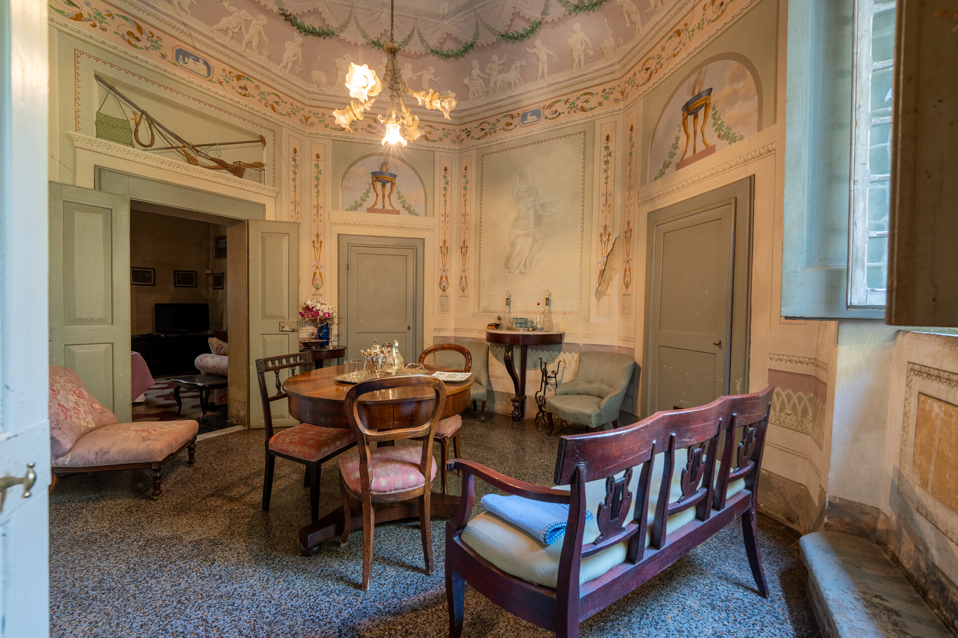 La villa principale, in stile tipicamente Neoclassico, offre degli affreschi originali dell'epoca nelle stanze del piano nobile, dove si trovano le sale di ricevimento. Al piano terra si trova l'antica cucina storica, ancora in uso e perfettamente recuperata mentre al secondo piano le grandi camere con vista sulle dolci colline toscane.
