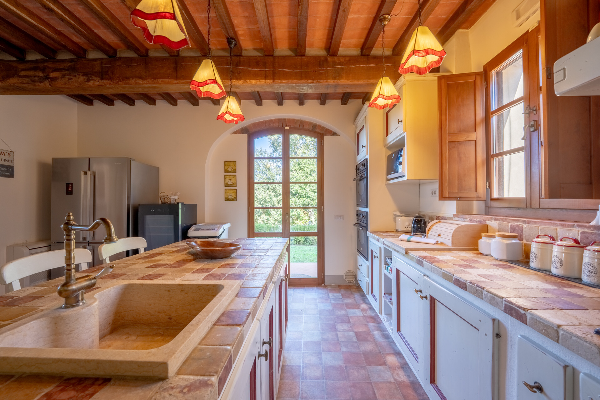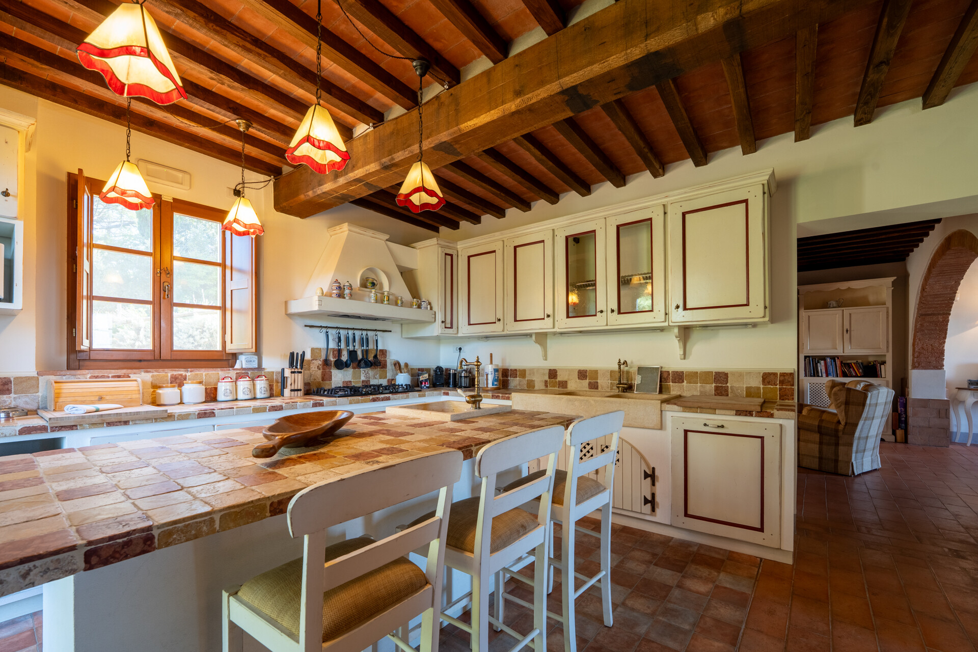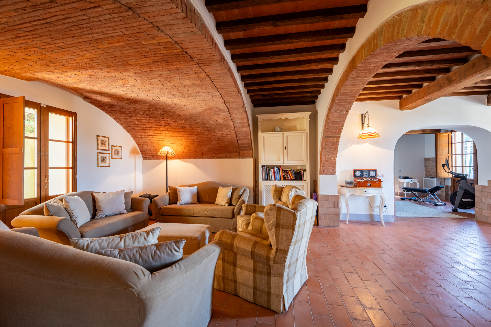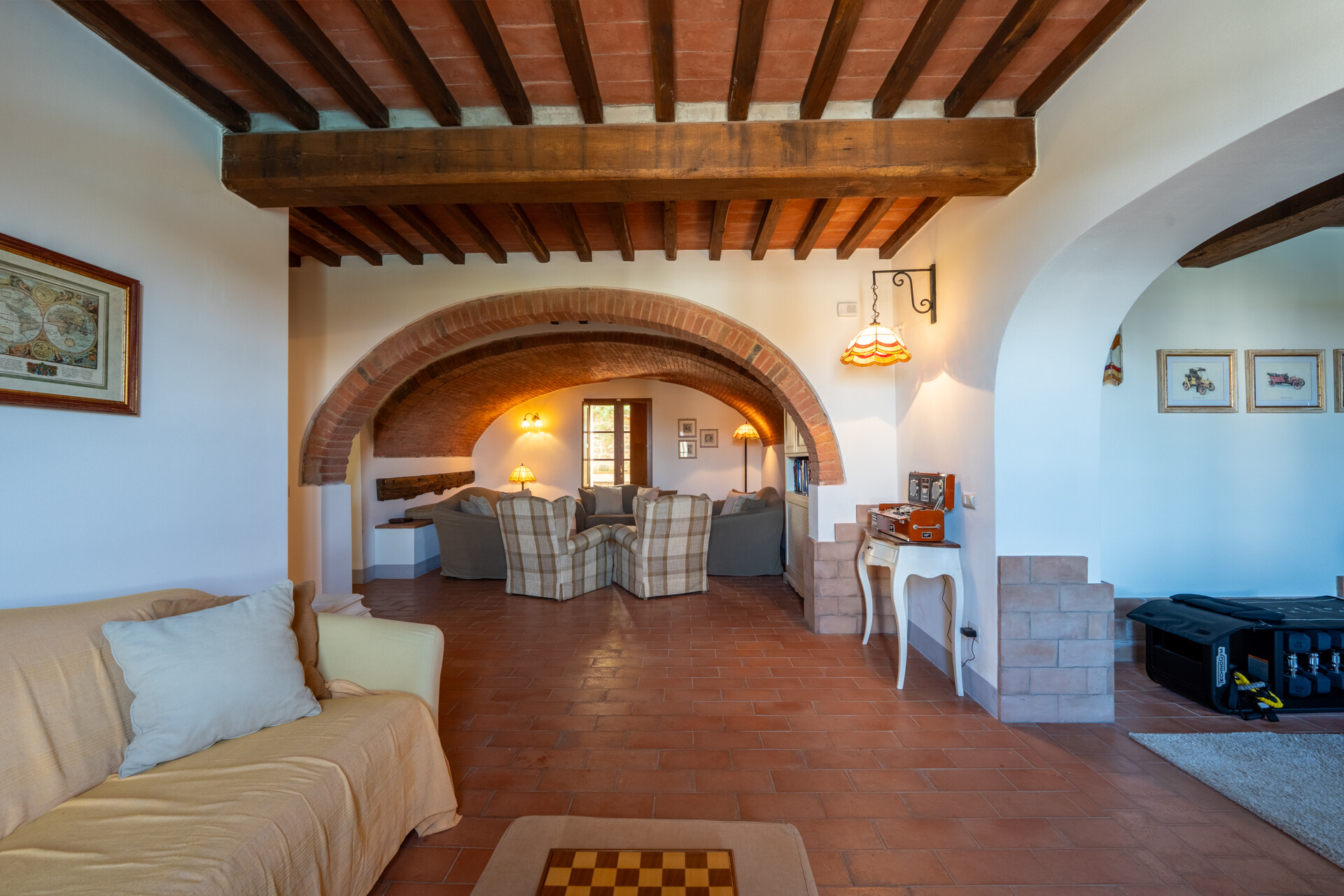 La villa principale, arredata con mobili che si integrano perfettamente nella campagna toscana, ma estremamente eleganti, si svilluppa su due livelli, di cui a piano terra una grande sala accogliente con soffitto a volte, una elegante cucina in tipico stile toscano, un’accogliente sala da pranzo, oltre alla parte lavanderia ed un bagno di cortesia.