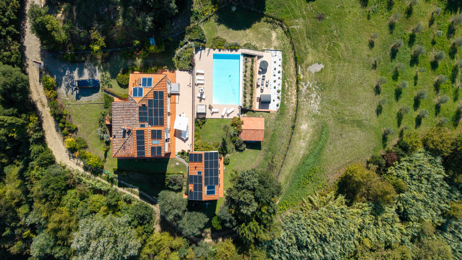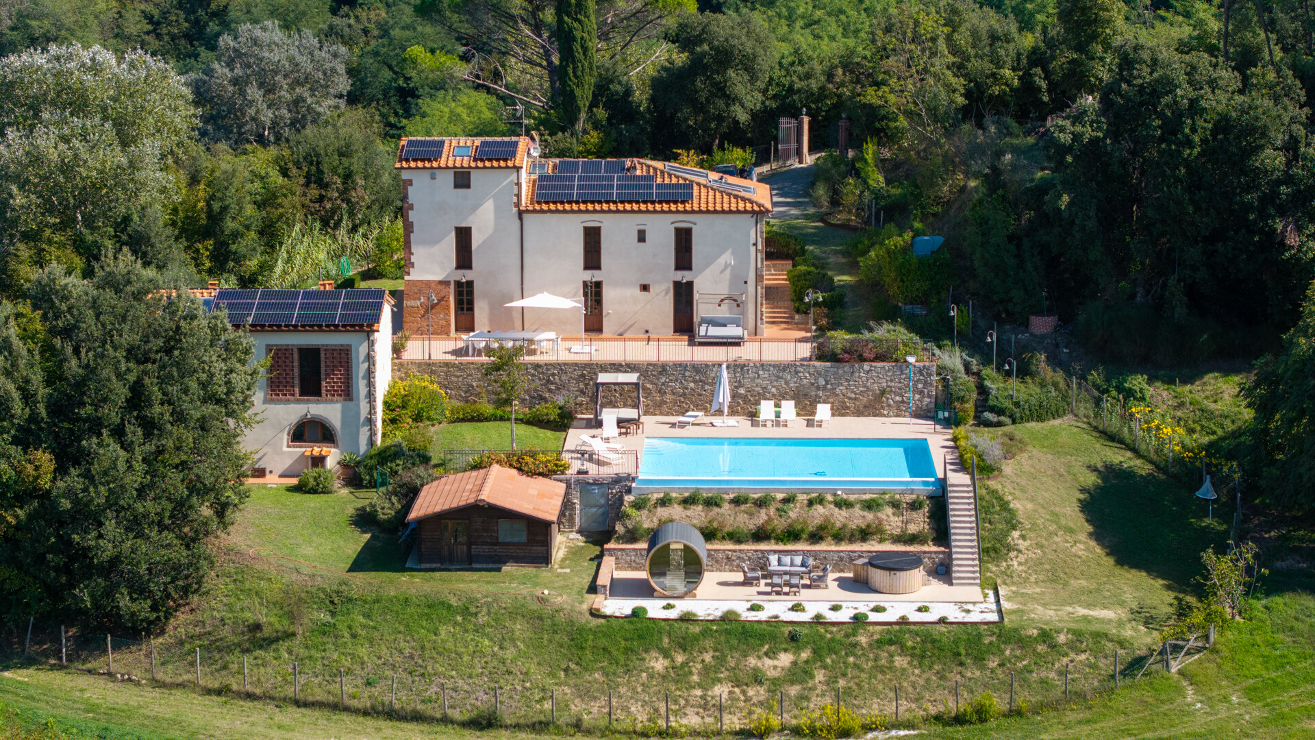 La proprietà, di circa 500 mq, suddivisa in un corpo centrale costituito dall’antico casolare ed una guest house ricavata nell’antico fienile, è circondata da un terreno panoramico di oltre 3 ettari, completamente recintati.