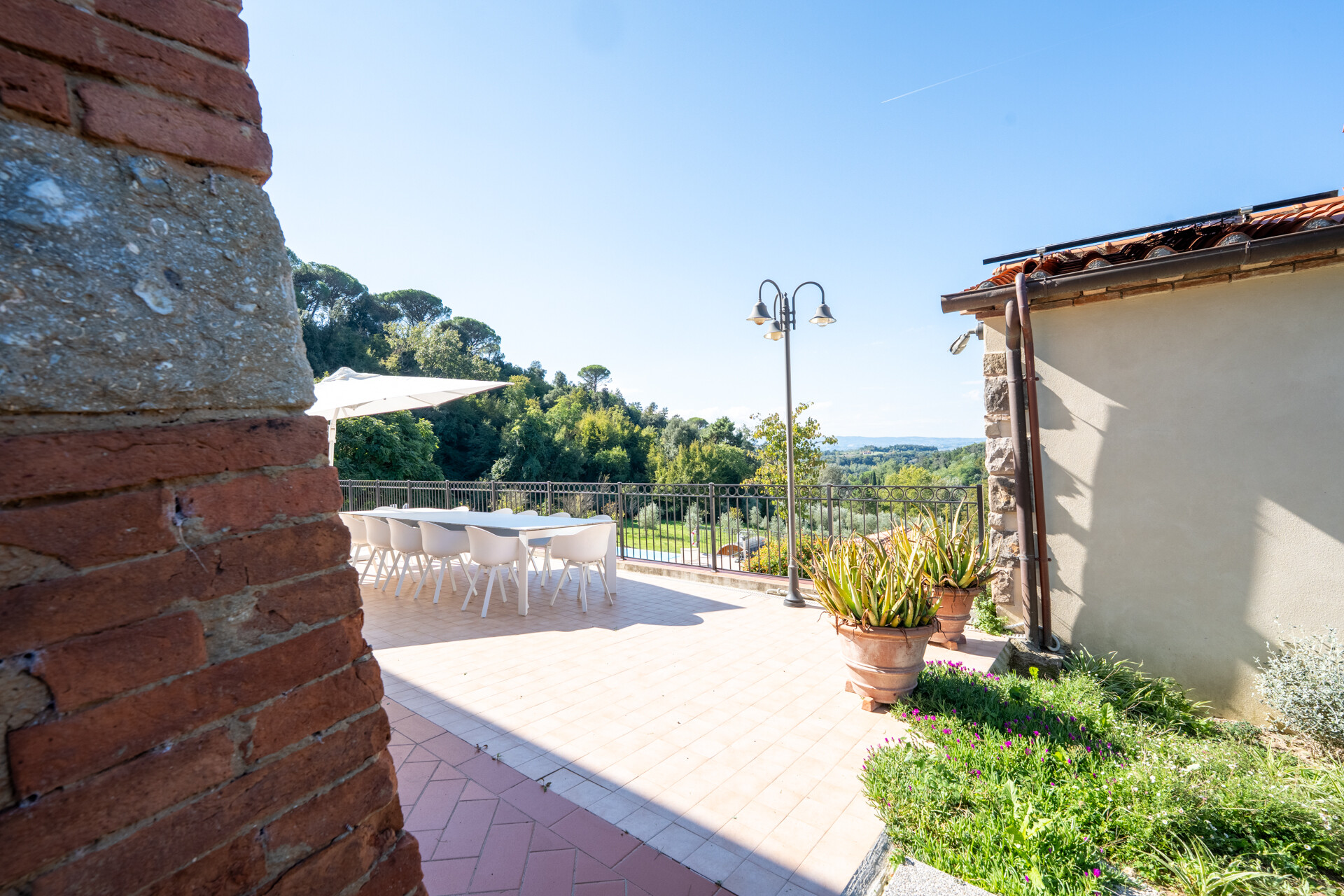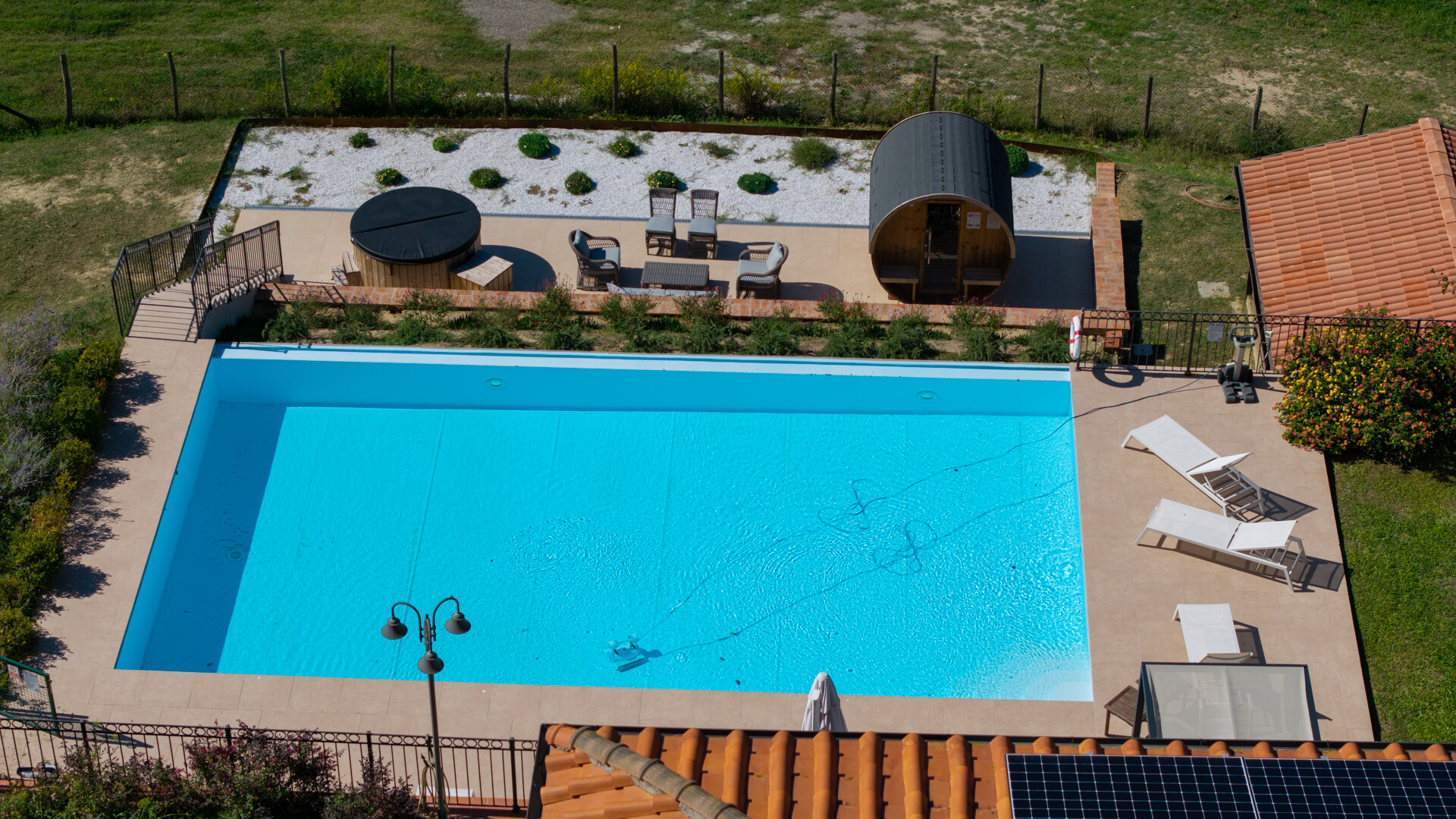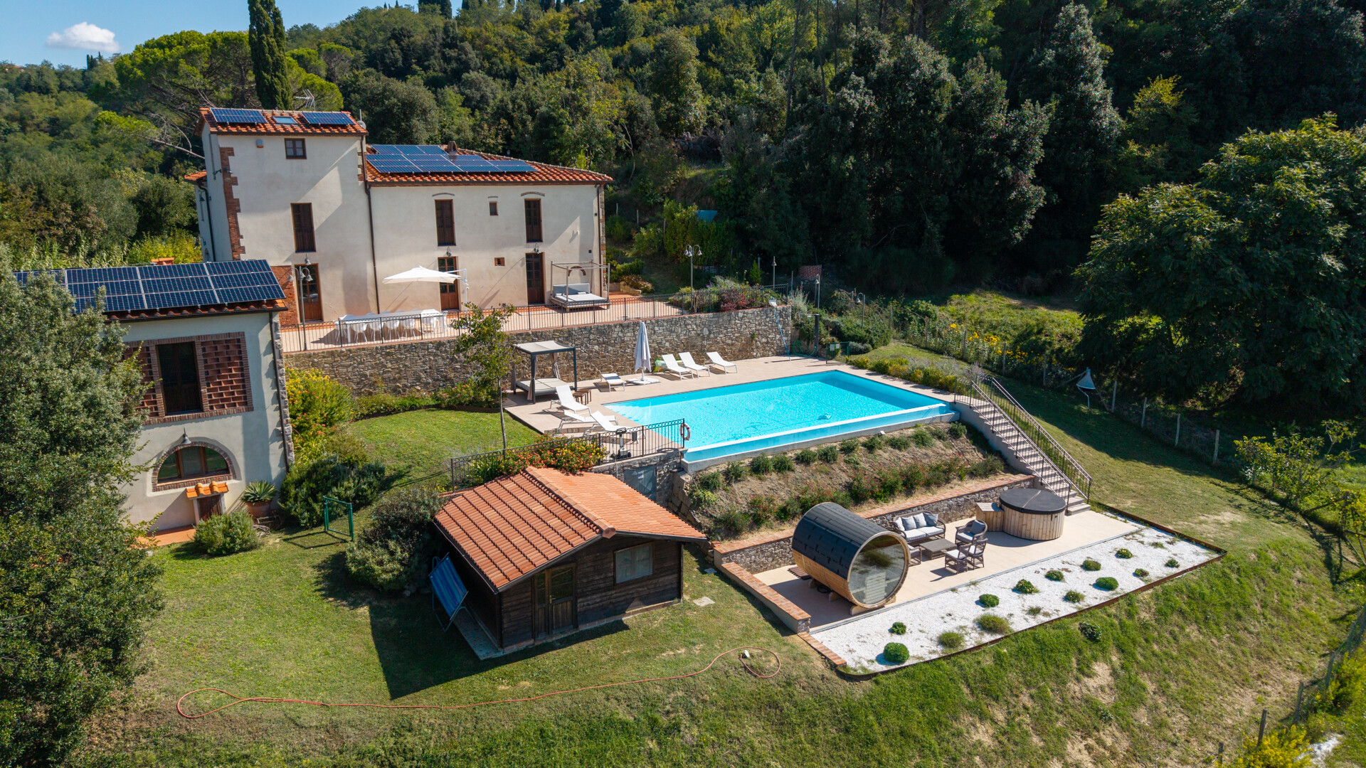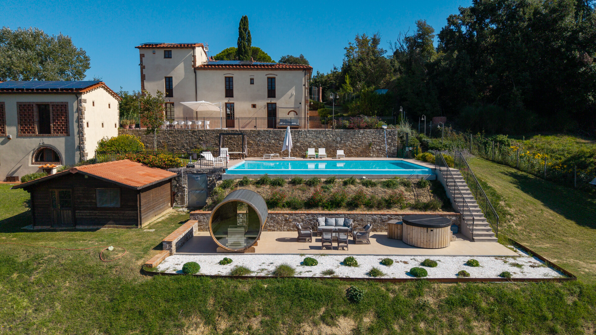 Davanti ad una delle porte della sala, una splendida terrazza con un salotto da esterno e, al di sotto, una grande piscina che si affaccia alla campagna in posizione di estrema privacy, dove poter organizzare delle splendide giornate per godersi il caldo sole della Toscana.